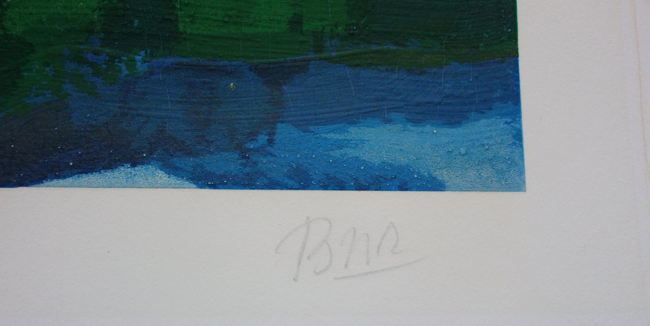 | Links onder en rechtsboven zitten wat kreukeltjes in de hoek (witte vlak). Bij inlijsting vallen deze onder het passe-partout. Werk heeft ingelijst gezeten want is heel licht verkleurd binnen de randen van het oude passe-partout, goed ingelijst met nieuw passe-partout valt dit niet meer op. Door de dikke verf die gebruikt is zit er licht craquelé in de voorstelling. | |