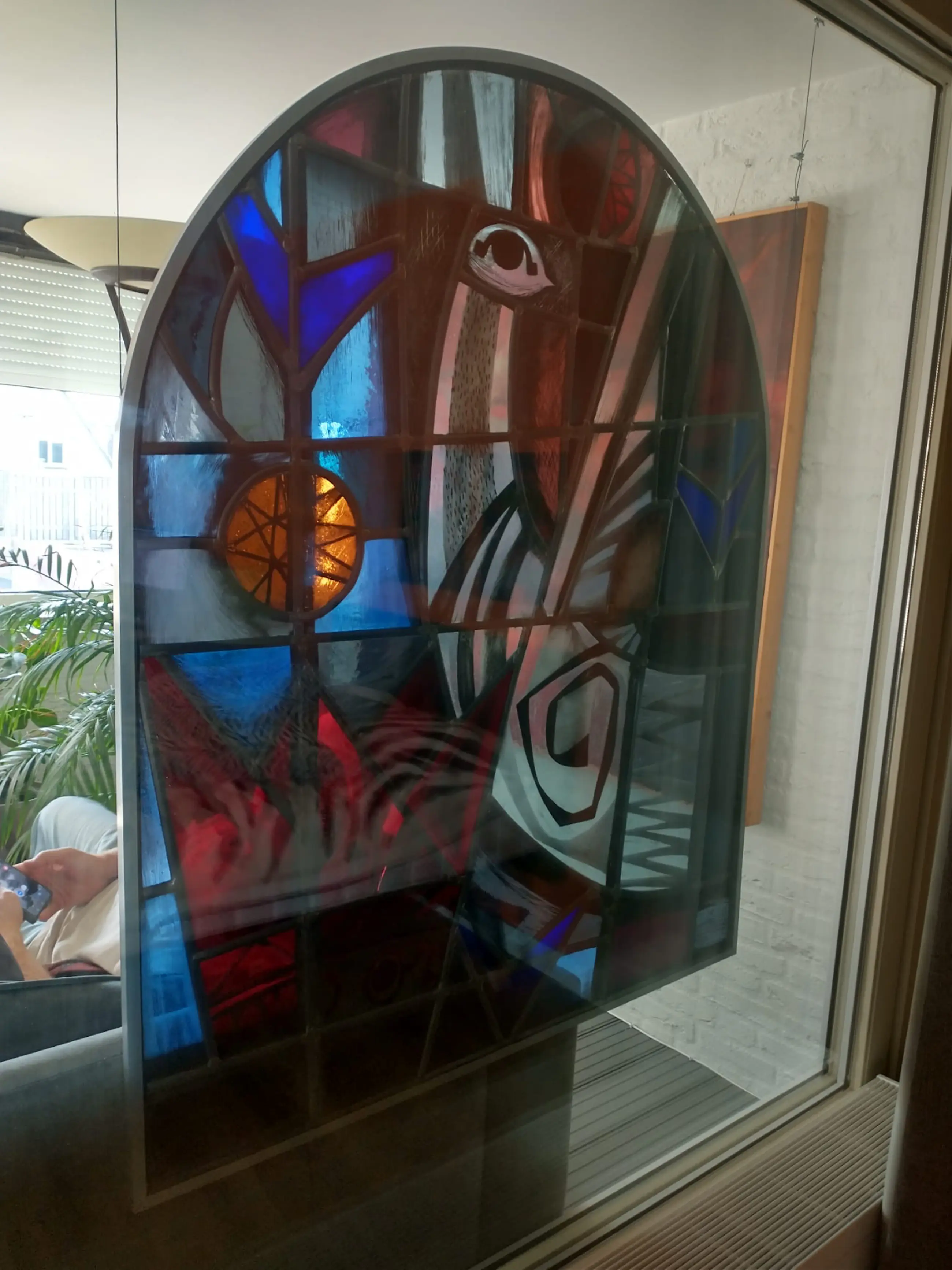 Prachtig glas in lood raam duif en kroon. Afkomstig uit de inmiddels gesloopte st. Jozef kerk in Breda.
