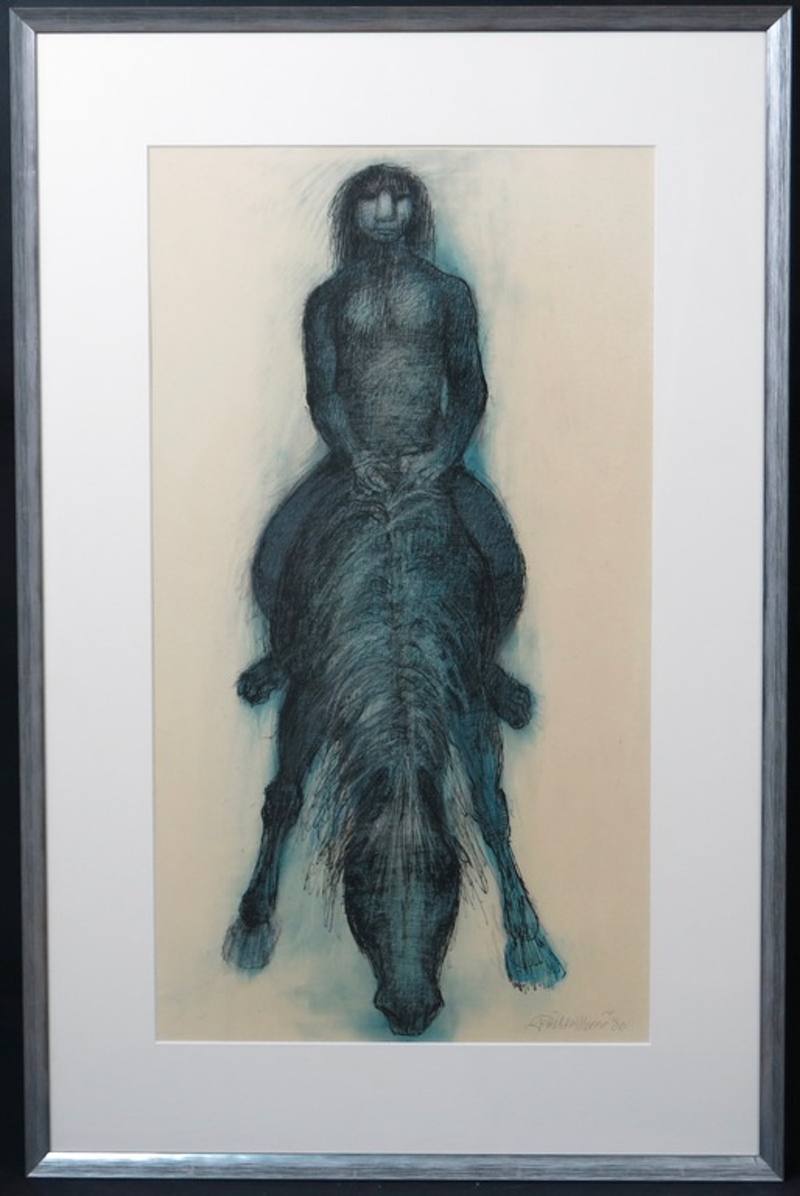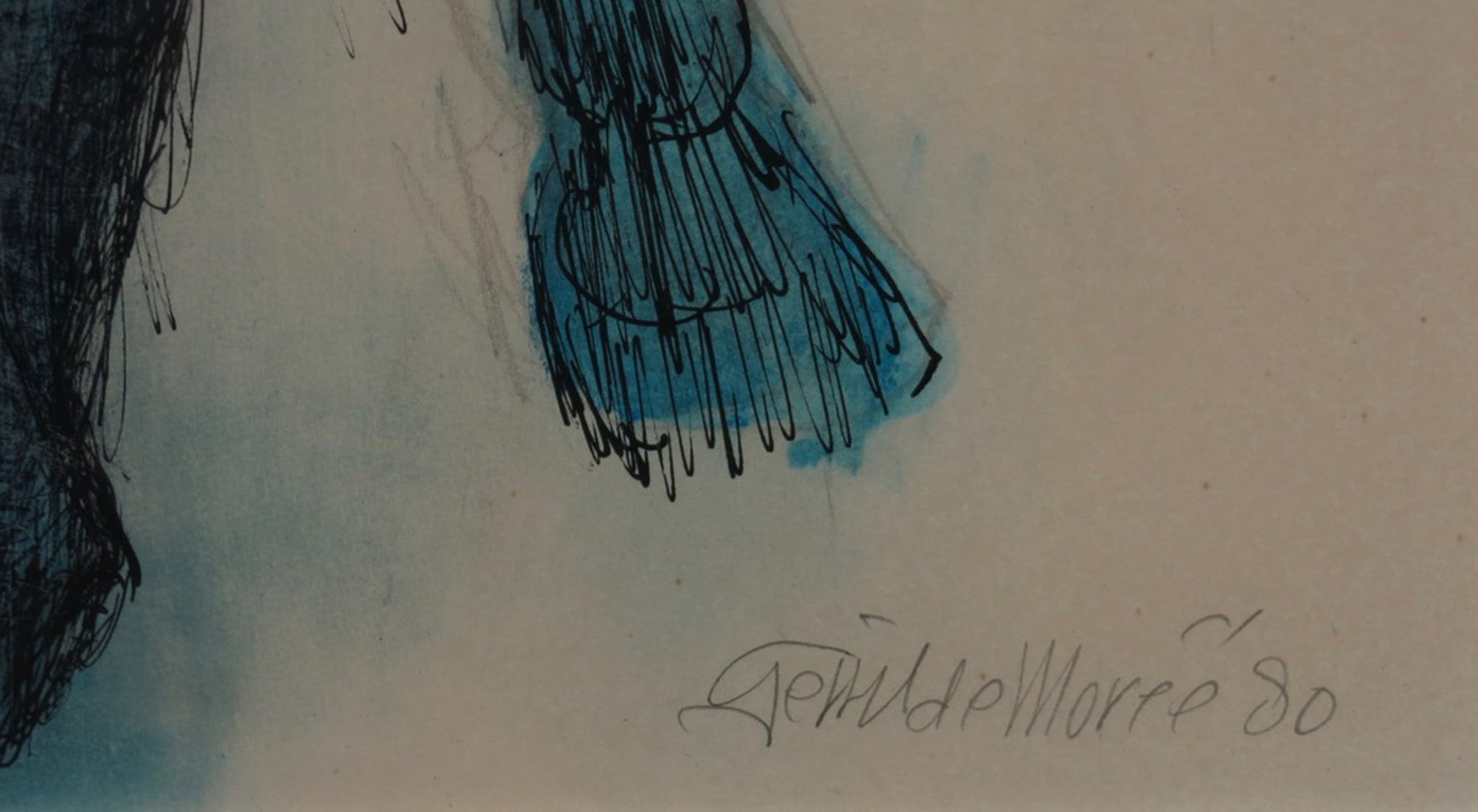 Gerrit de Morée was in 1933 één van de oprichters van de Bredasche kunstkring. Het werk wat hier wordt aangeboden heeft hij een jaar voor zijn dood gemaakt; het is een krachtige inkttekening van een man die op een drinkend paard zit. De tekening is 'ingekleurd' met blauw krijt.