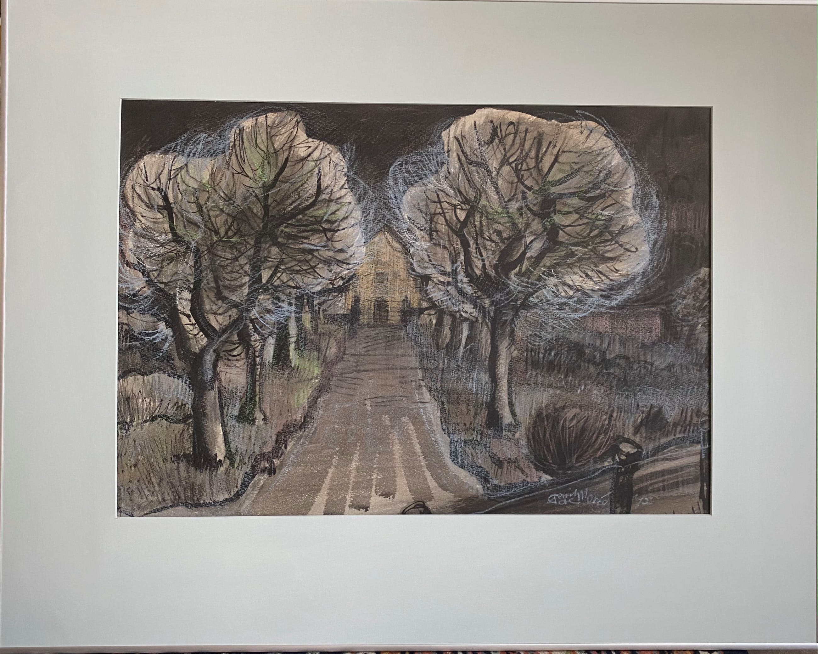 Bijzondere tekening van Bredase kunstenaar Gerrit de Moree. Graficus, tekenaar en schilder. Het betreft een melancholieke tekening van een pad omlijnd door bomen, in pastel en inkt. Formaat ong. 50 x 65 cm. 1972. Handgesigneerd. In perfecte staat.