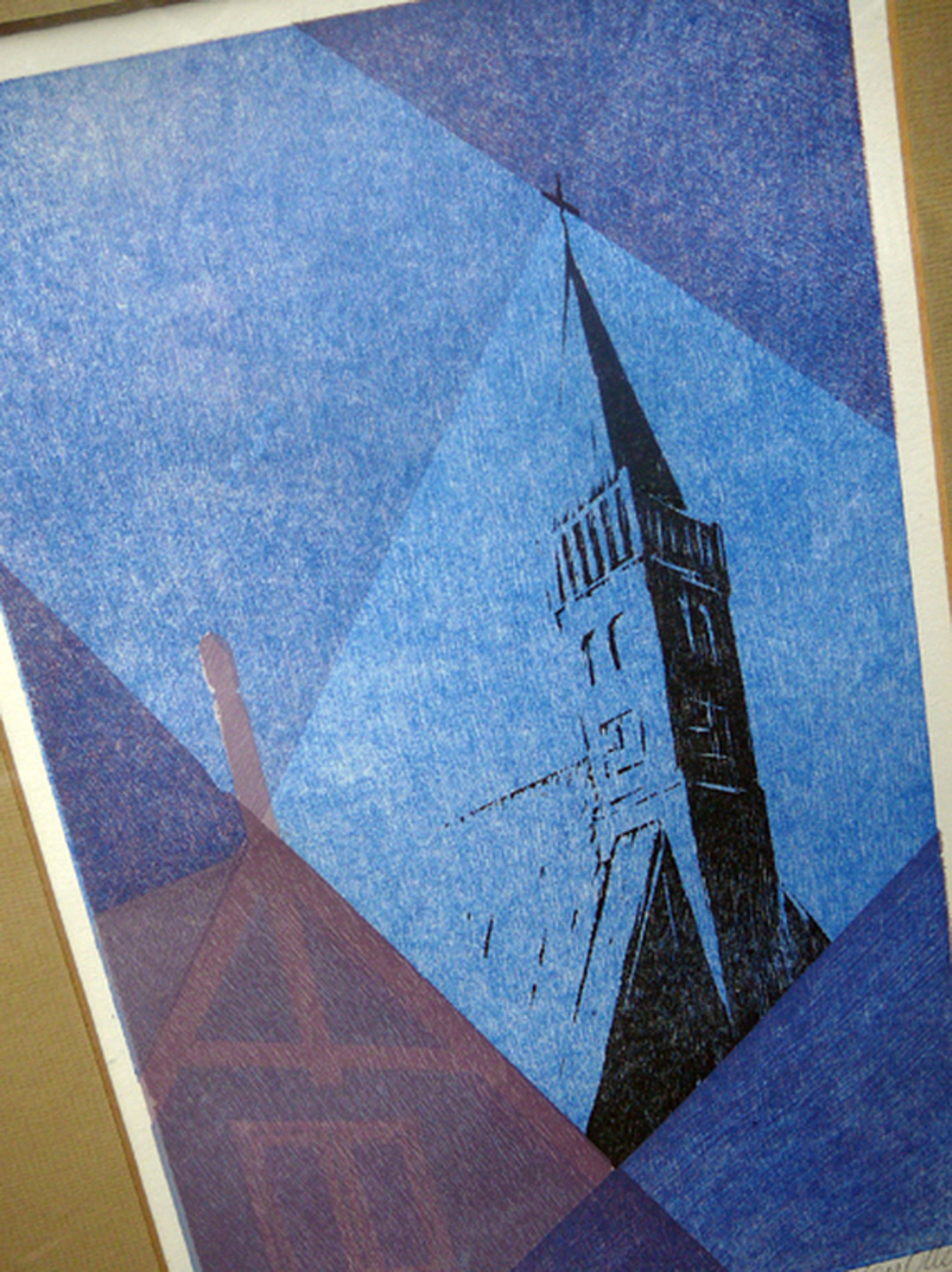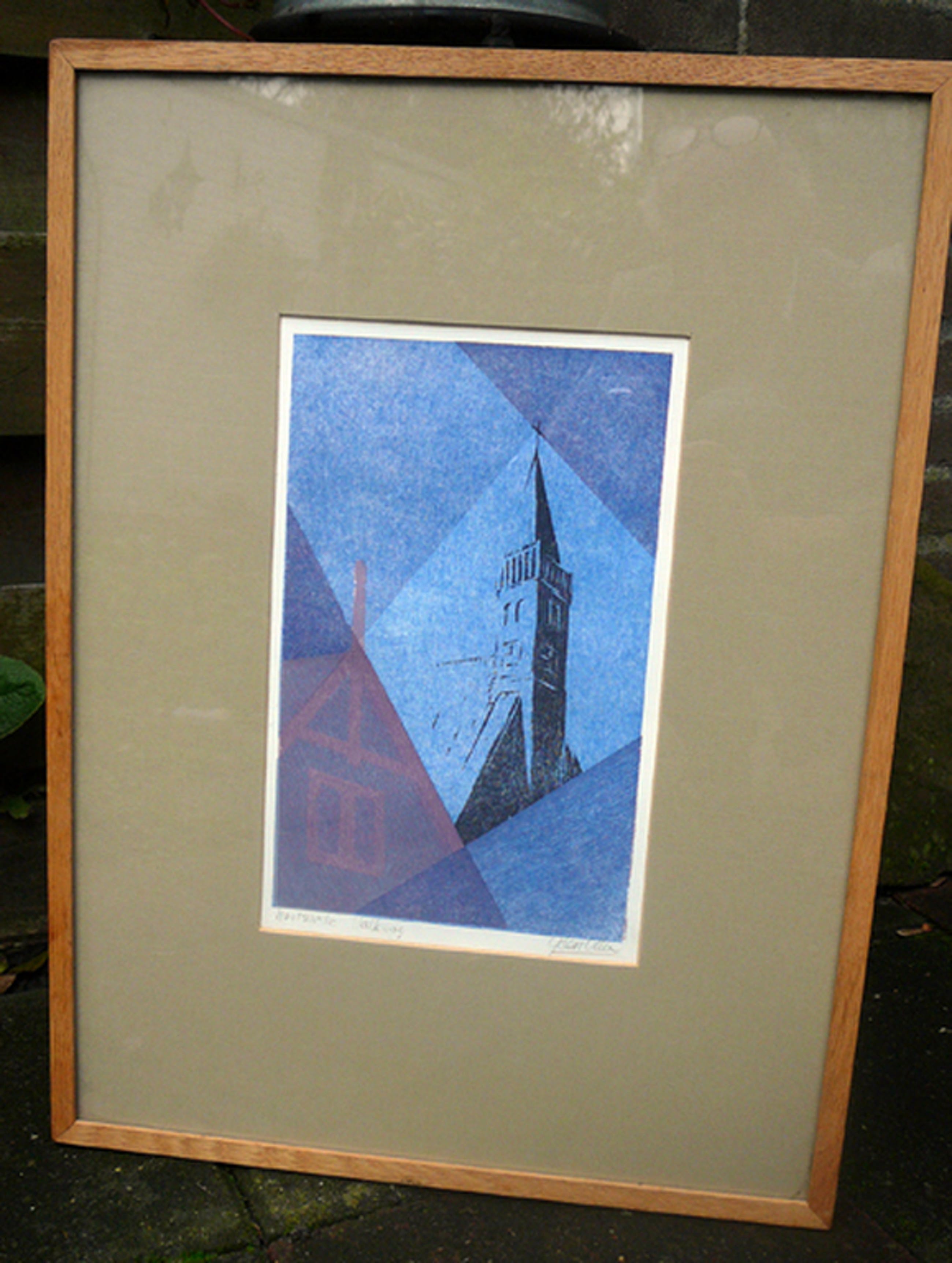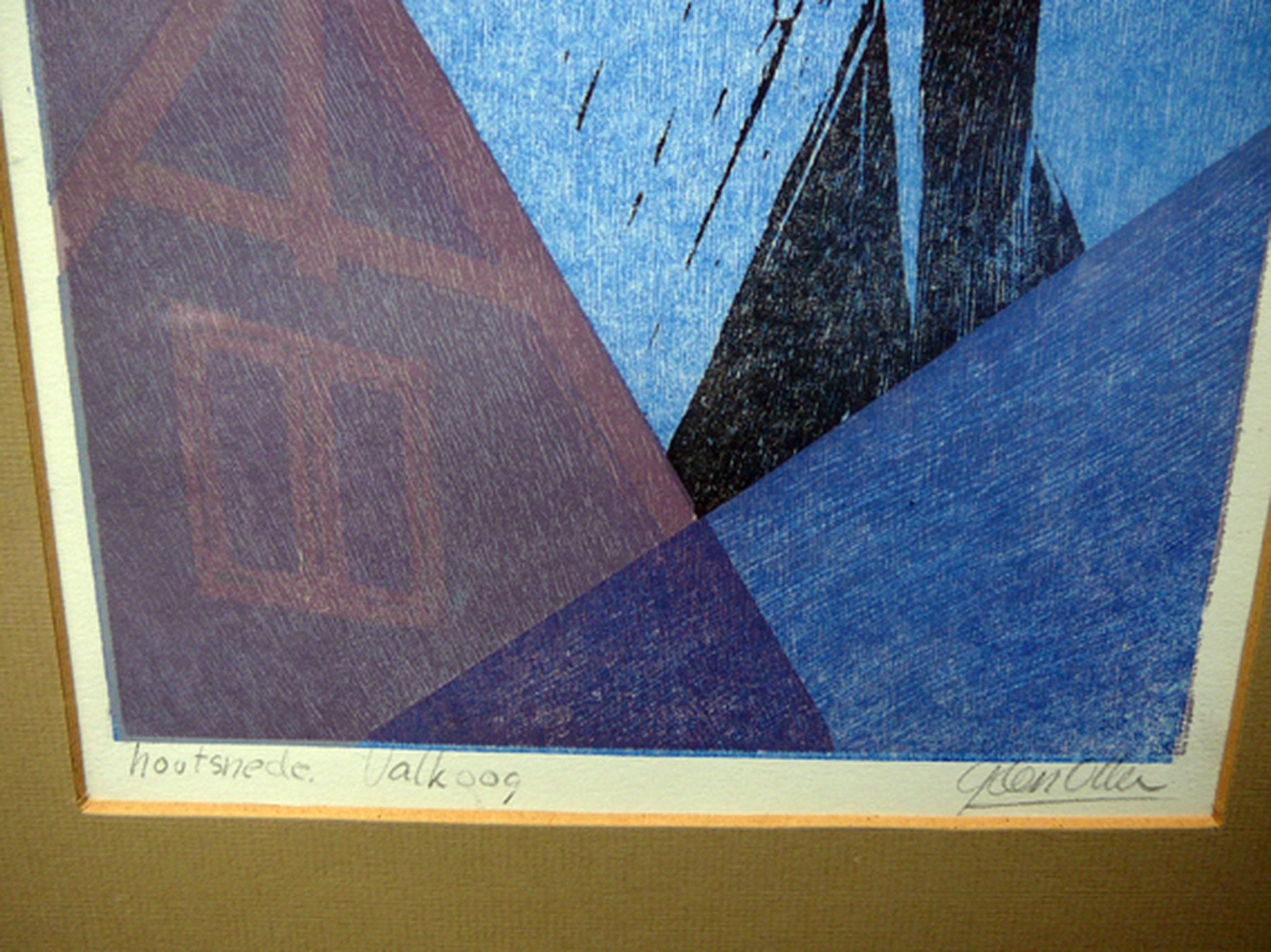Prachtige, met potlood gesigneerde houtsnede van Gerrit den Otter getiteld 'Valkoog'. Handmatig en degelijk gelijst met triplex en blokjes hout aan de achterzijde vast gezet.