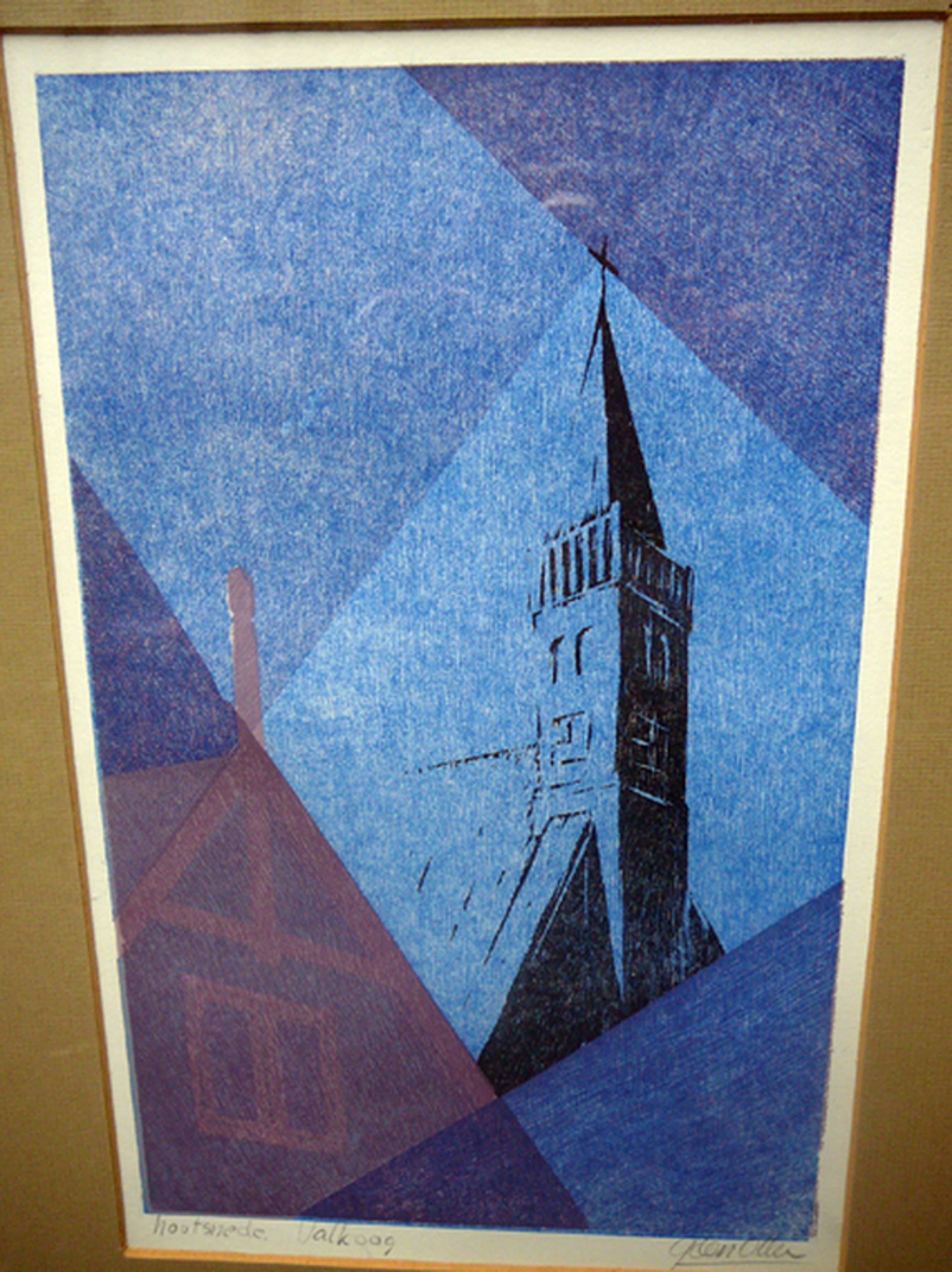 Titel: Valkoog Formaat afbeelding: 20 x 31 cm Formaat lijst: 42 x 57 Techniek: houtsnede Datering en oplage: onbekend Conditie: zeer goed