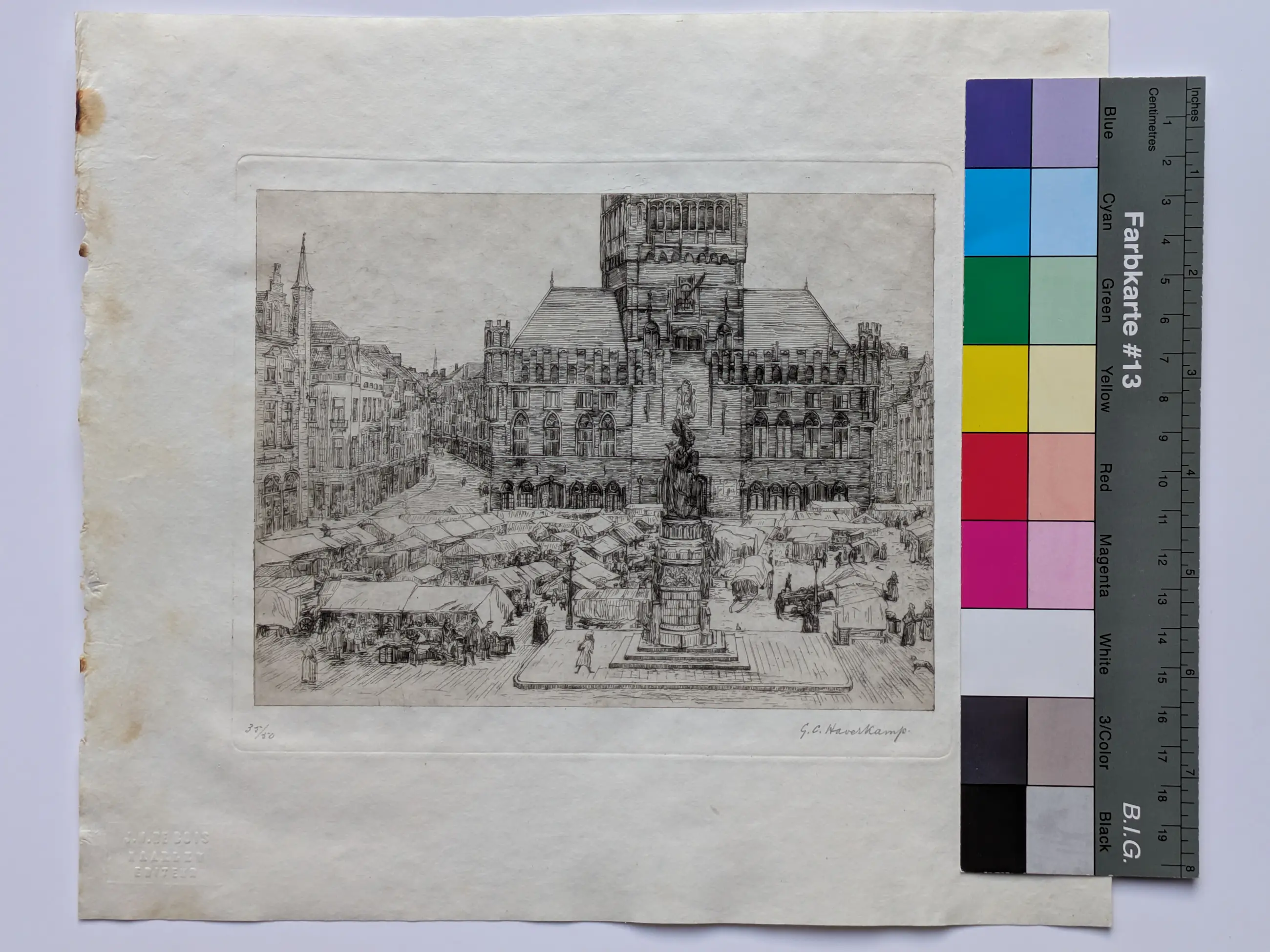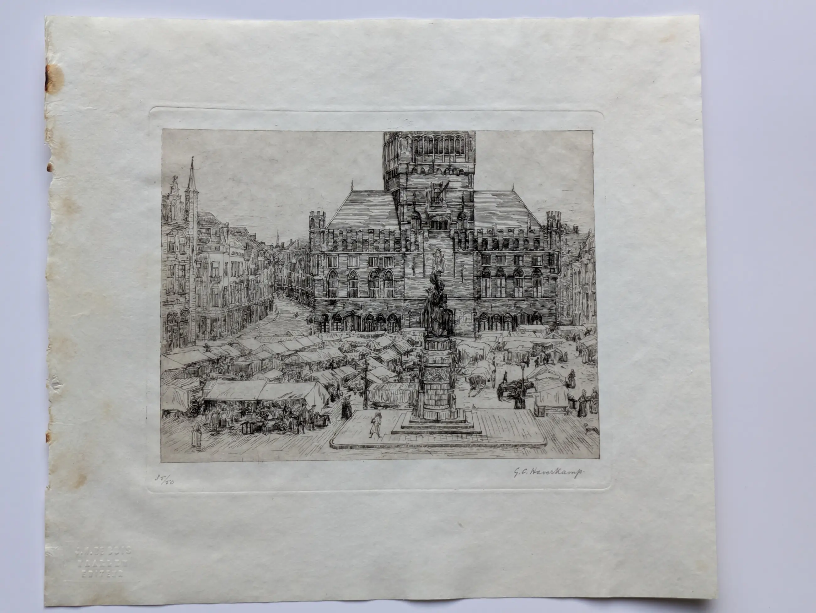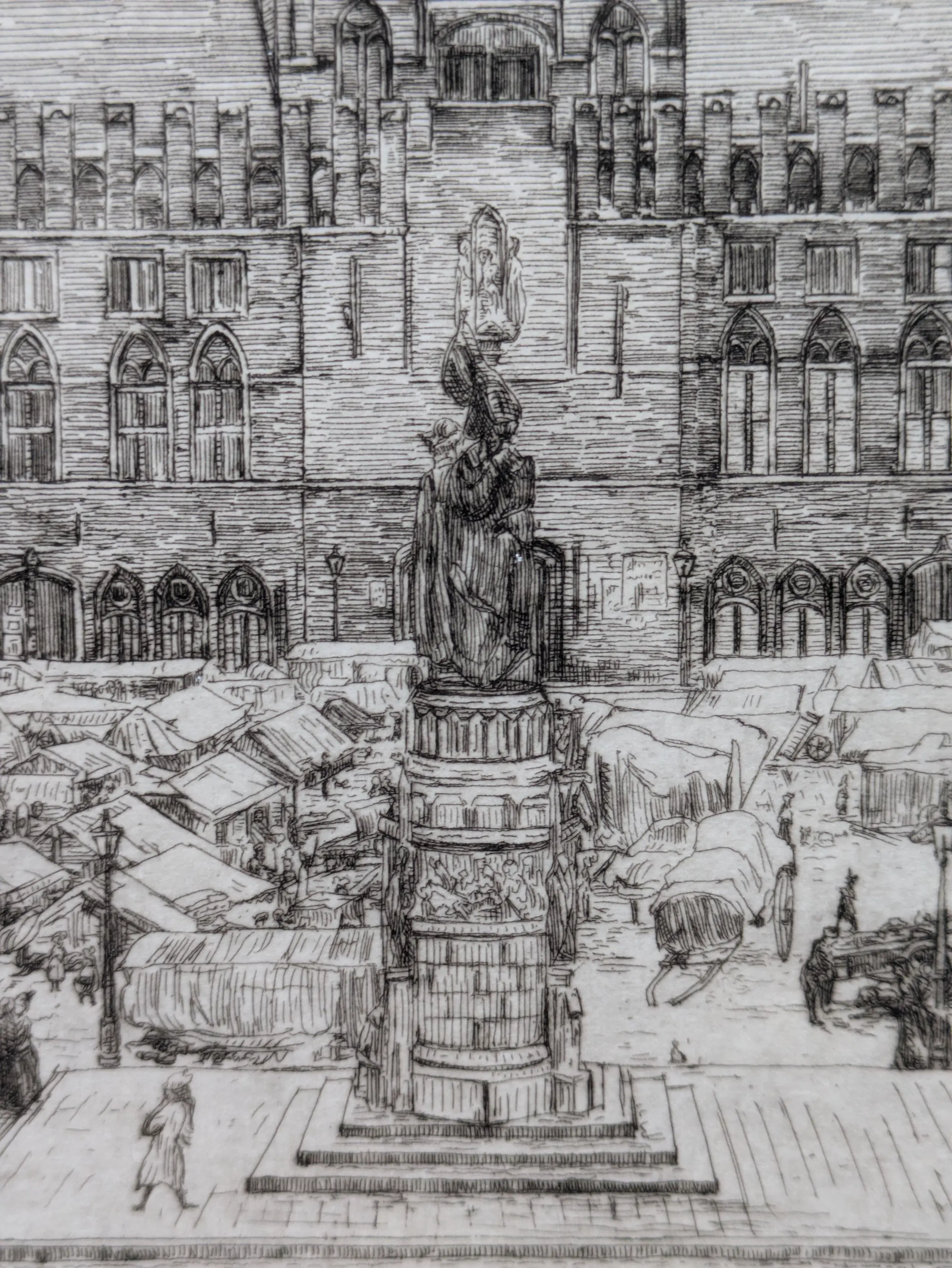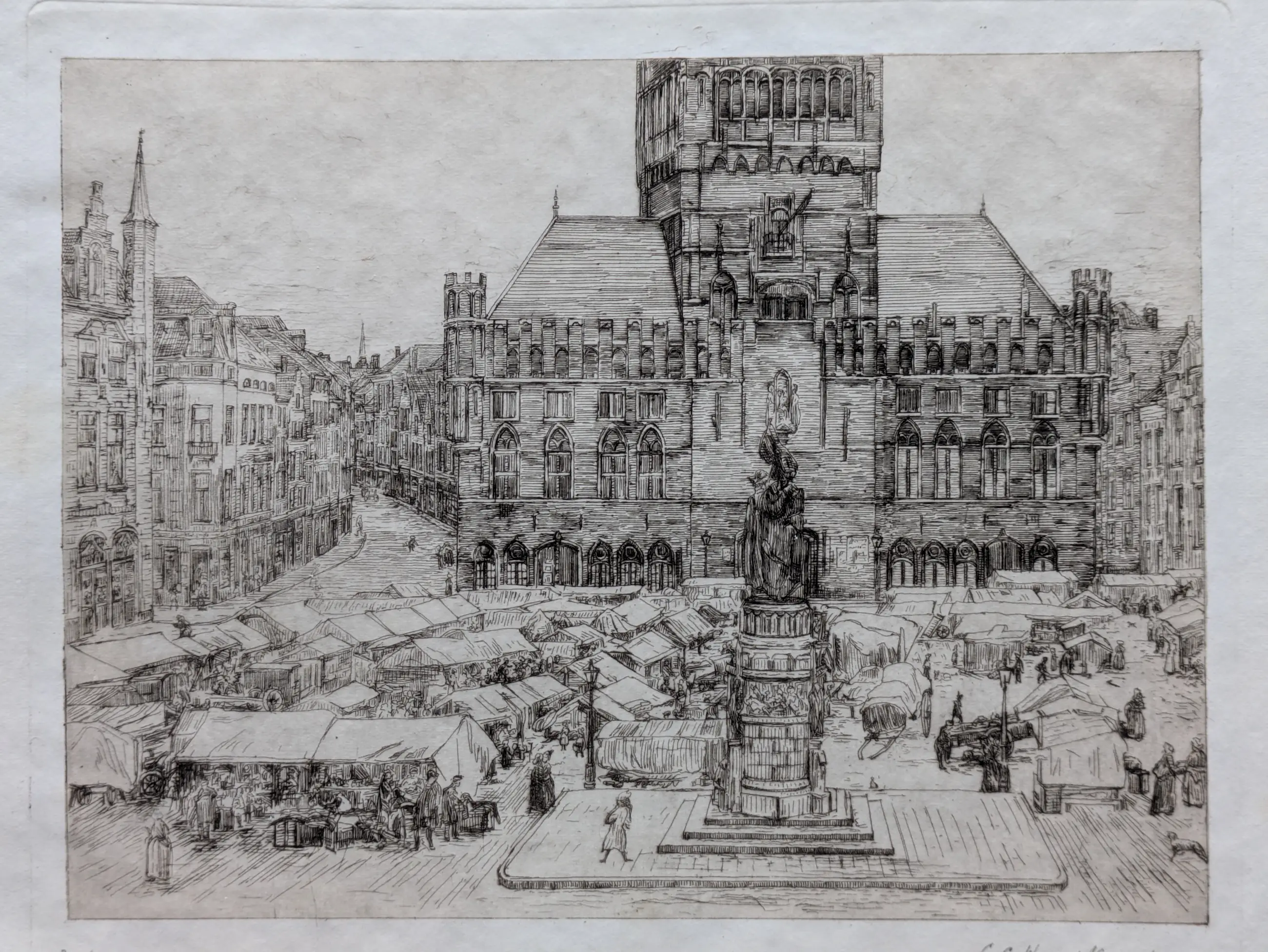 Een leuke ets van Gerrit Haverkamp van de Grote Markt te Brugge, waar op dat moment ook de markt bezig is.