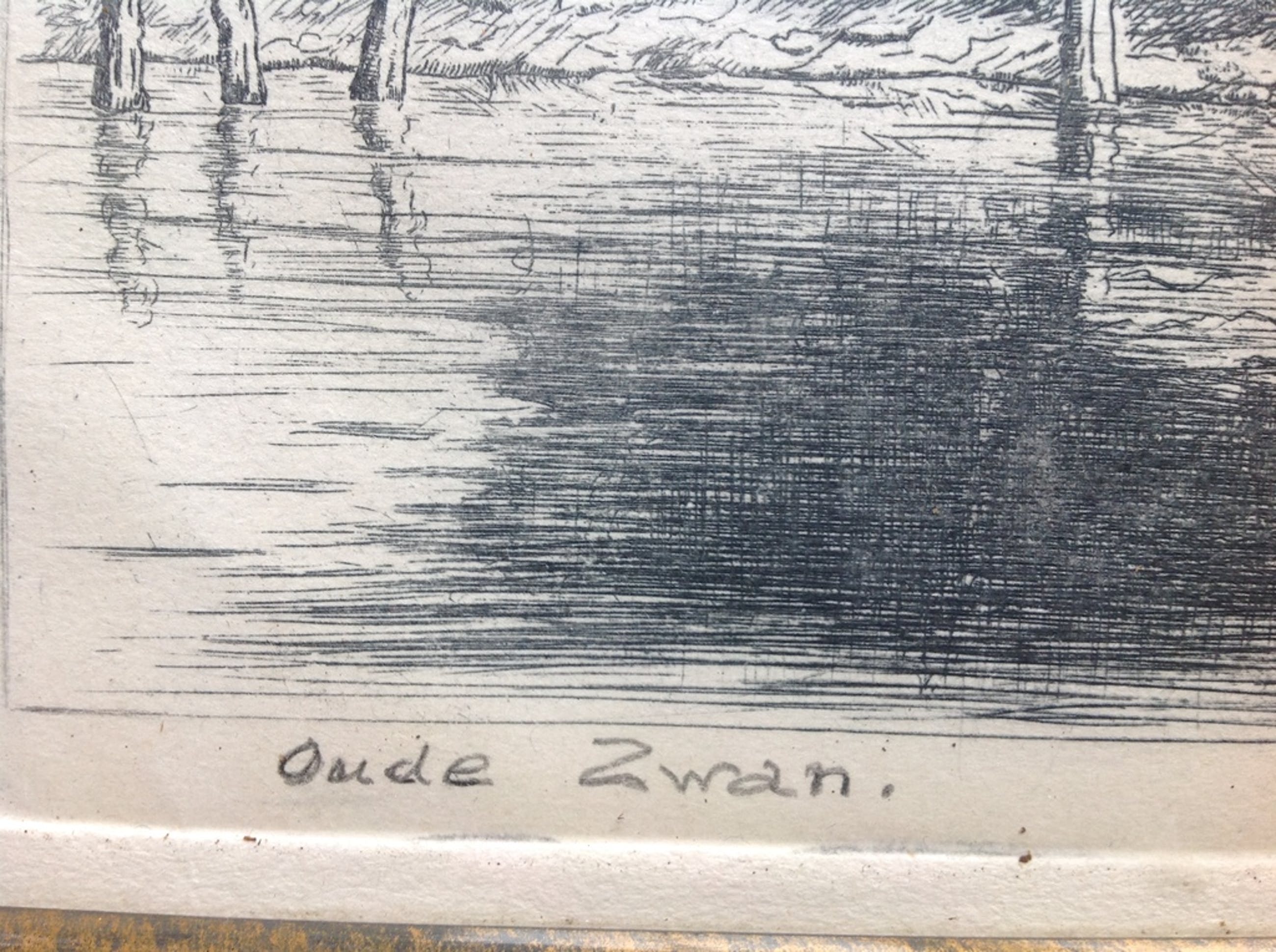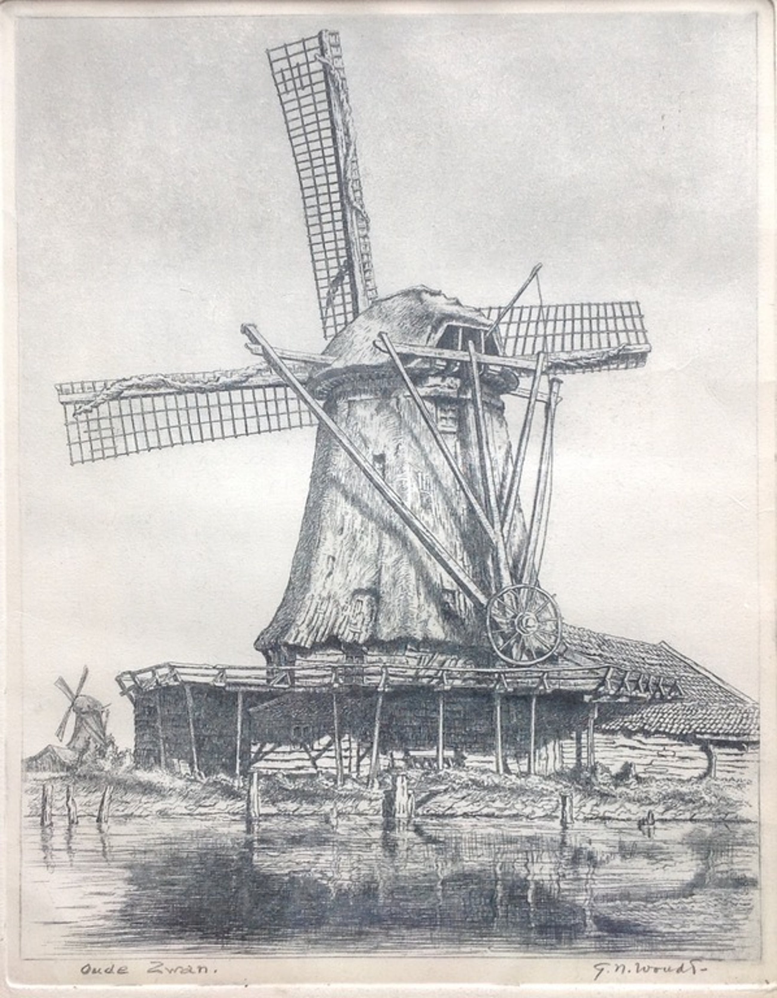 Mooi ets van G.N. Woudt van molen de Oude Zwan in originele lijst