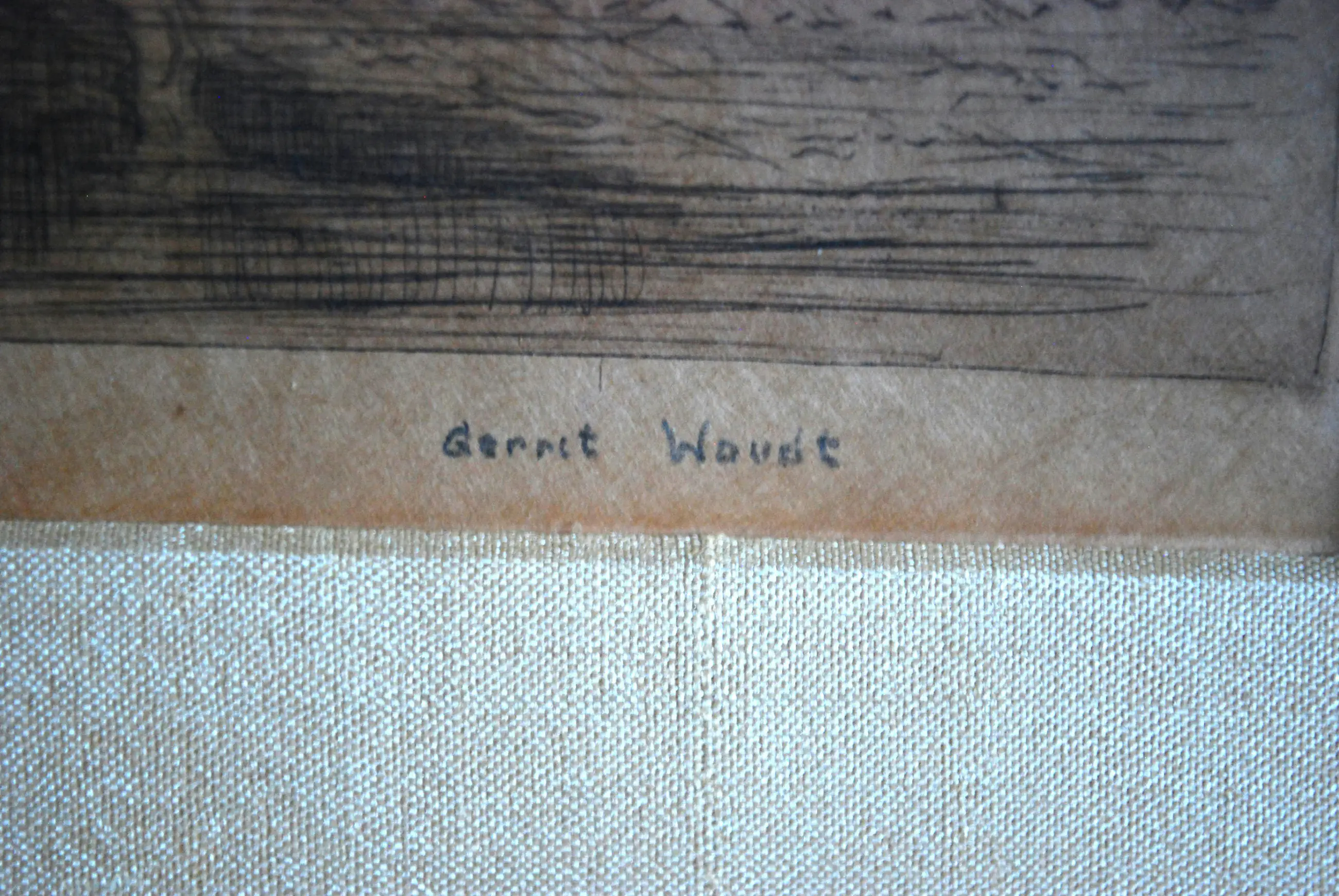 Plaatrand 34x26 cm. Het blad is bevestigd achter een linnen passepartout. Achter glas, in de originele gefineerde lijst (lichte slijtage).
