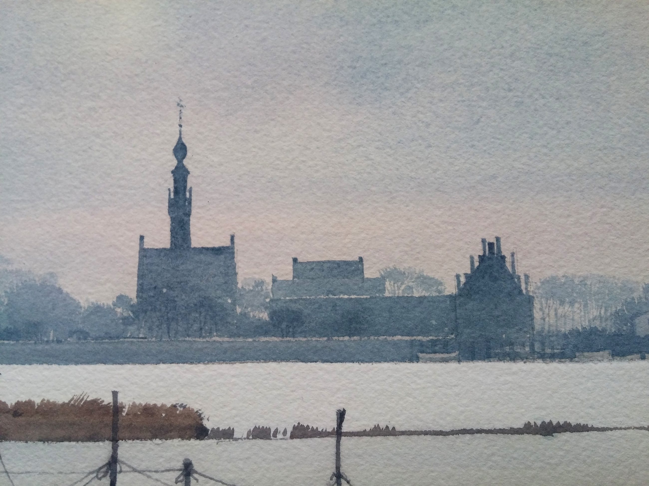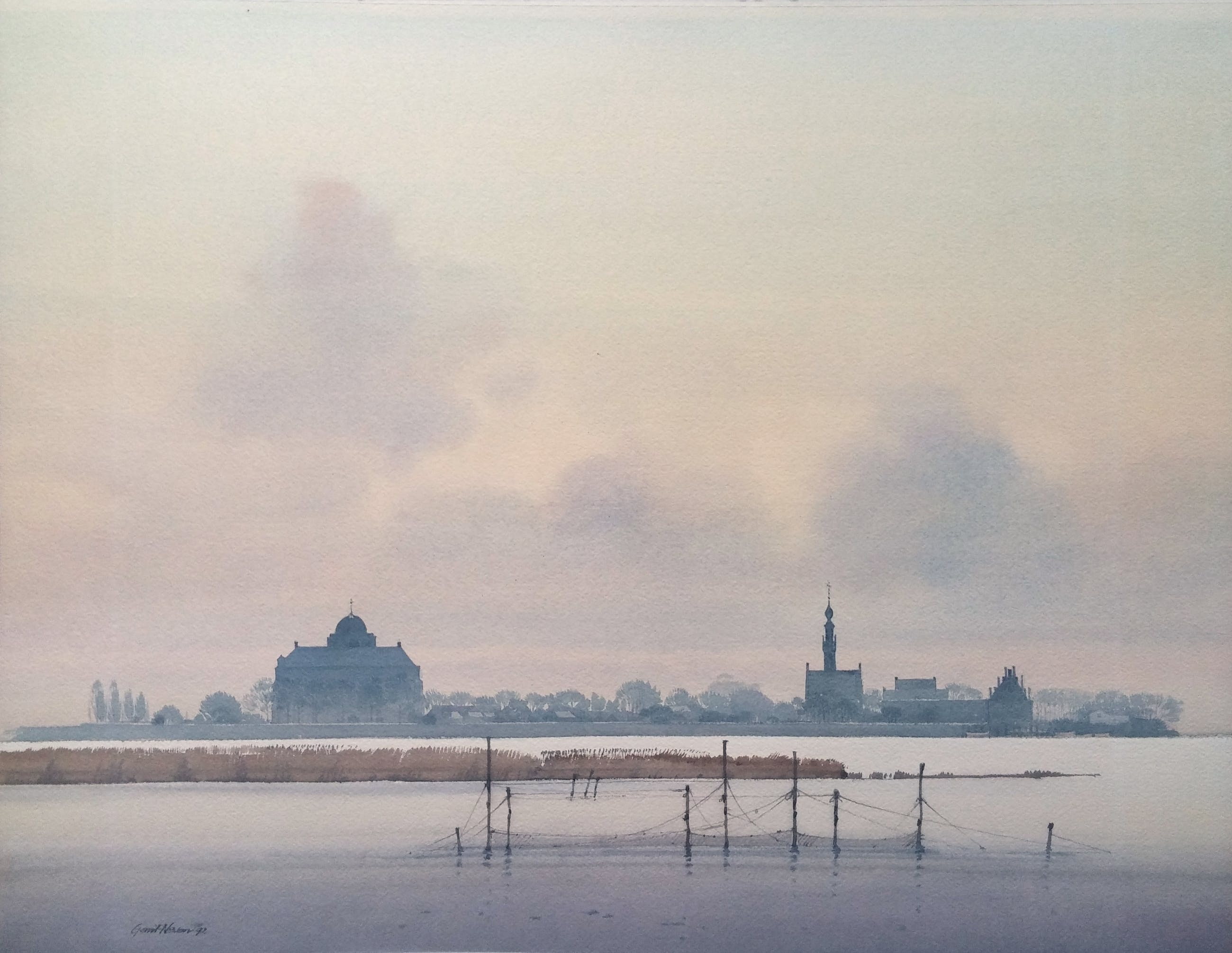 Prachtige aquarel van Gerrit Neven. Stad aan het water in avondstemming. Galerieprijs €1274 staat achter op het werk. Werk zit achter glas. Bij verzending wordt het werk goed verpakt en verzekerd verstuurd. Risico glasbreuk is voor de koper. Afhalen verdient de aanbeveling.