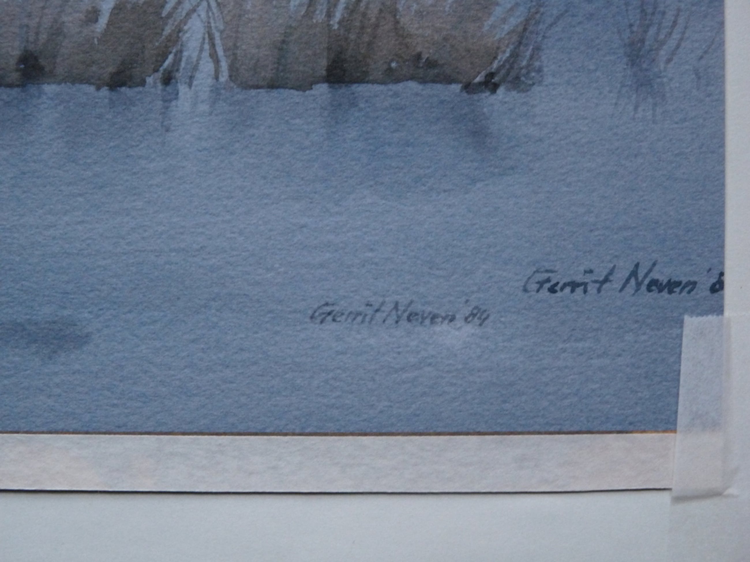 Karakteristieke aquarel, is ingelijst geweest. In de hoeken aan boven- en onderkant met tape vastgemaakt aan stevig papier.
