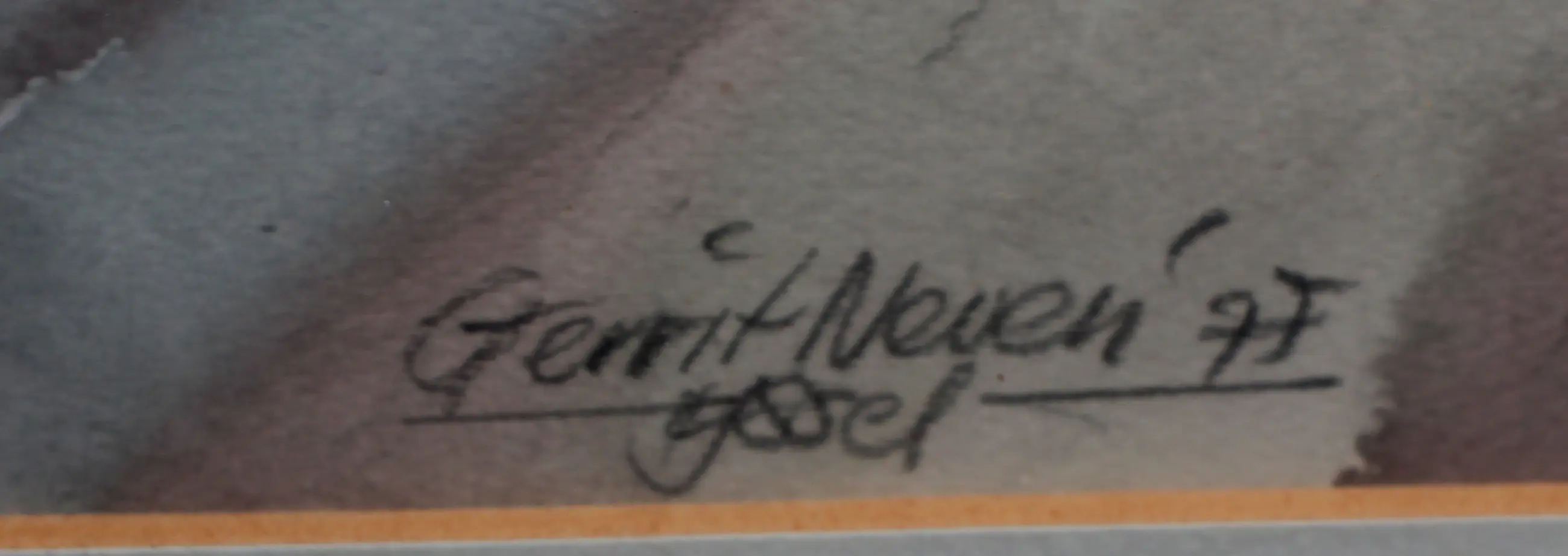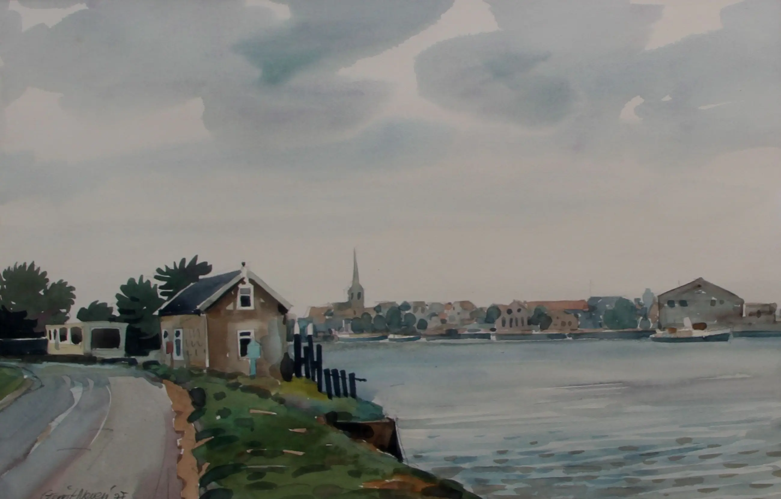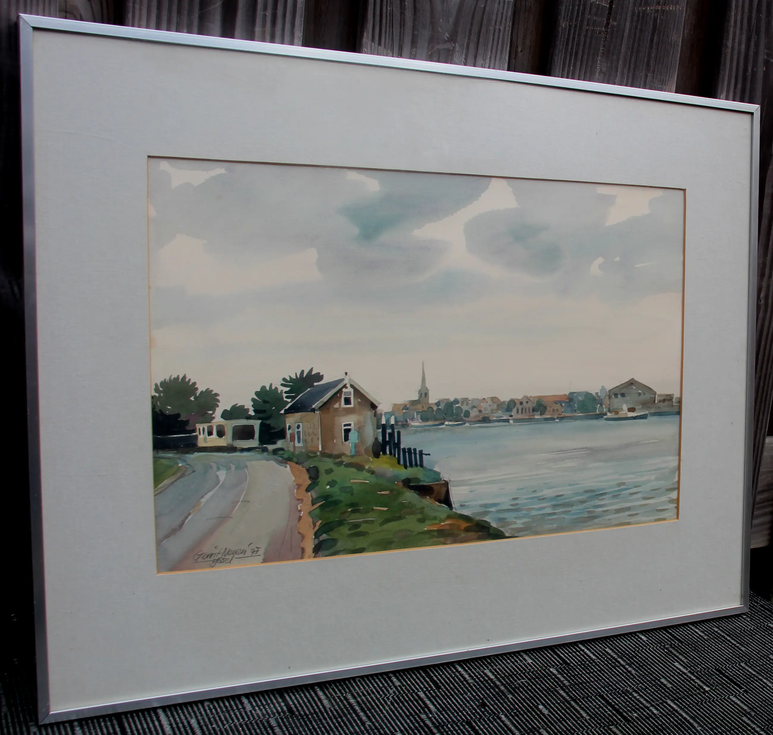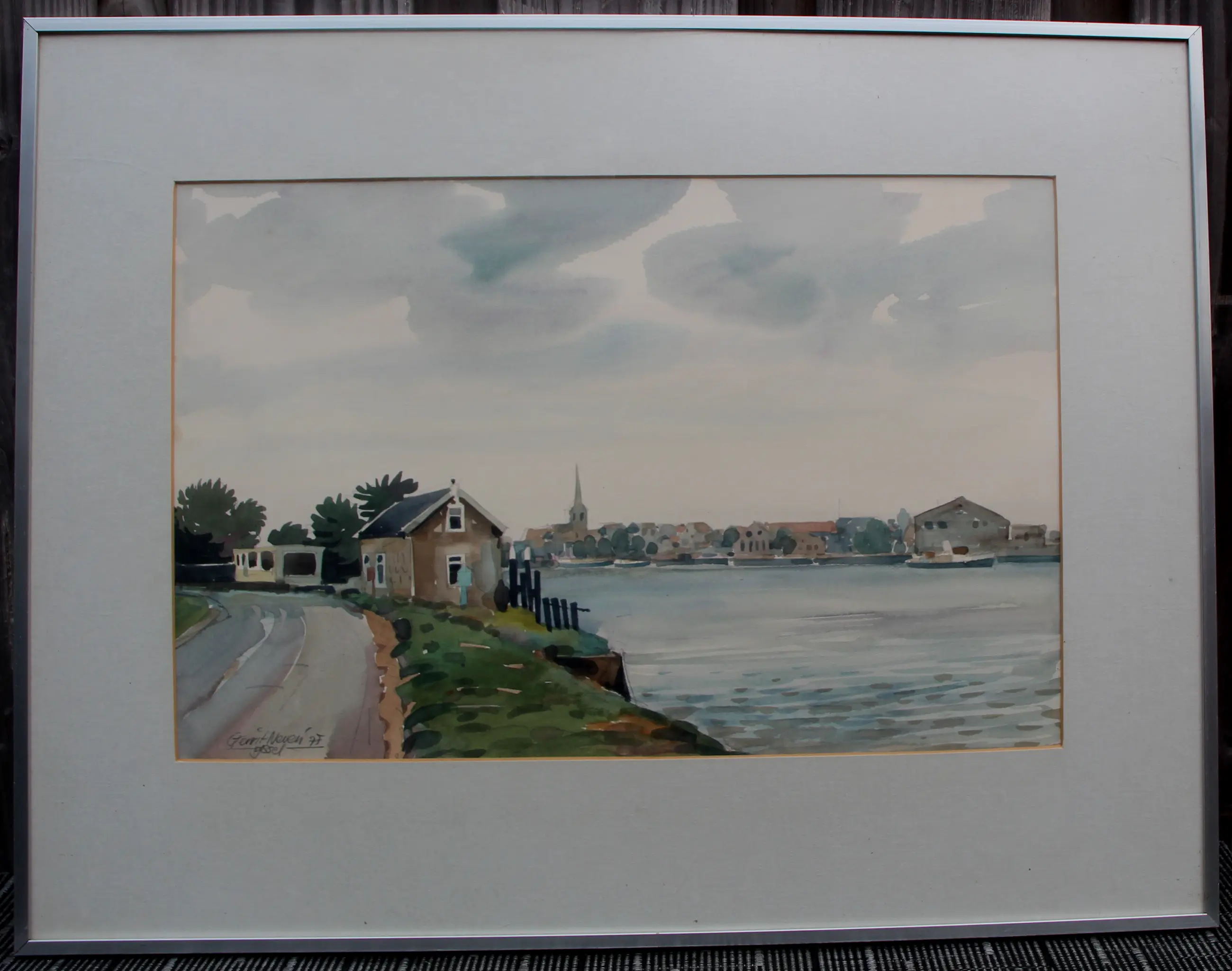 Ingelijste aquarel, op papier, van Gerrit Neven. Titel: IJssel. Jaar: 1997. Afmetingen incl lijst: H51 x b65cm. Afmetingen voorstelling: H31.5 x b47.5cm. Het werk is rechts onderaan gesigneerd door de kunstenaar. De authenticiteit van het aangeboden werk wordt volledig gegarandeerd. Een certificaat van echtheid kan, op aanvraag, worden gemaild.