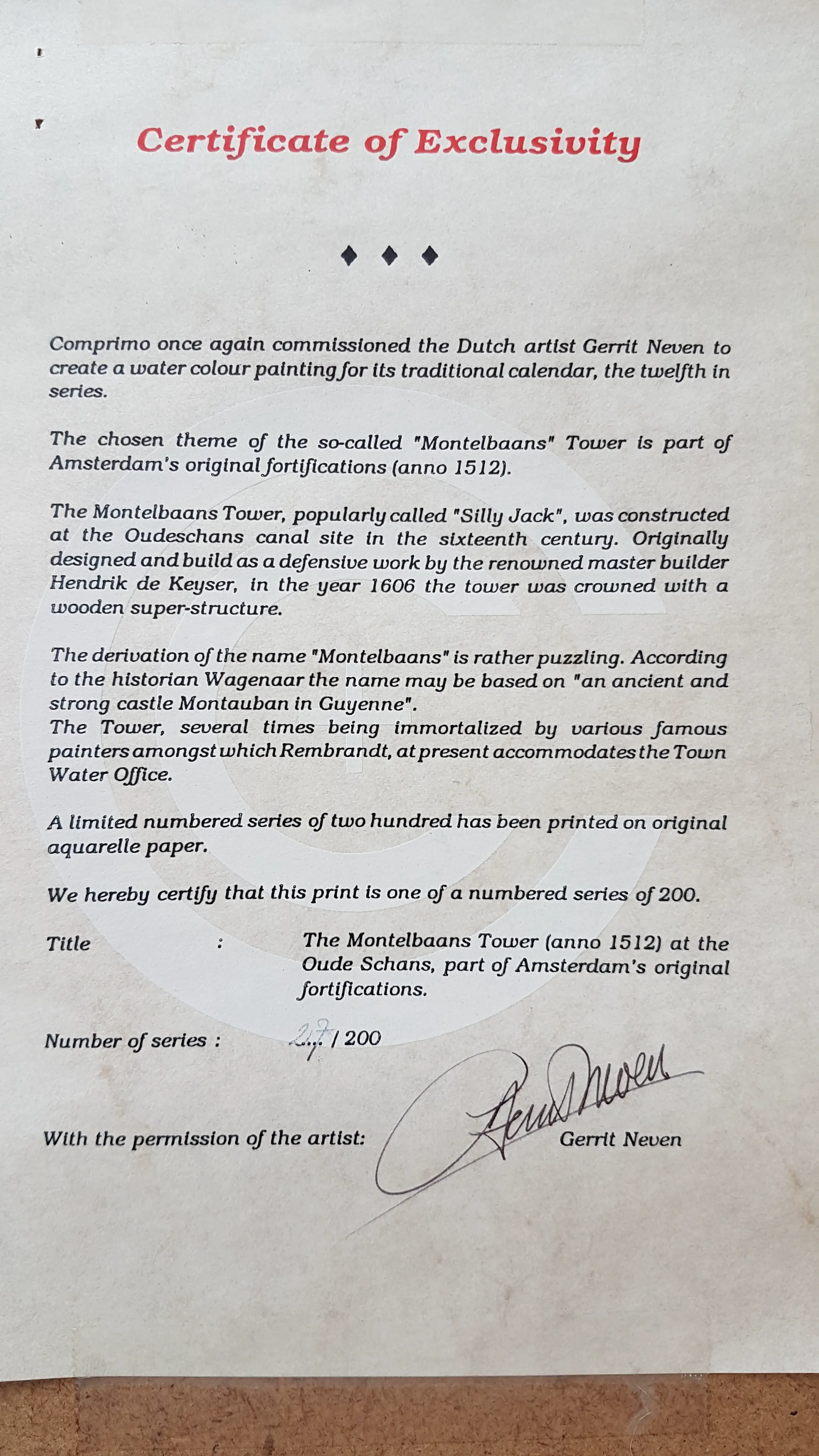 Prachtige aquarel van deze Amsterdamse toren. Met certificaat van exclusiviteit nr 27 van 200