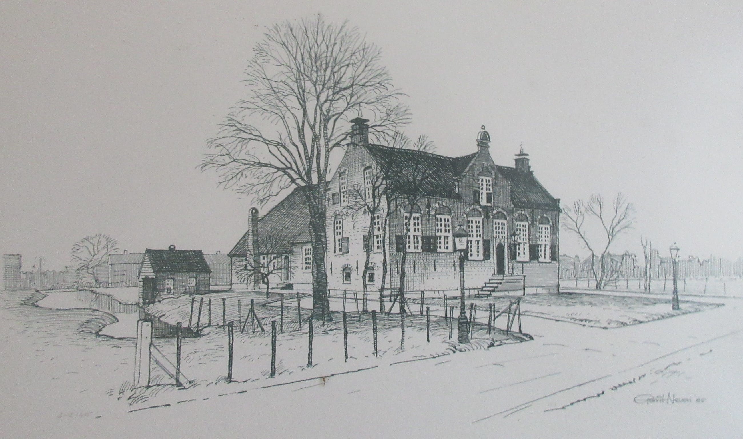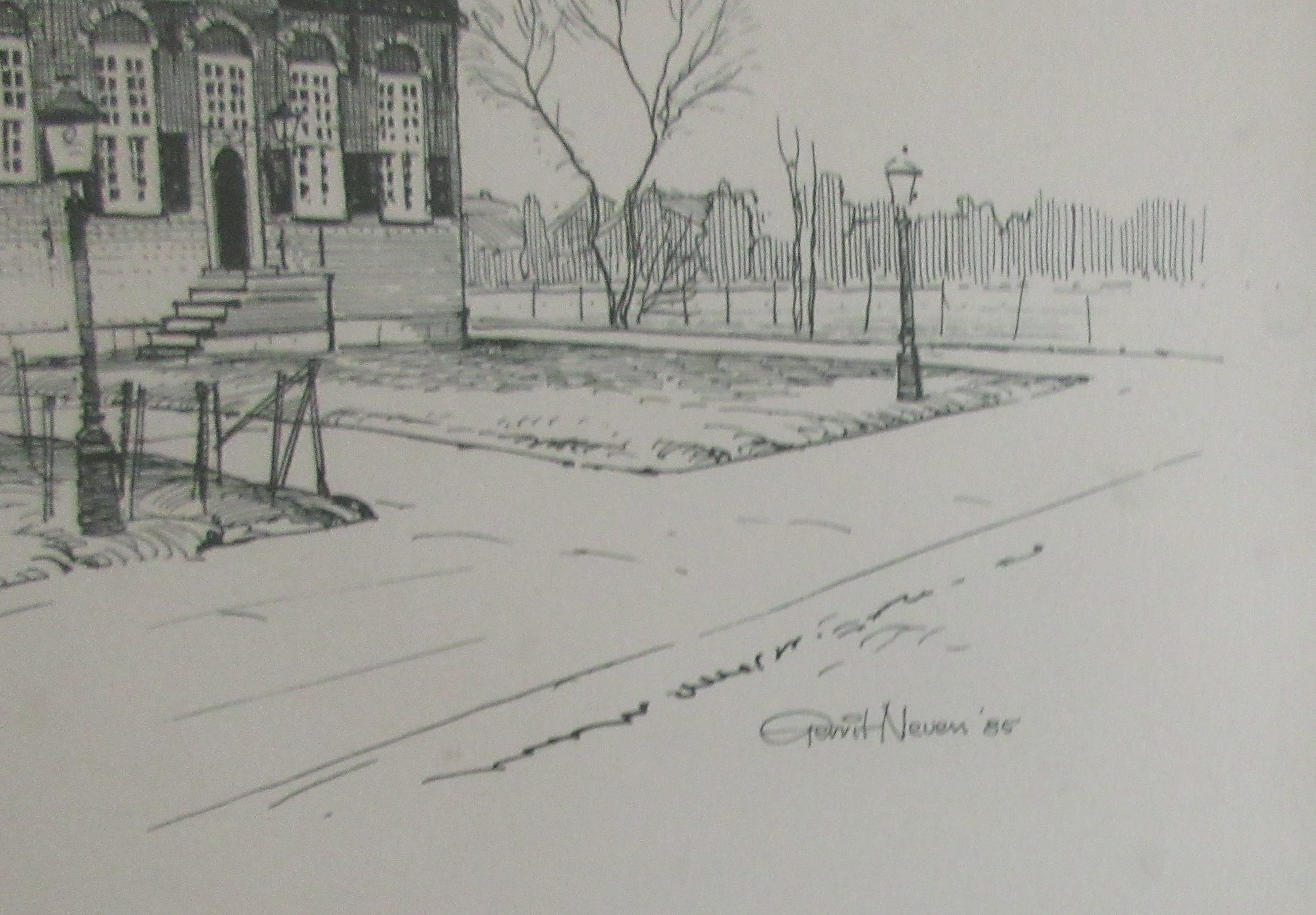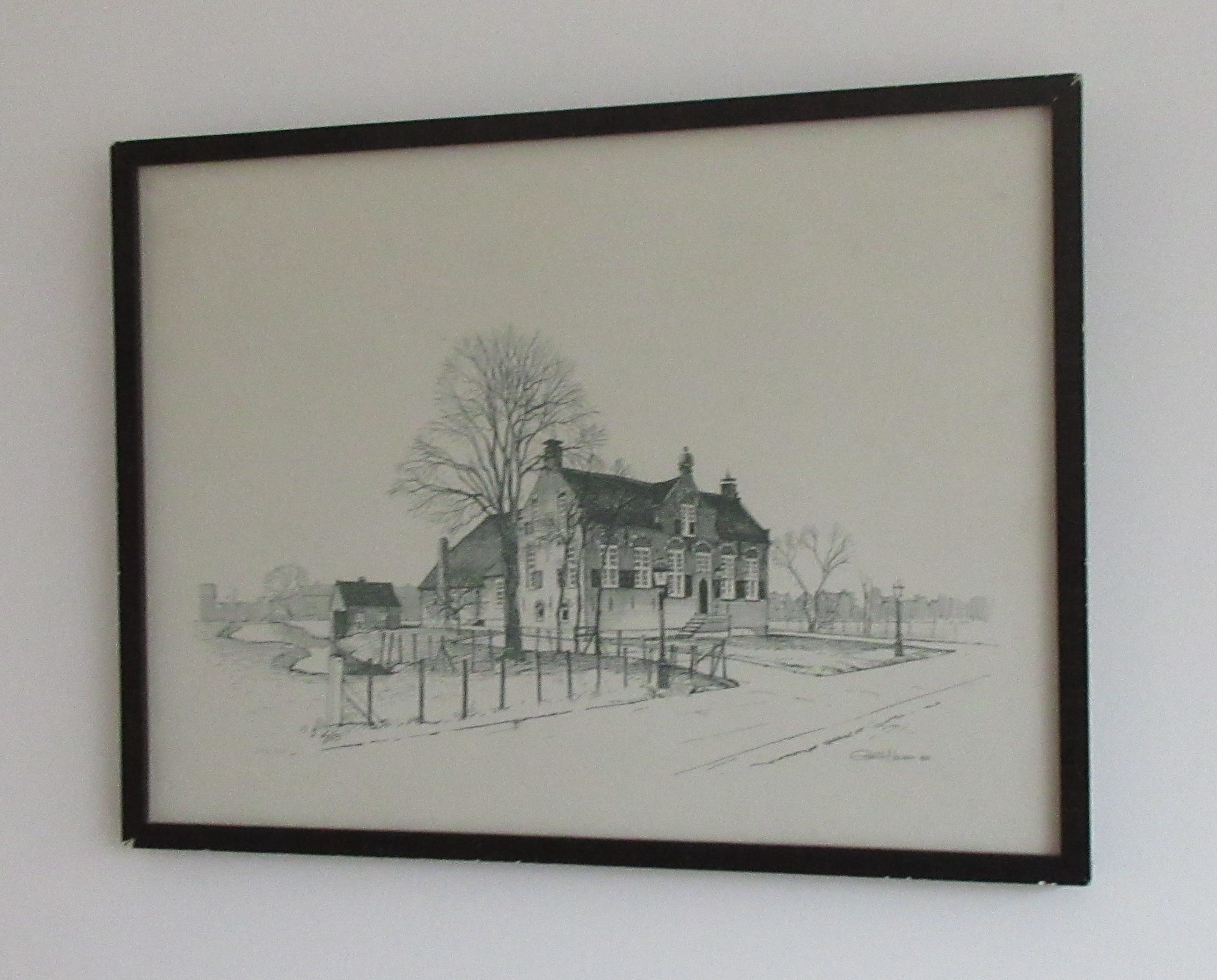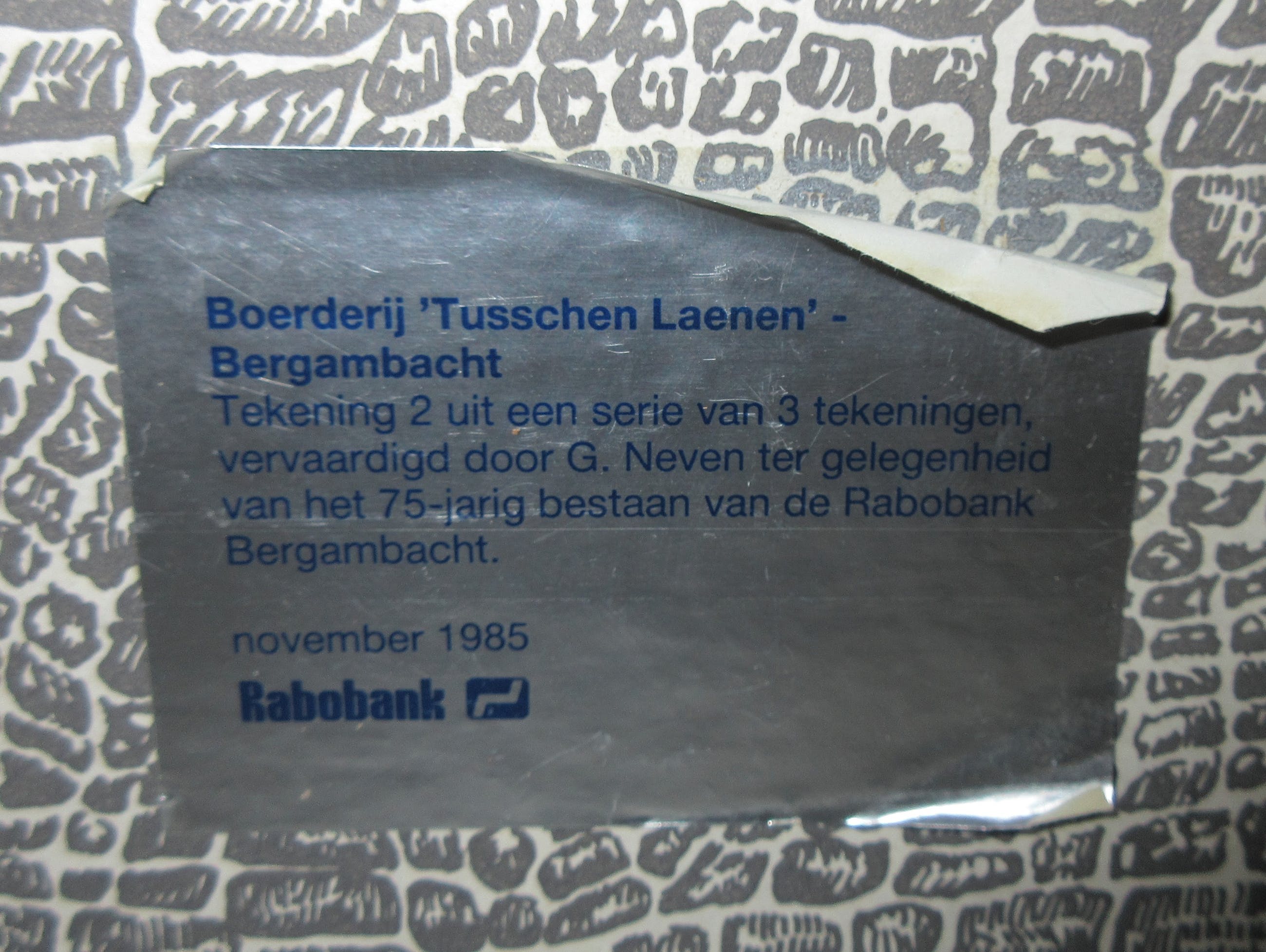 Pentekening boerderij 'Tusschen Laenen' in Bergambacht deel 3 uit serie van 3 uitgebracht voor de Rabobank in 1985. Rechtsonderin gesigneerd en gedateerd en linksonderin voorzien van serie nummer. Op de achterzijde voorzien van sticker van de Rabobank met titel van het werk.