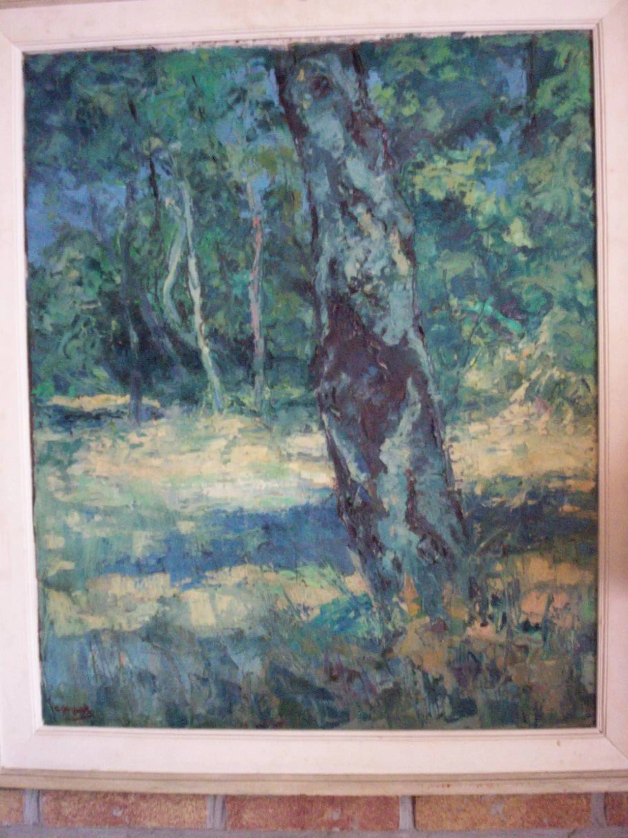 Schilderij in oorspronkelijke lijst. De lijst heeft lichte beschadigingen. Het doek van het schilderij moet opnieuw gespannen worden. Kleine scheur van twee cm aan achterzijde zichtbaar.