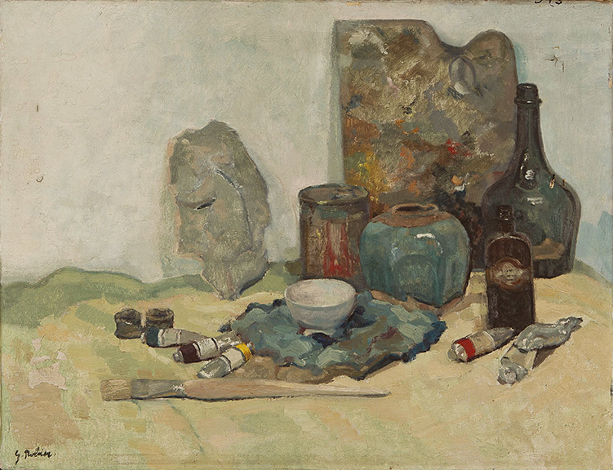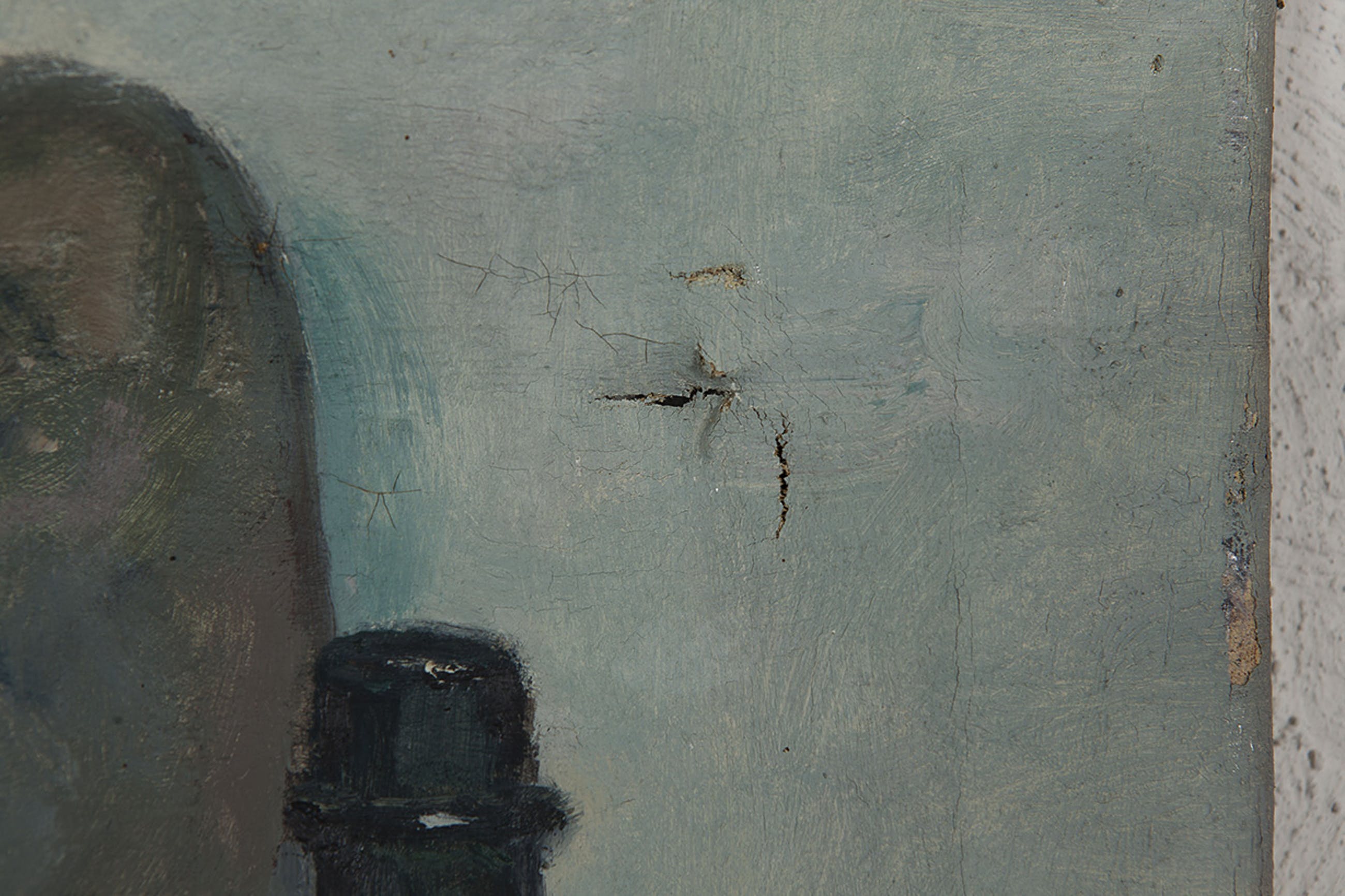 | De verf bladdert af in de linker onderhoek; het doek is erg stug en diep ingedeukt onder het spieraam in de rechter bovenhoek . | |