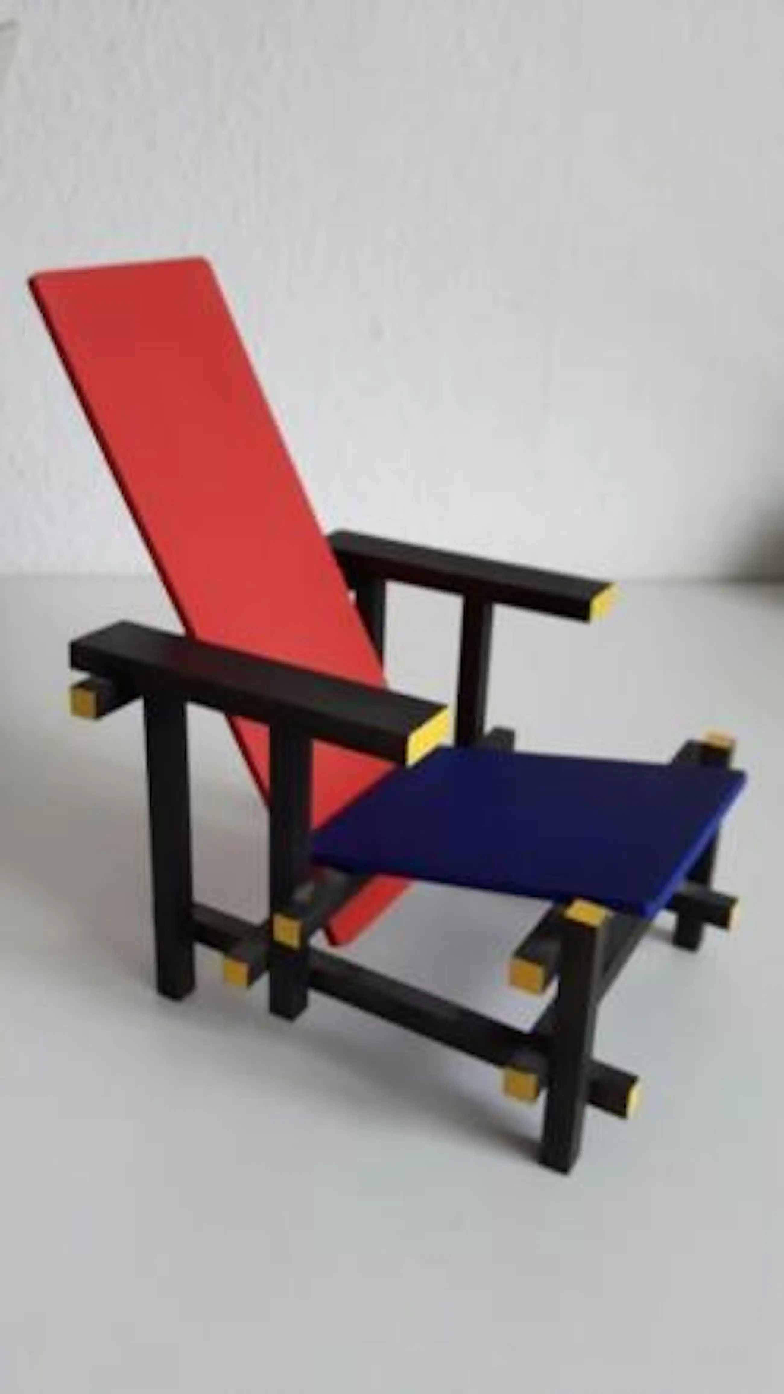 Prachtige miniatuur productie van Gerrit Rietveld en Nederlands meest bekende stoel; de lattenstoel, ofwel de Rood-Blauwe stoel.