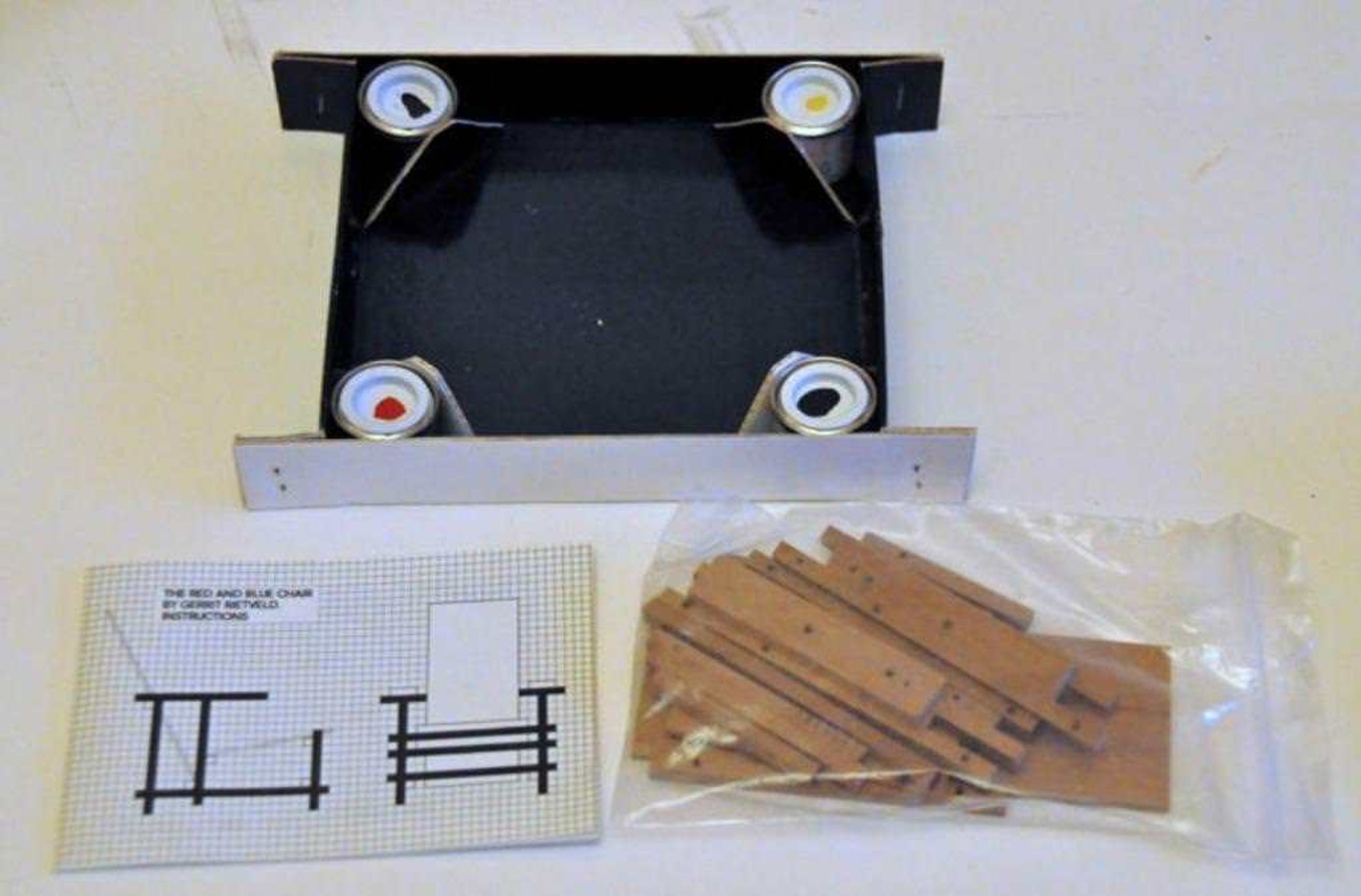 Prachtig modelbouwpakket van de beroemde rood blauwe stoel van Rietveld. Uitgave 1983. De rood blauwe stoel is het bekendste voorbeeld van Dutch Design. De stoel wordt geroemd om haar eenvoud en uitstraling. Dit is een bouwpakket van deze stoel. Het bouwpakket is compleet en de inhoud is nog nooit uitgepakt, incl. de 4 potjes verf met de Rietveldkleuren en compleet met handleiding. De bouwinstructies zijn origineel en in het Engels