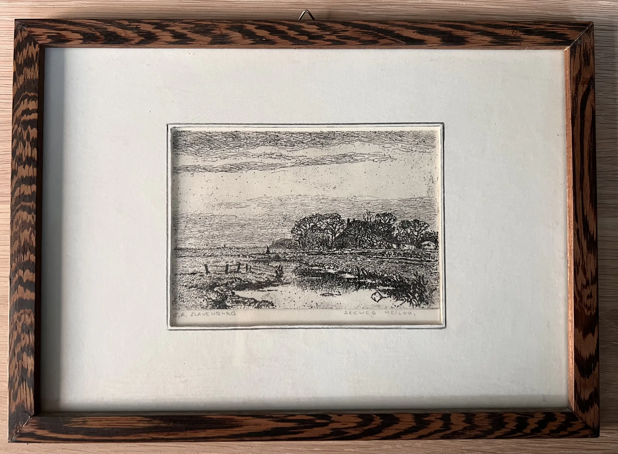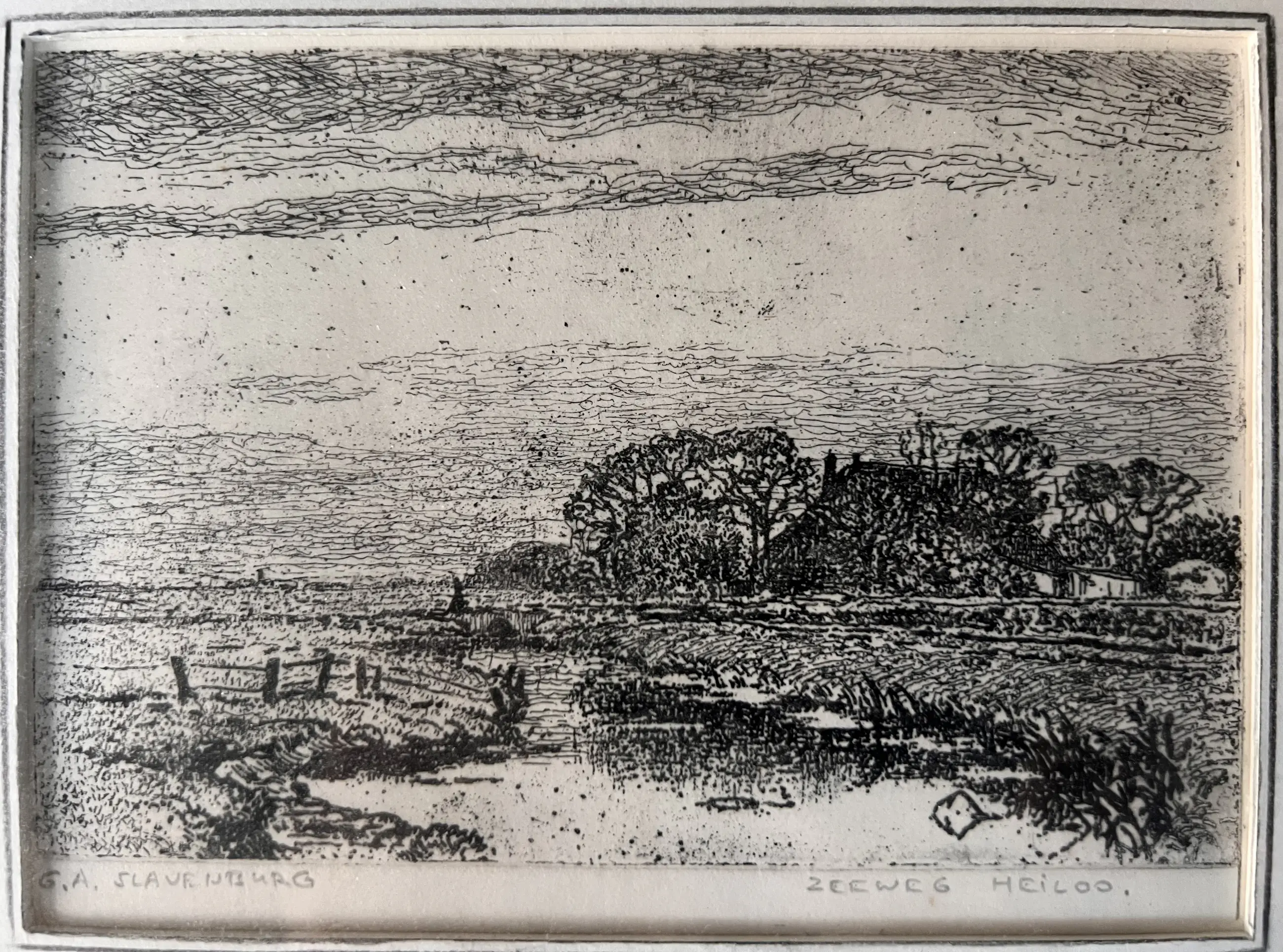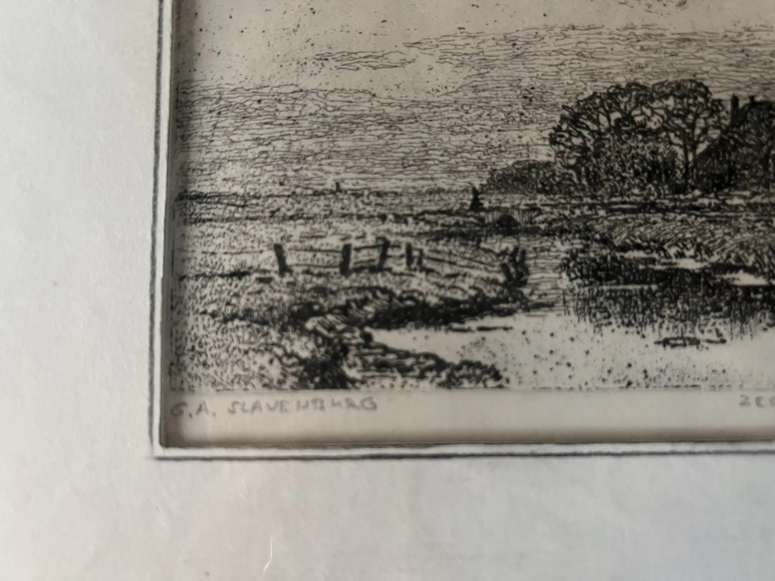 Uit erfenis verkregen eenmalig gemaakte handgesigneerde ets van Gerrit Slavenburg (Gerrit Slavenburg (1899-1978). Landschap Zeeweg Heiloo