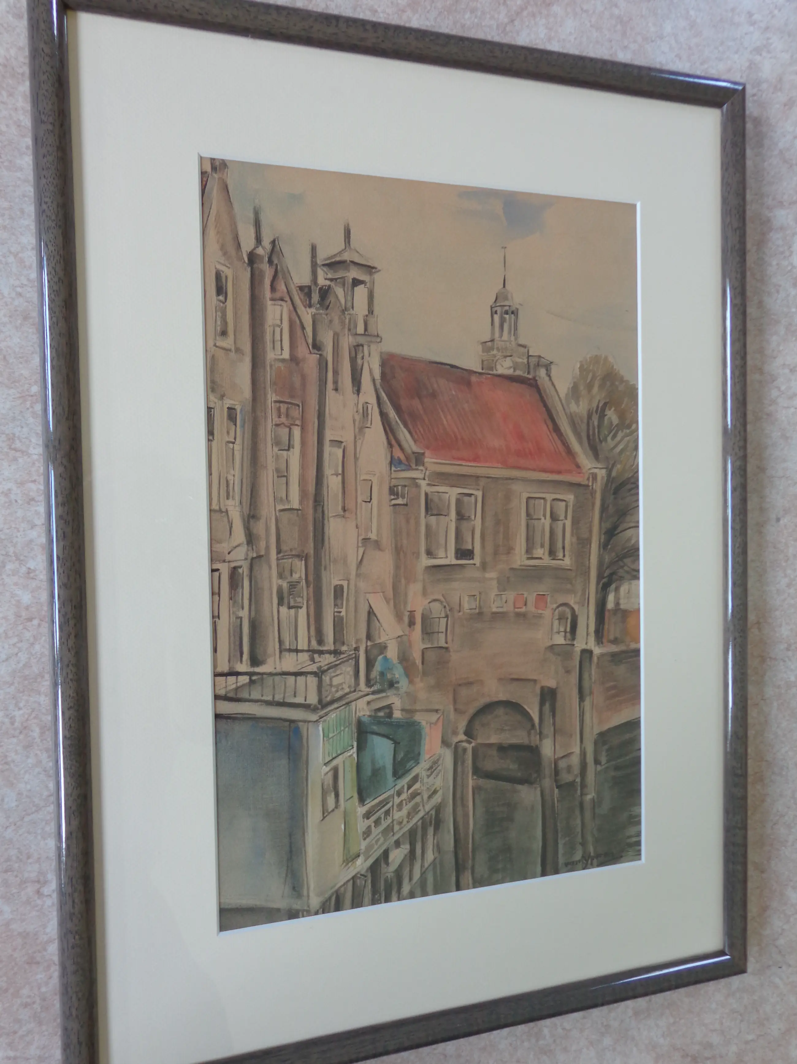 Gerrit Van IJperen (1882-1955). Stadszicht in Nederland. Origineel werk van aquarel op papier. Gesigneerd met inkt. Zeer goede staat.