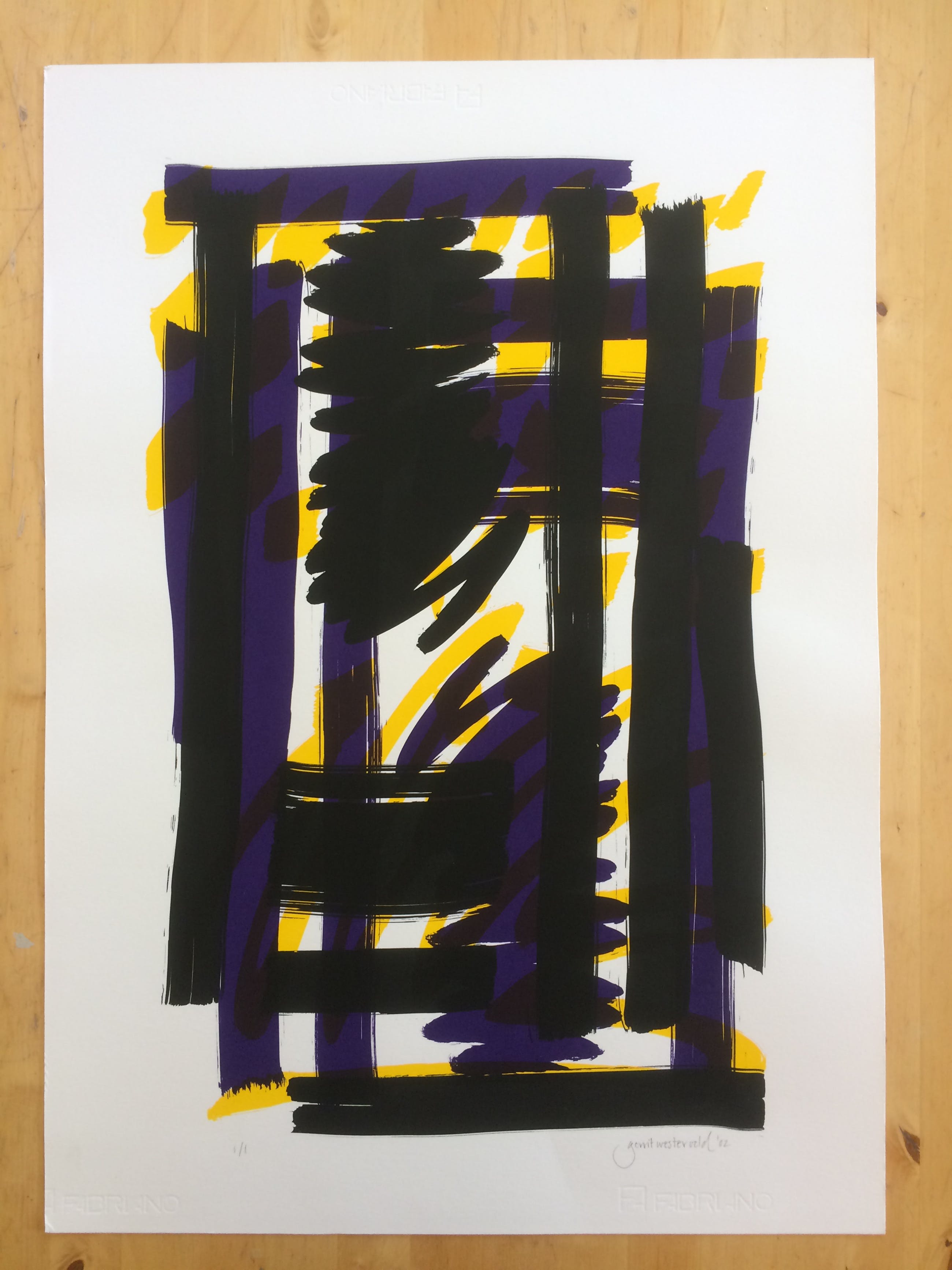 Mooie abstract werk van Gerrit Westerveld op zwaar Fabriano paper Jaar: 2002 Ondertekening: Handgesigneerd, genummerd en gedateerd in potlood Kleine oplage: 7. Dit item: 1/7 Afmetingen beeld: 58 x 38 cm. Afmetingen blad: 70 x 50 cm. Conditie: zeer goed. Nooit ingelijst geweest.