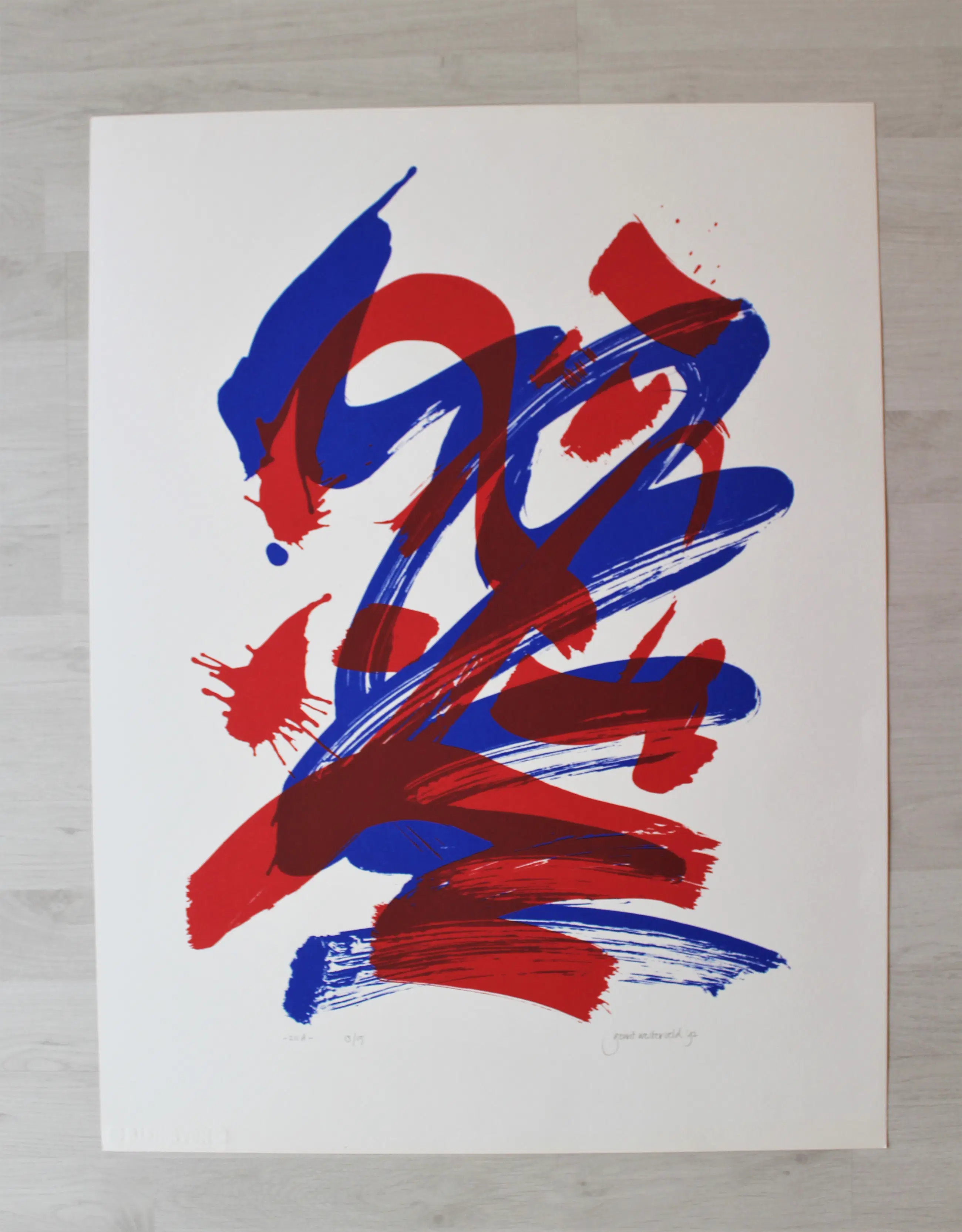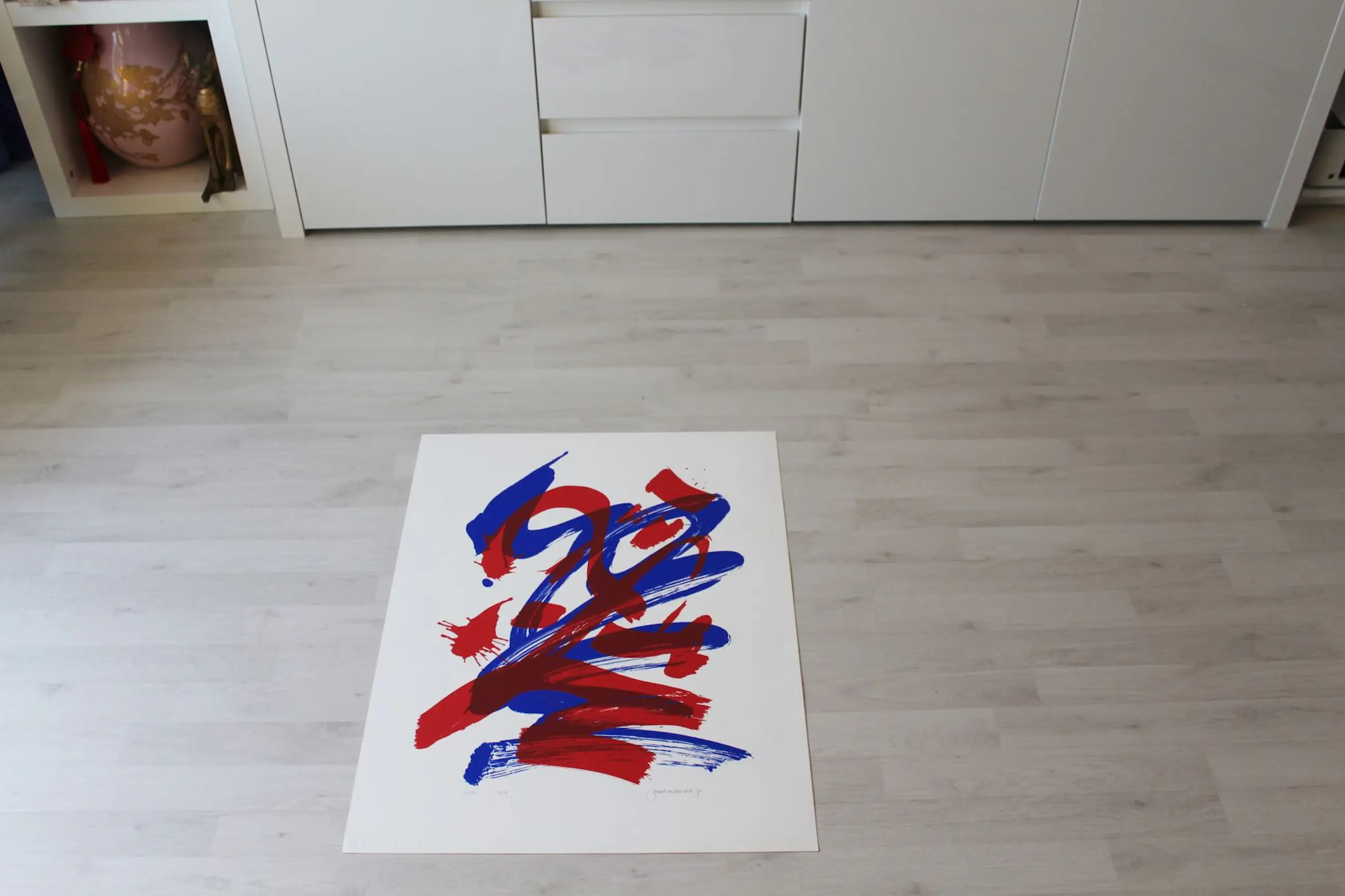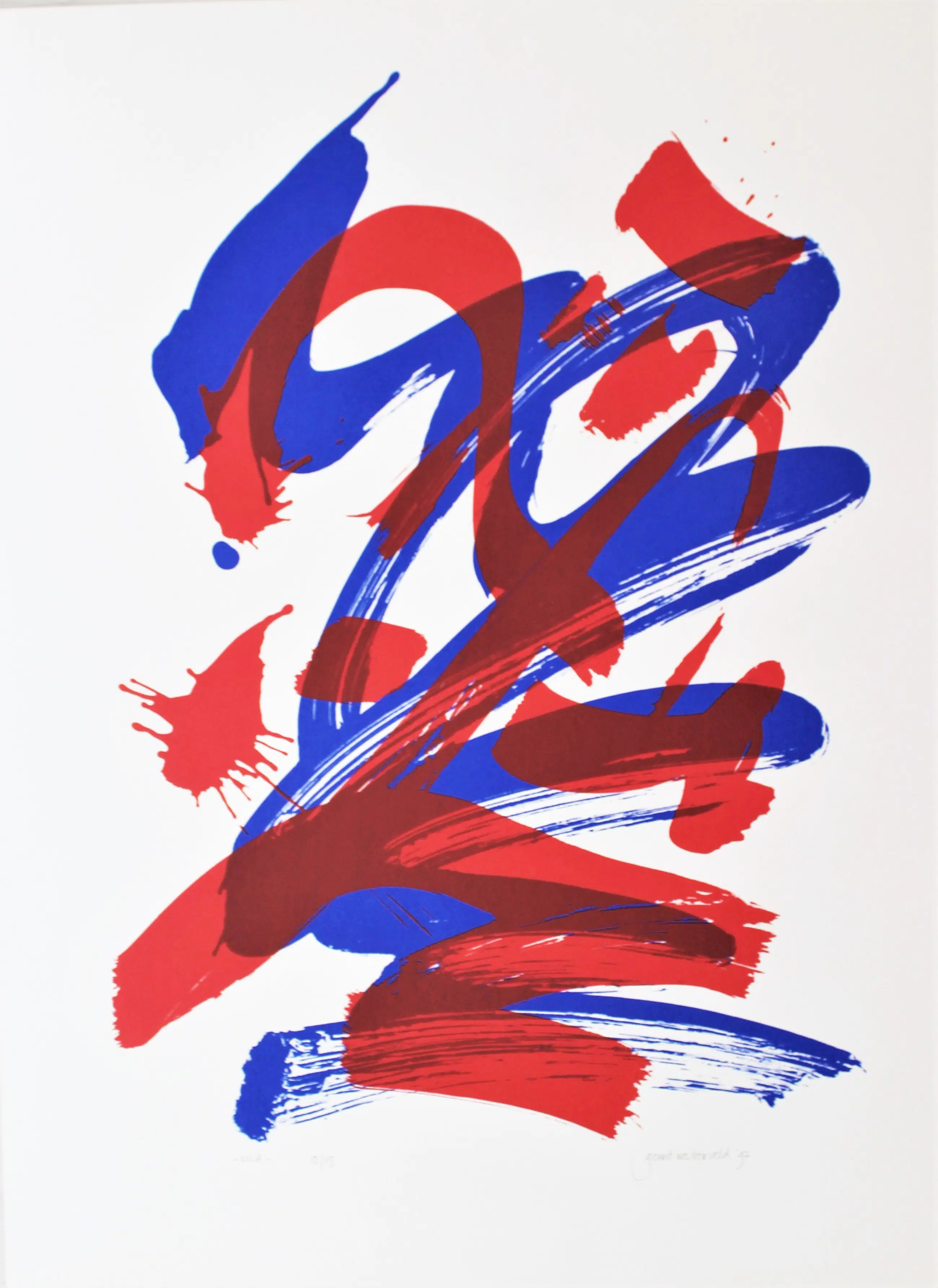Originele afbeelding van Gerrit Westerveld (*1949). Abstracte compositie, 1992. Techniek: Kleurenlithografie op handgemaakt papier. Beperkte oplage van 15 exemplaren. Handtekening en nummering aanwezig. In zeer goede staat.