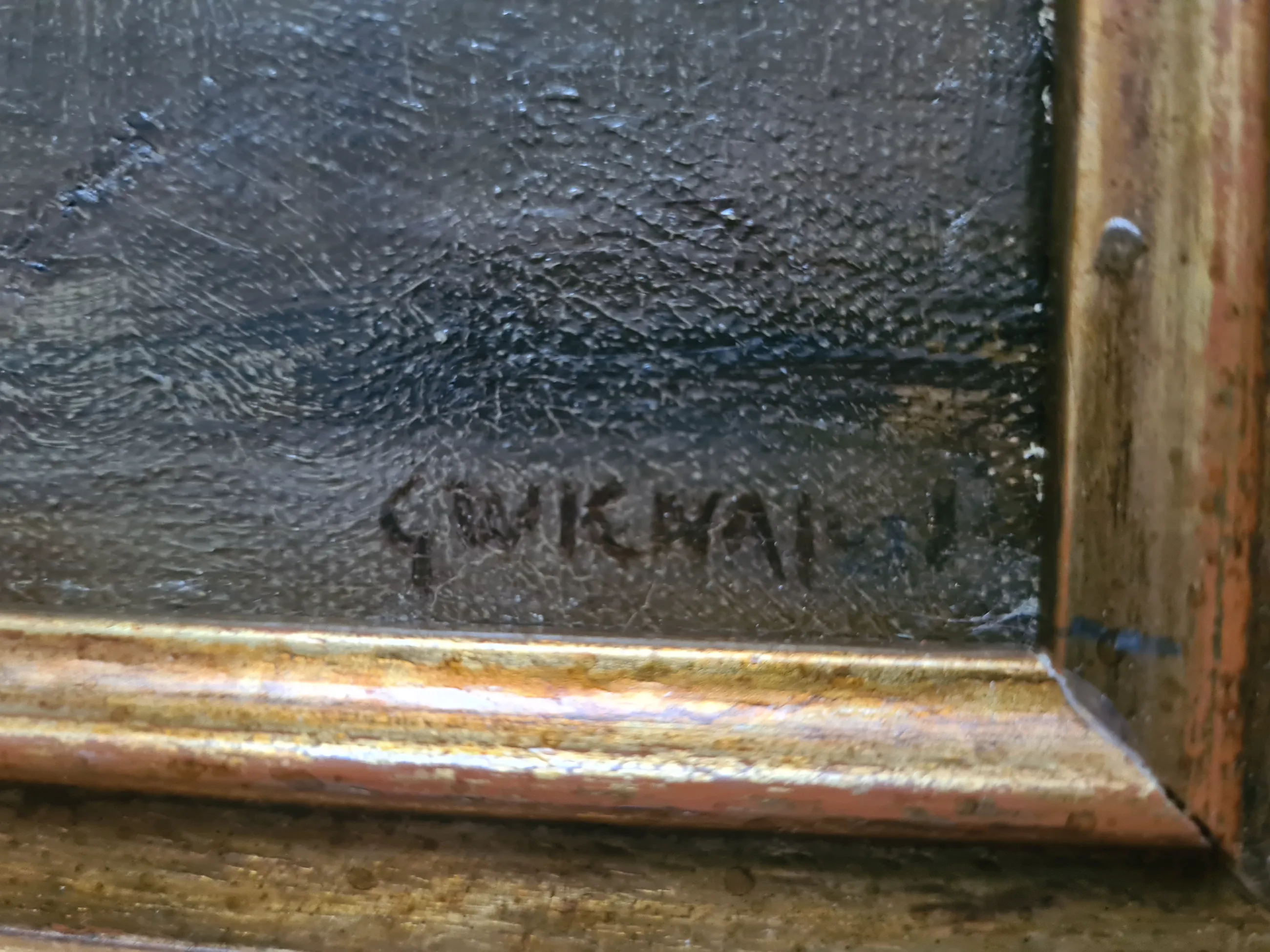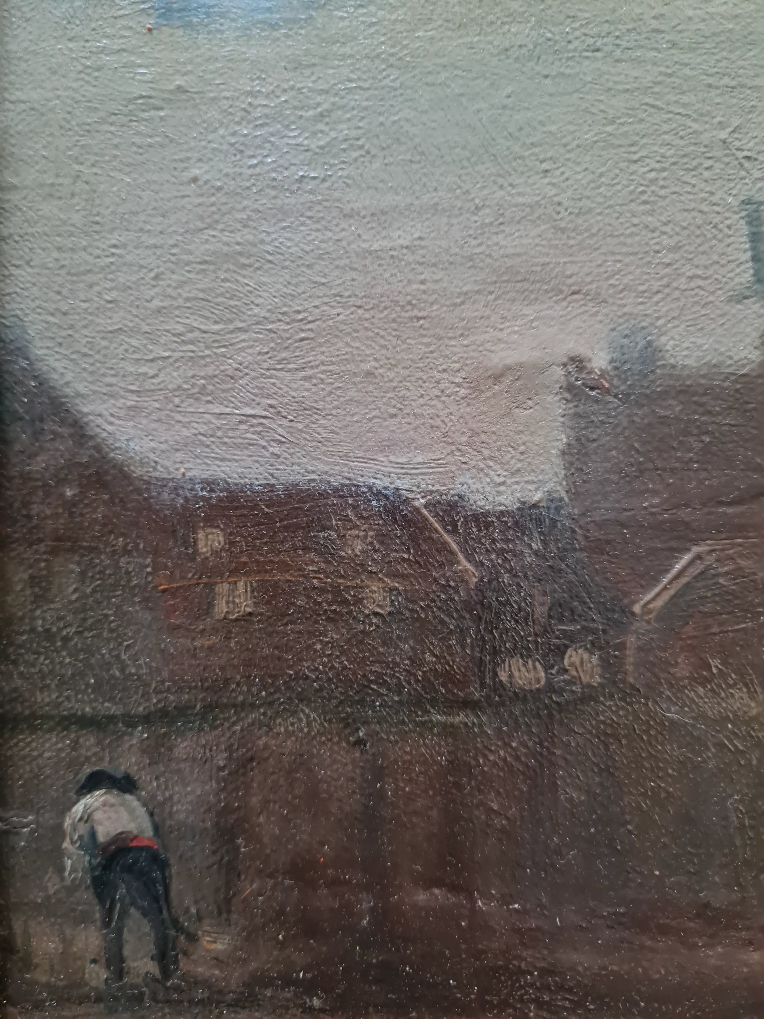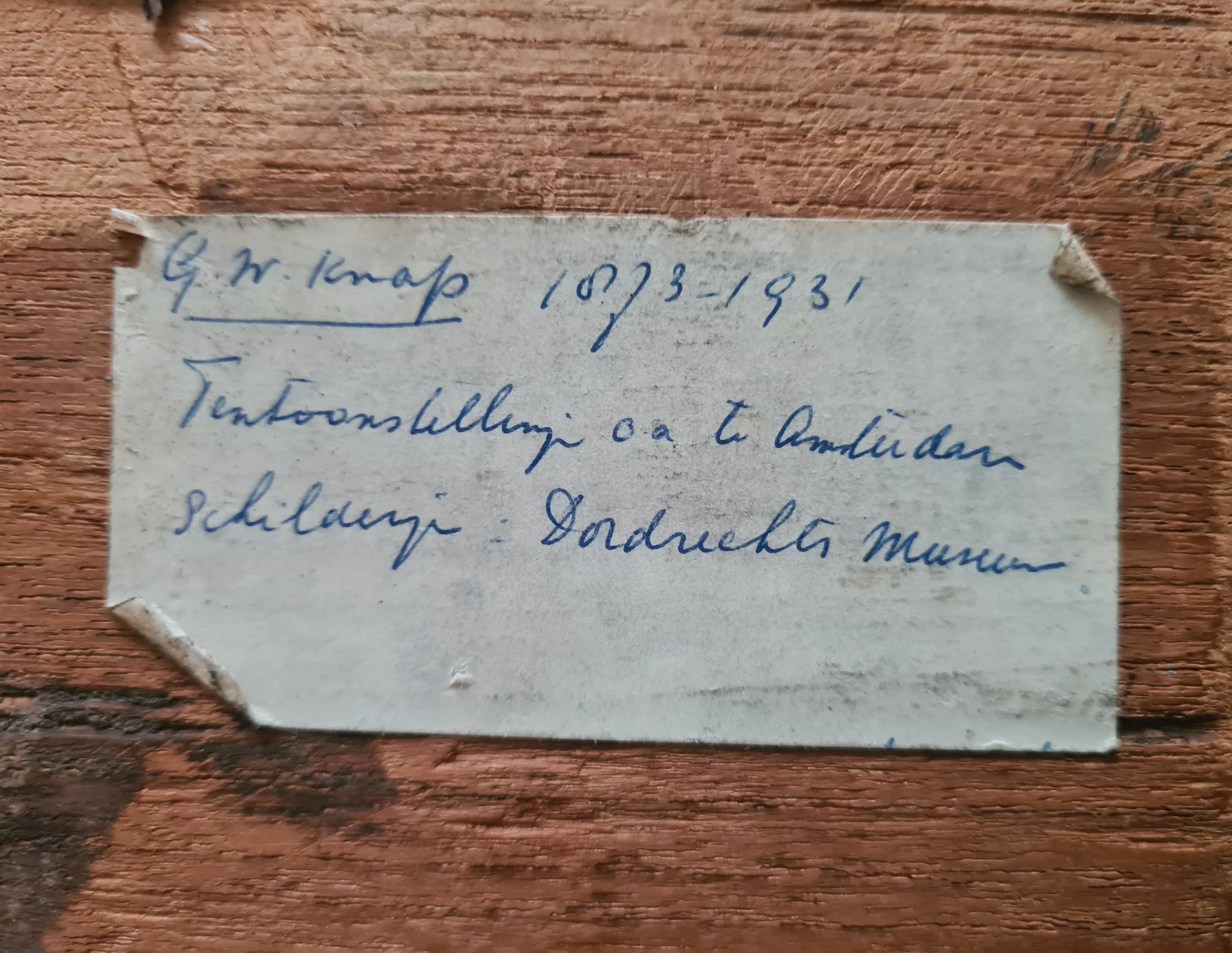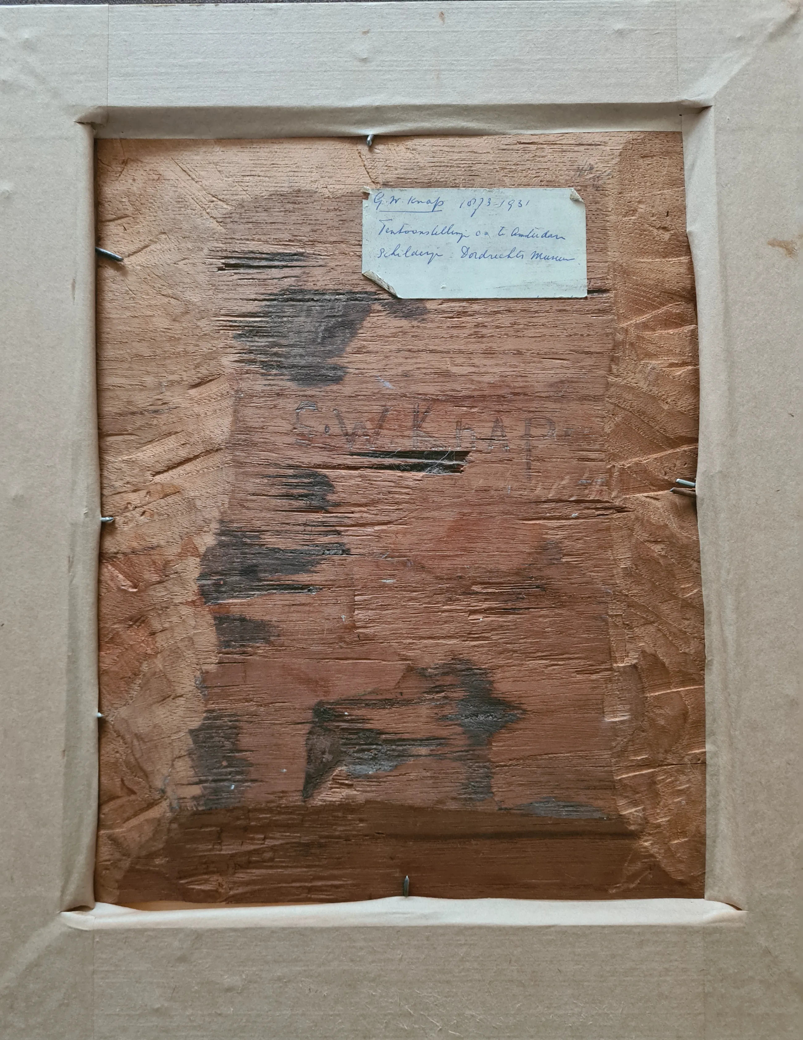 Gemaroufleerd op paneel, minimaal geretoucheerd. Desondanks verkeert dit werk in redelijk goede conditie.