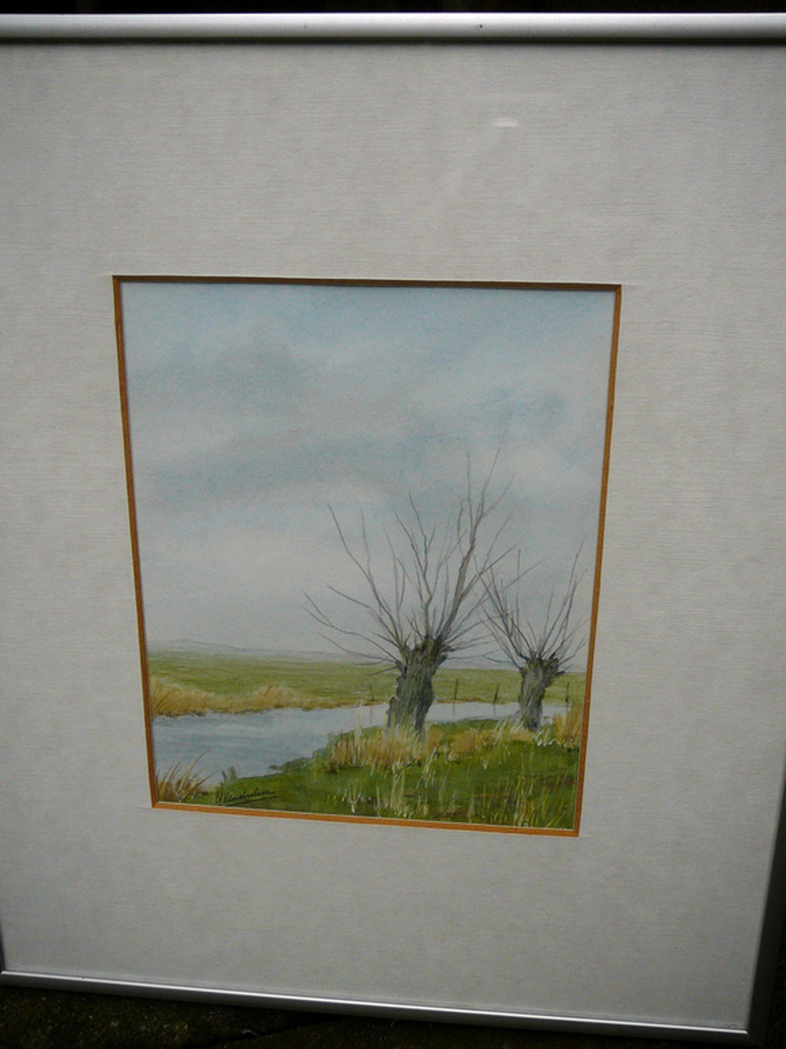 Verstild en sereen weidelandschap van de hand van Gert Hendriksen. Keurig gelijst achter passepartout en glas.