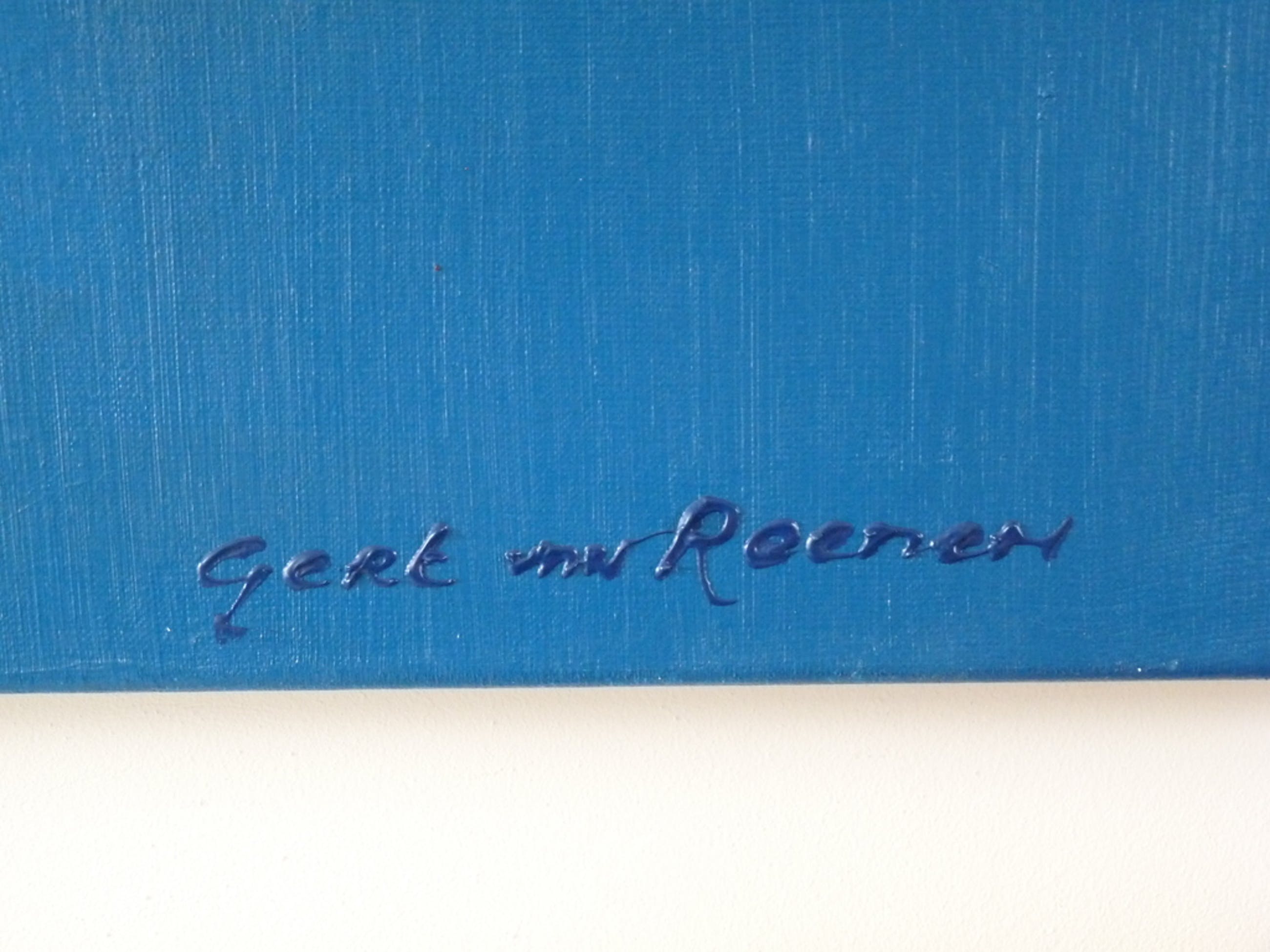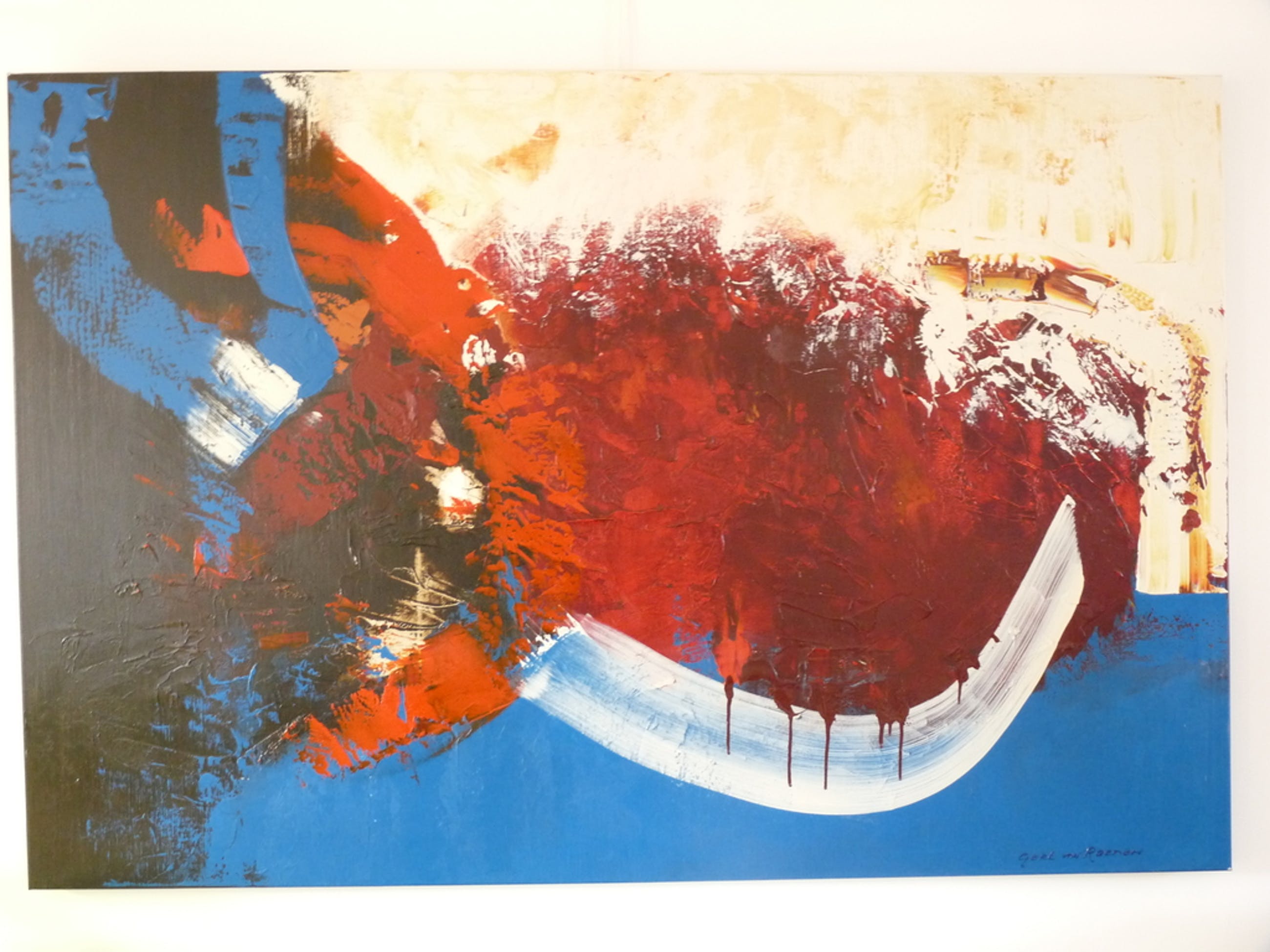 Afmeting 120x180 cm. Werk is niet gelijst, maar de zijkanten zijn meegeschilderd. Van rechter onderhoek is een klein stukje verf af.