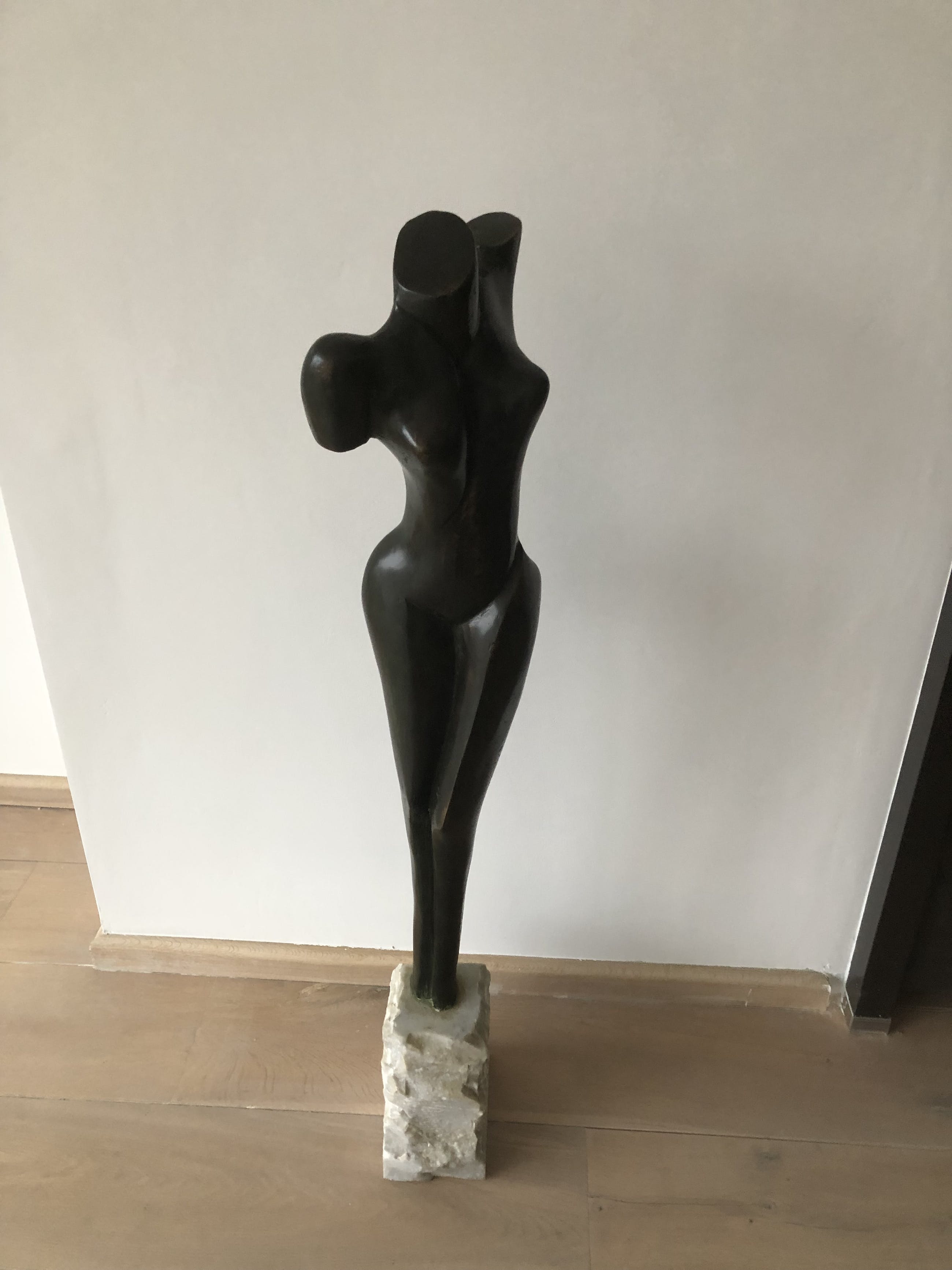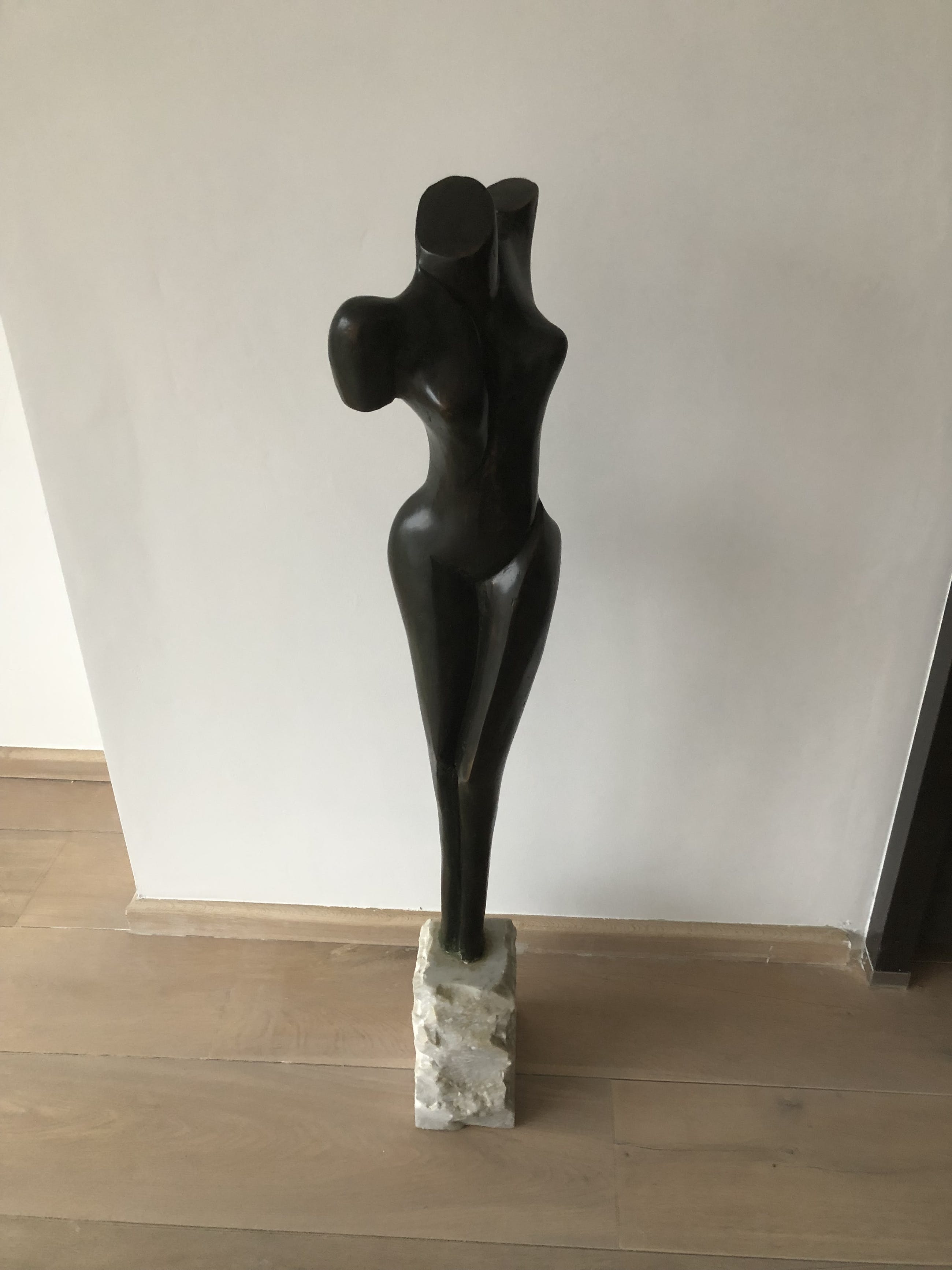 Prachtig vrouwenlichaam in brons, op een witte stenen sokkel uit 1994.