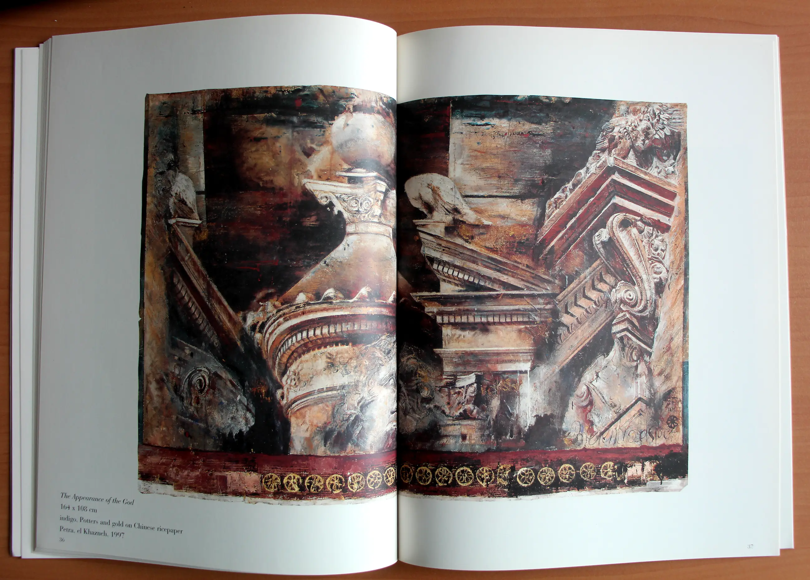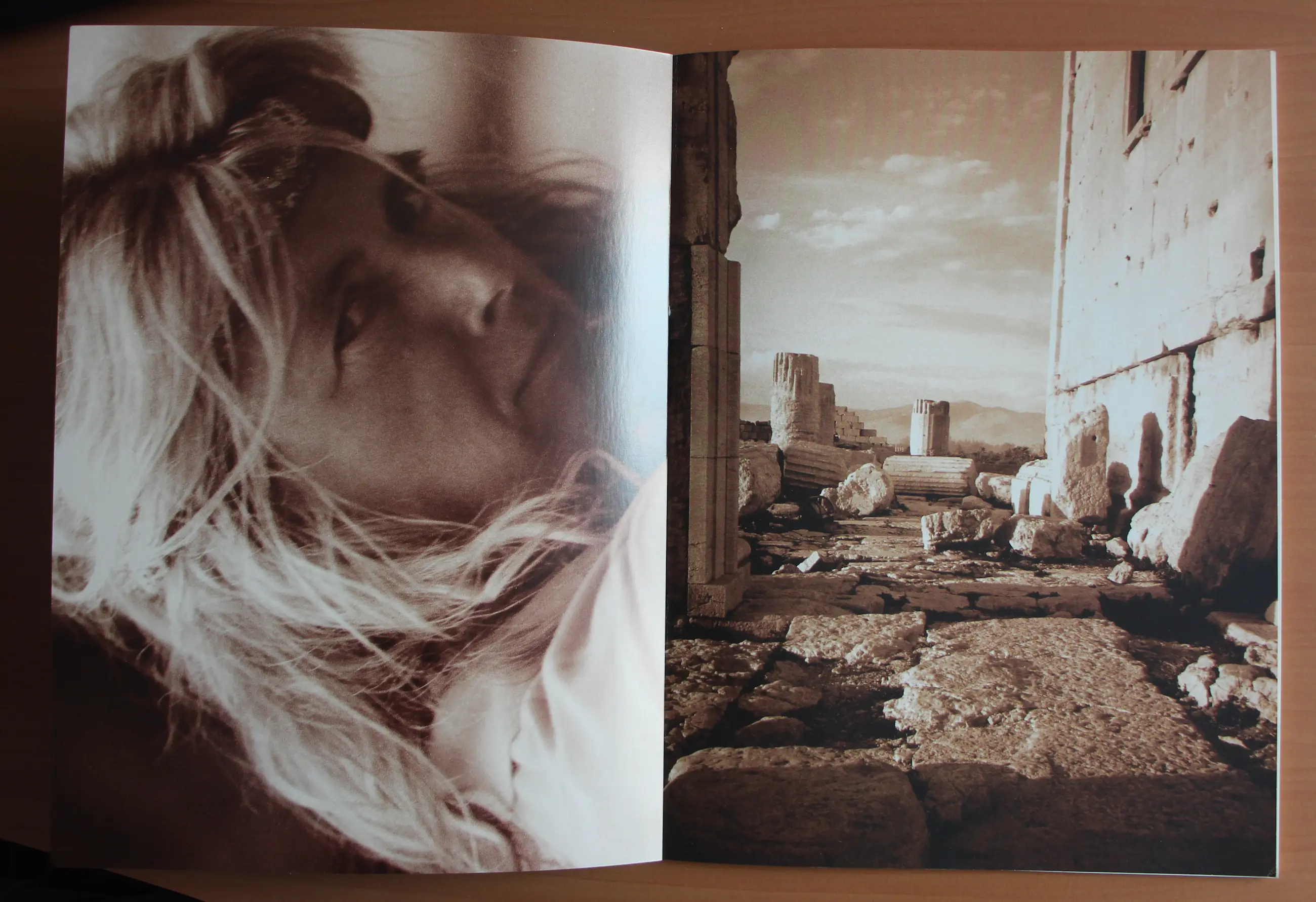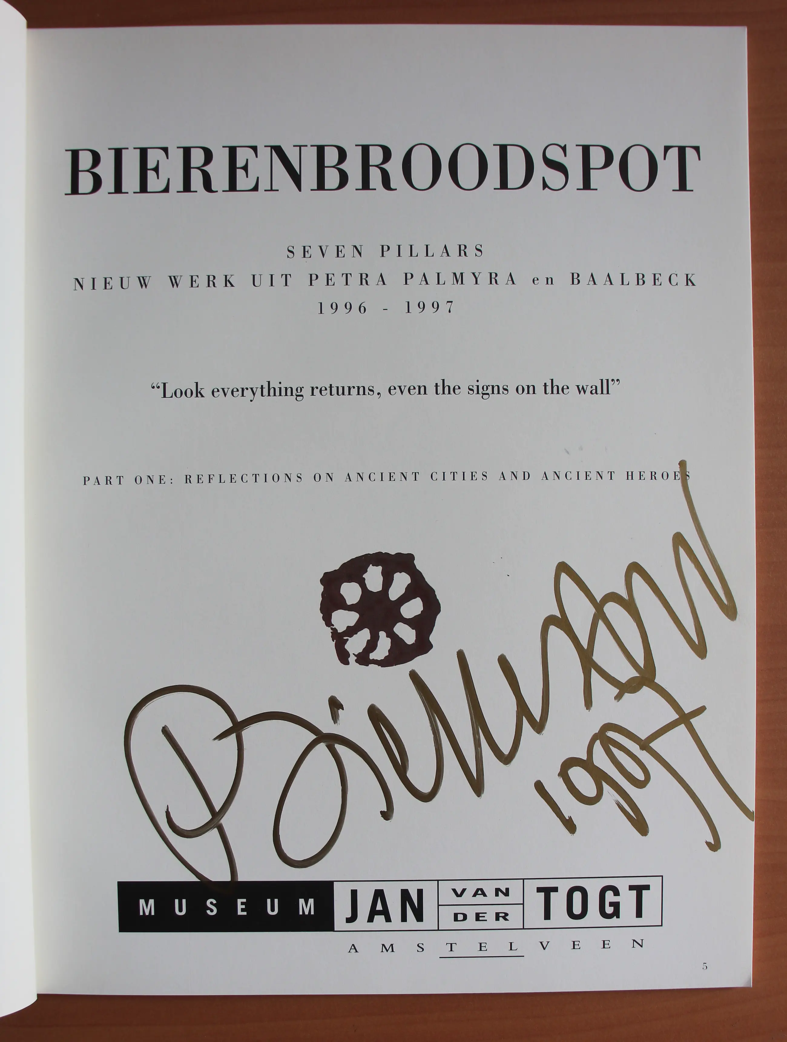 Gesigneerd boek van Gerti Bierenbroodspot. Titel: Seven pillars, nieuw werk uit Petra, Palmyra en Baalbeck. Jaar: 1996/1997. Uitgegeven door Museum Jan van den Togt. Aantal blz: 56.