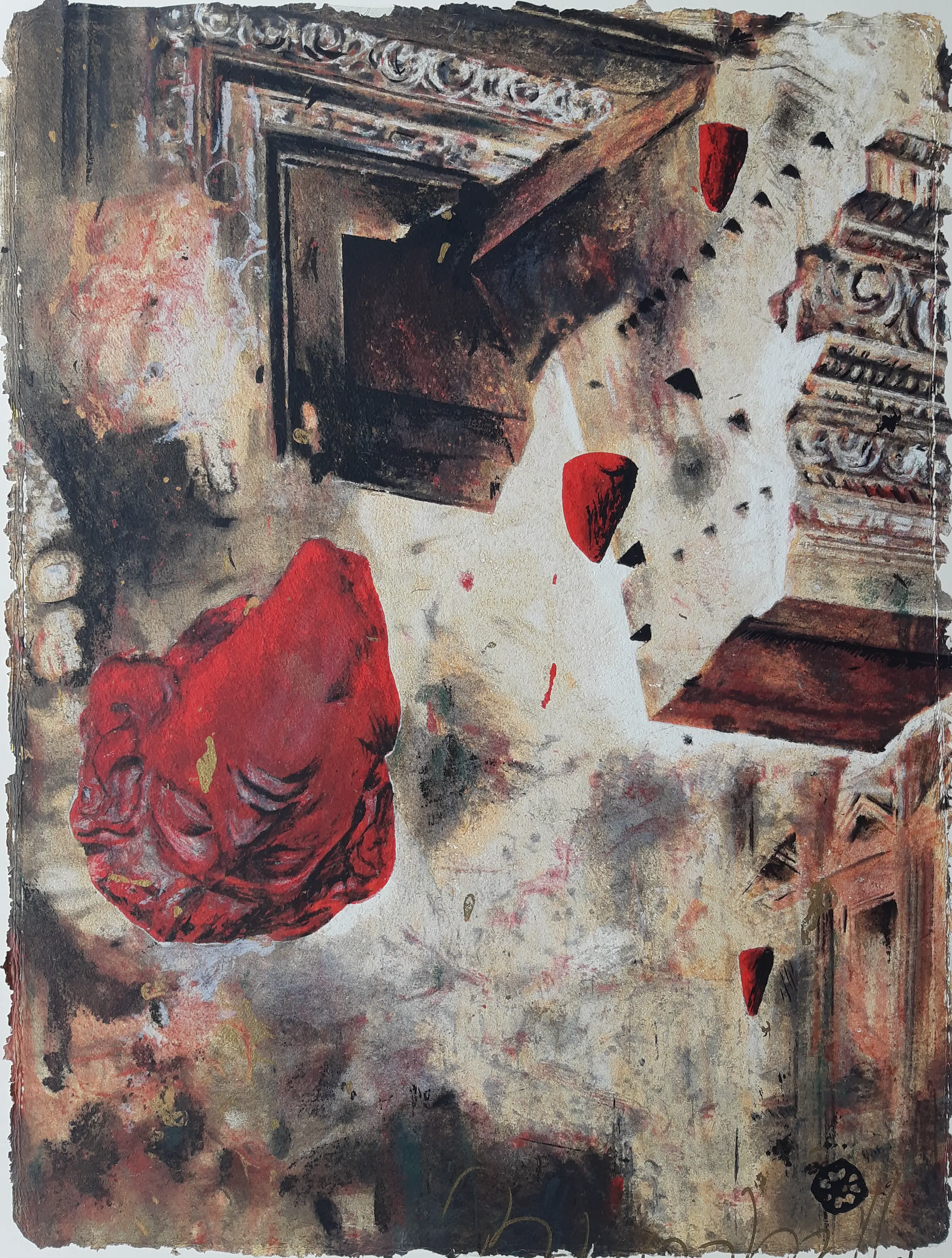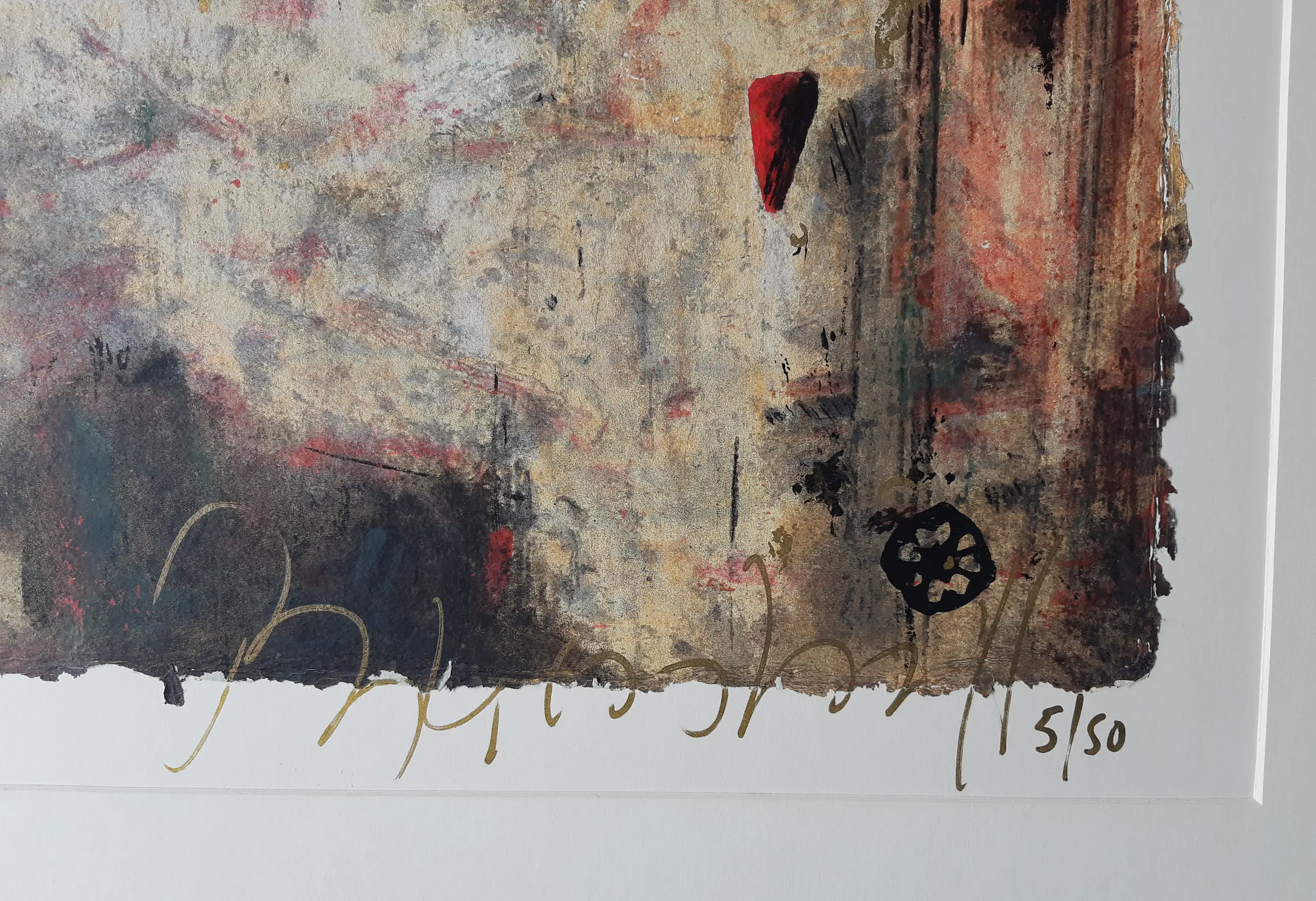 Grote litho van Gerti Bierenbroodspot, door de maker met een goudkleurige marker gesigneerd en genummerd. Gedrukt op geschept papier en gelijmd op dik achterblad, waardoor de bedrukte papierrandjes zichtbaar zijn (zie foto's). Stijlvol zonder glas ingelijst in een houten lijst. Het geheel verkeert in nieuwstaat.