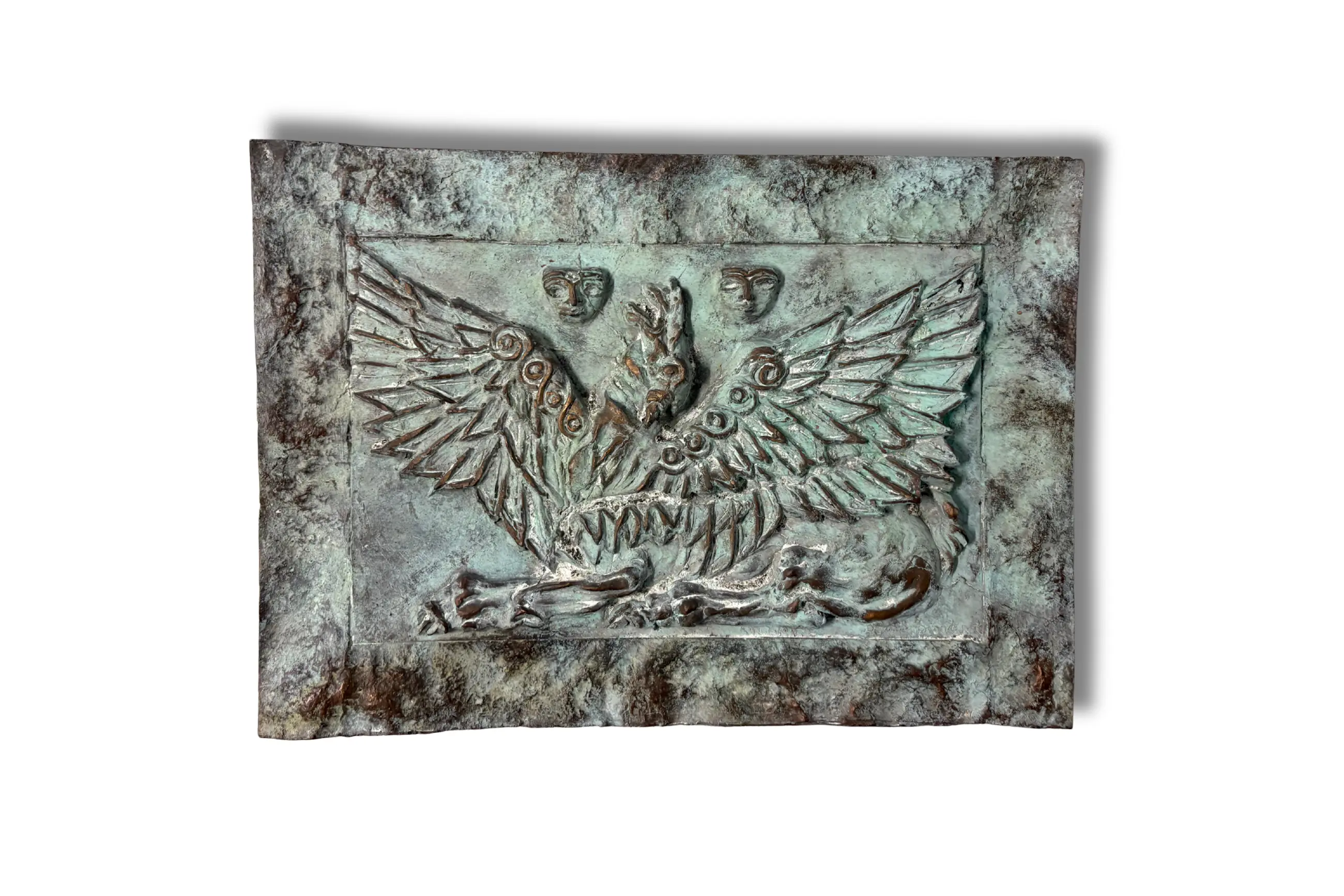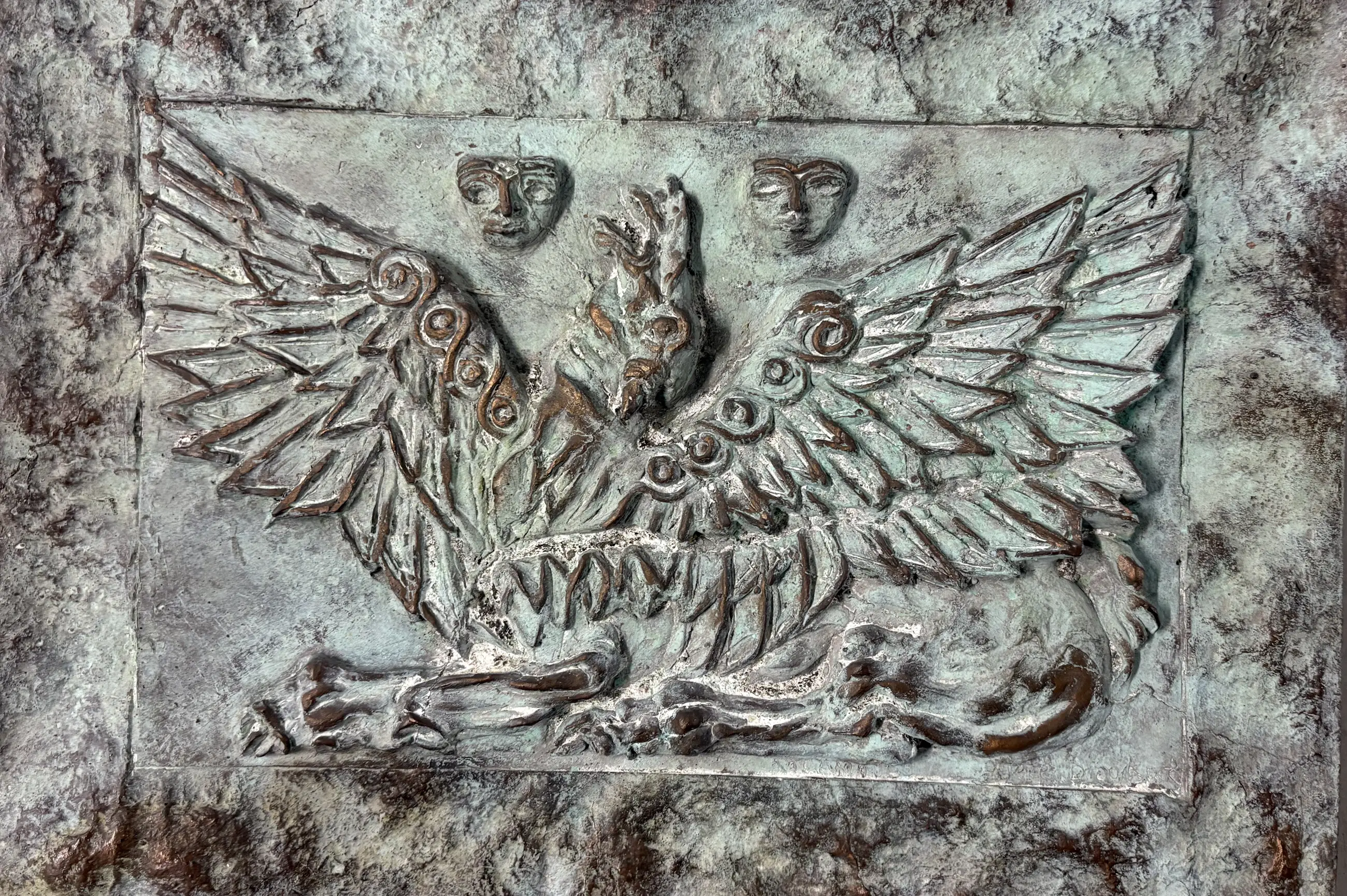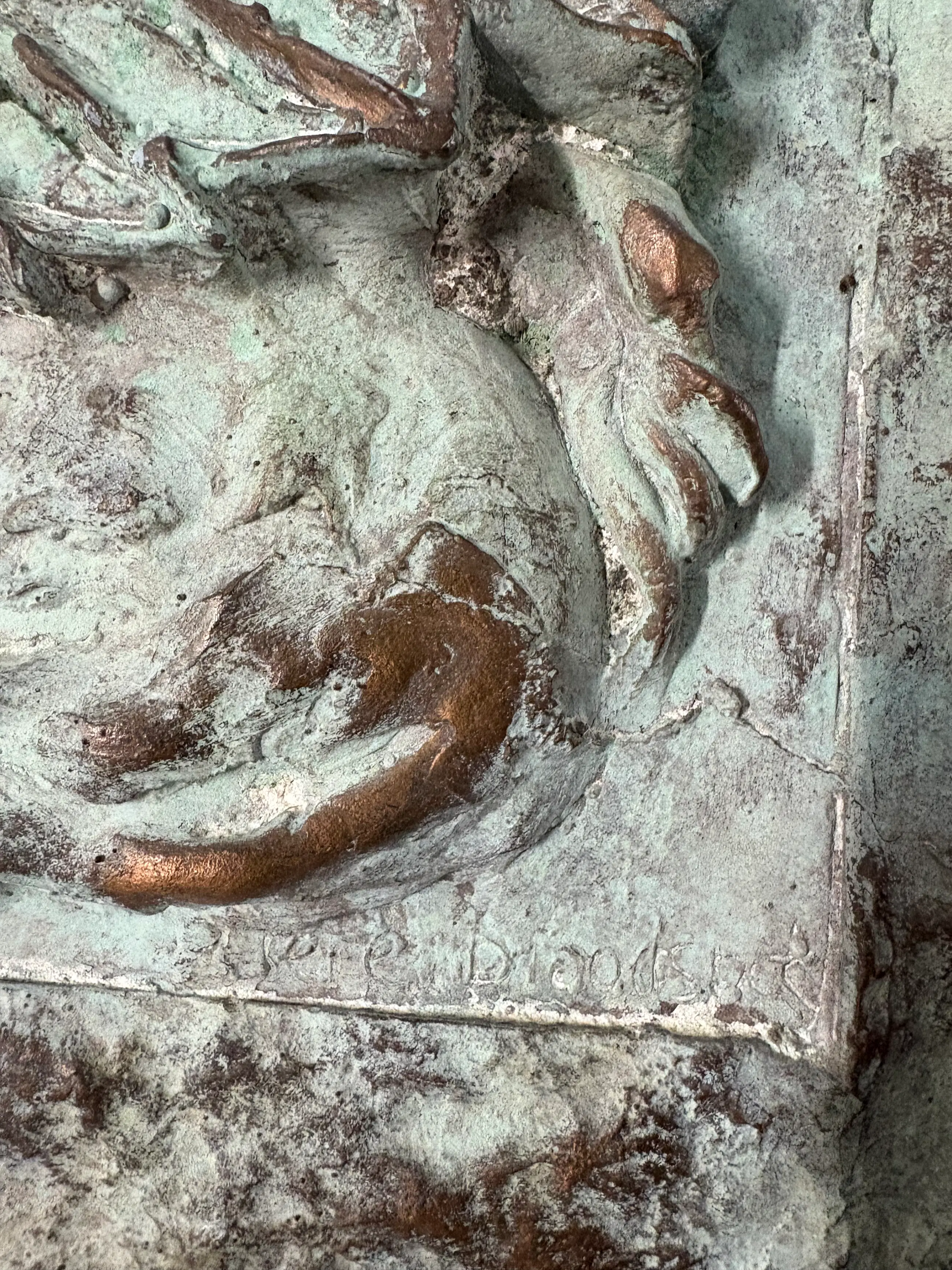 Dit bronze werk kan aan de muur vast gemaakt worden aan de achterkant. Is ook geschikt voor buiten.