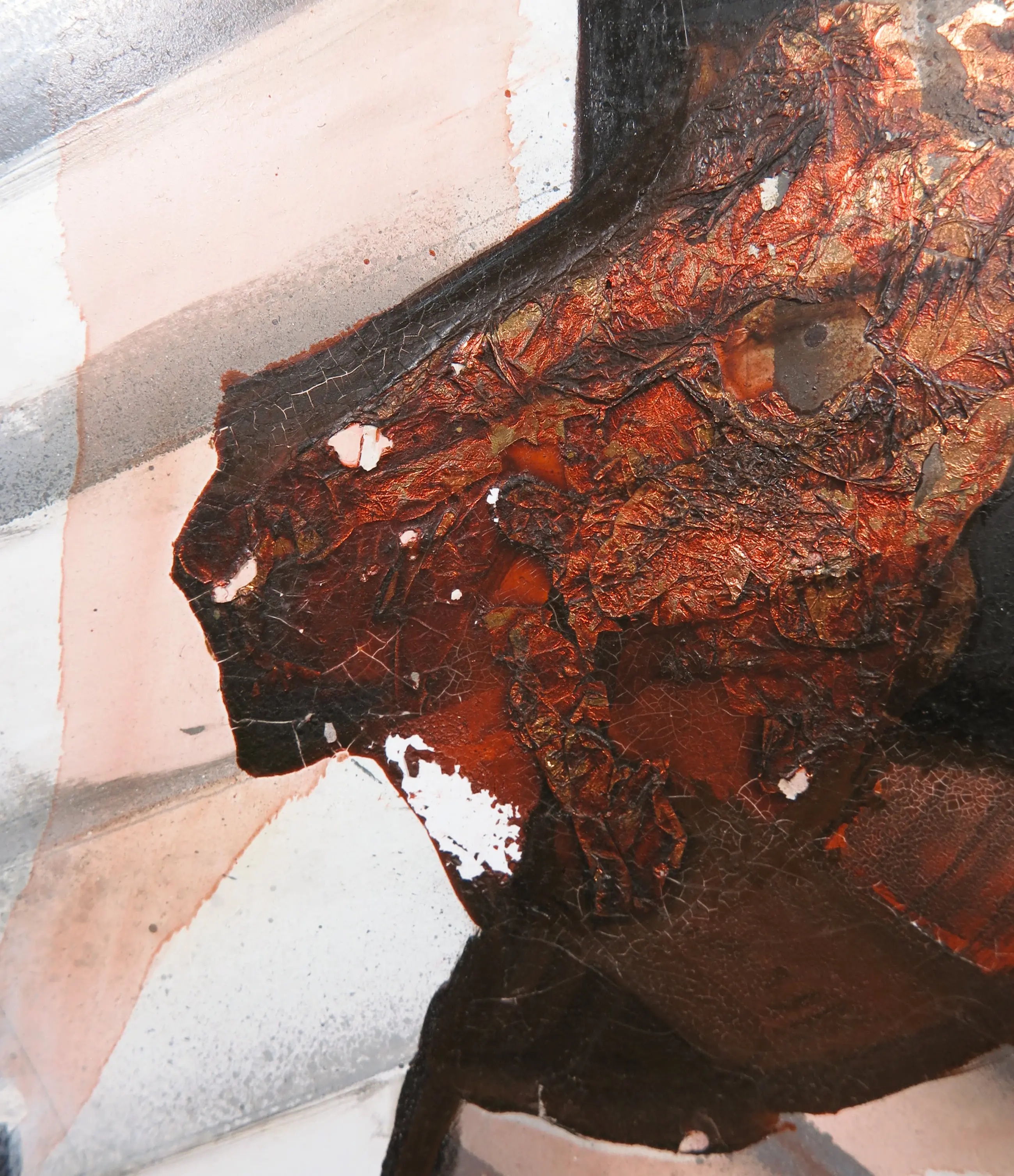 | Het werk is in redelijke staat. Voornamelijk op de linkerzijde is er in de rode en zwarte partijen aardig wat craquelé te zien. Ook heeft er hier op een aantal plekken de verf geheel losgelaten, zoals is te zien op de foto's. Aan de rechterzijde van de compositie zijn er wat vlekken te zien. | |