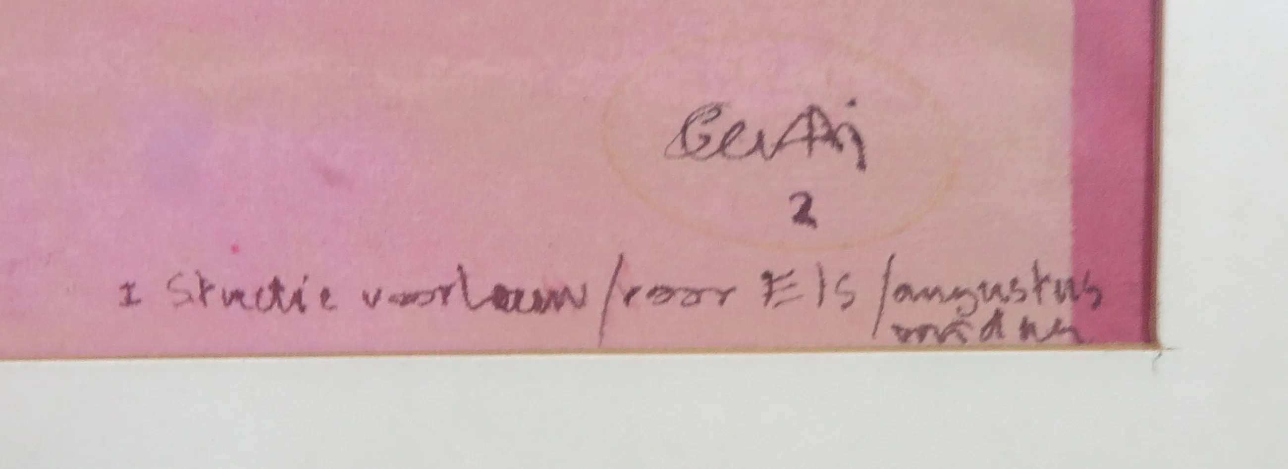 Het passe-Partout is enigszins wat vergeeld met hier en daar wat vlekken. Ook is er aan de rechterzijde van de tekening op het passe-partout een streep in potlood te zien, onduidelijk is het of dit de intentie van de kunstenares was. De pentekening is in goede staat met aan de linkerhoek een lichte golving in het papier. | |