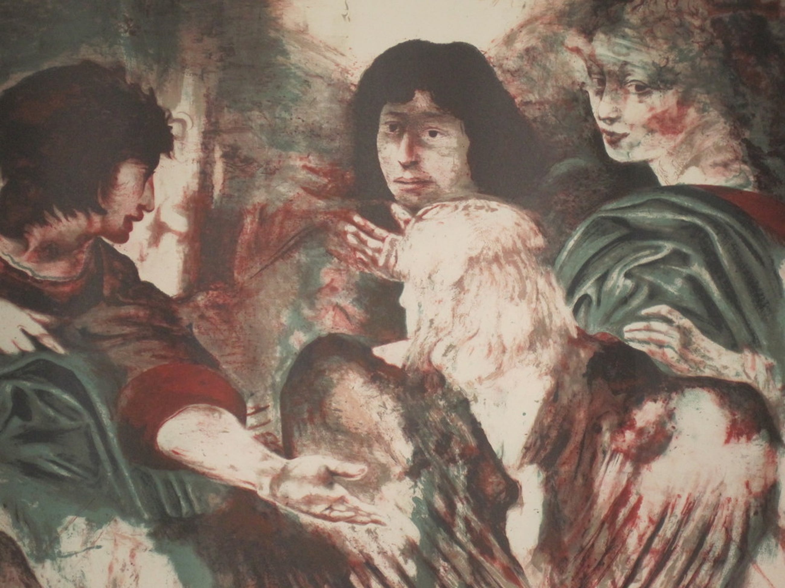 Afbeelding: Bijbelse voorstelling met een aartsengel (Michael?) (zie foto met titel litho) en twee helpers.