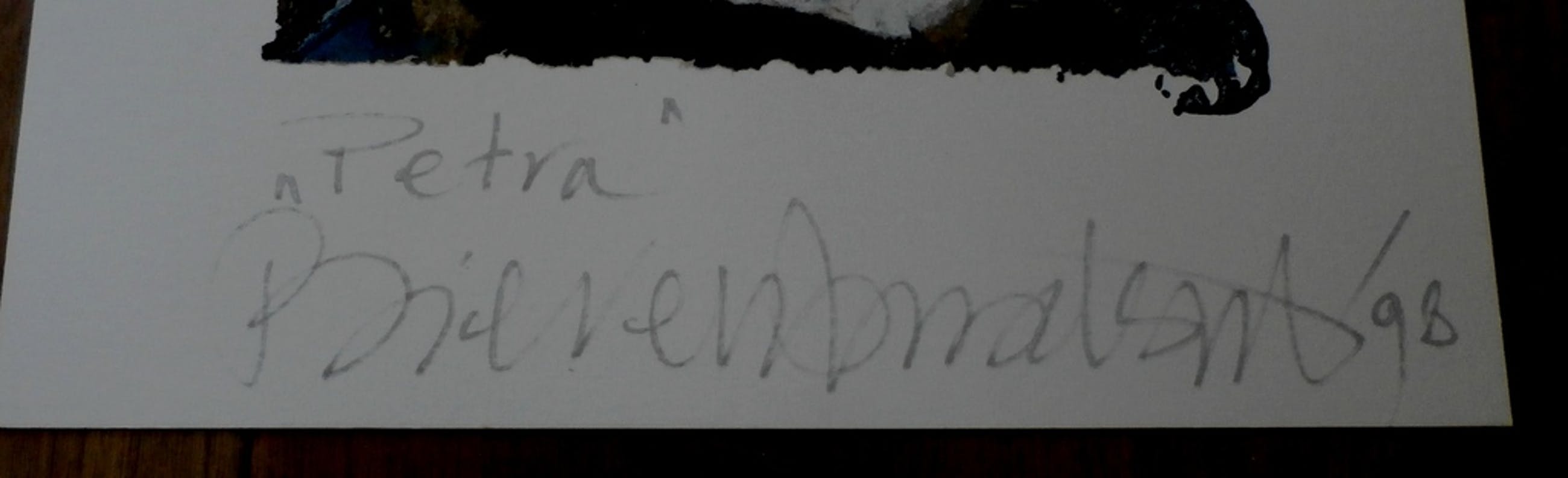 De afmetingen zijn ca.25x31. De afbeelding is gedrukt op handgeschept rijstpapier met goud. Voorzien van haar handtekening met stift. Bijzonder is dat het hier gaat om een ongenummerde ‘Hors Commerce’ druk uit een zeer kleine oplage, handmatig voorzien van haar stempel in de rechterbenedenhoek. De zeefdruk is nooit ingelijst geweest. (Tot voor enkele jaren was deze zeefdruk in de genummerde versie -zonder stempel- verkrijgbaar bij galerie Morren in Utrecht voor ca. 900 euro). Dit is een uniek stuk van grote kwaliteit.
