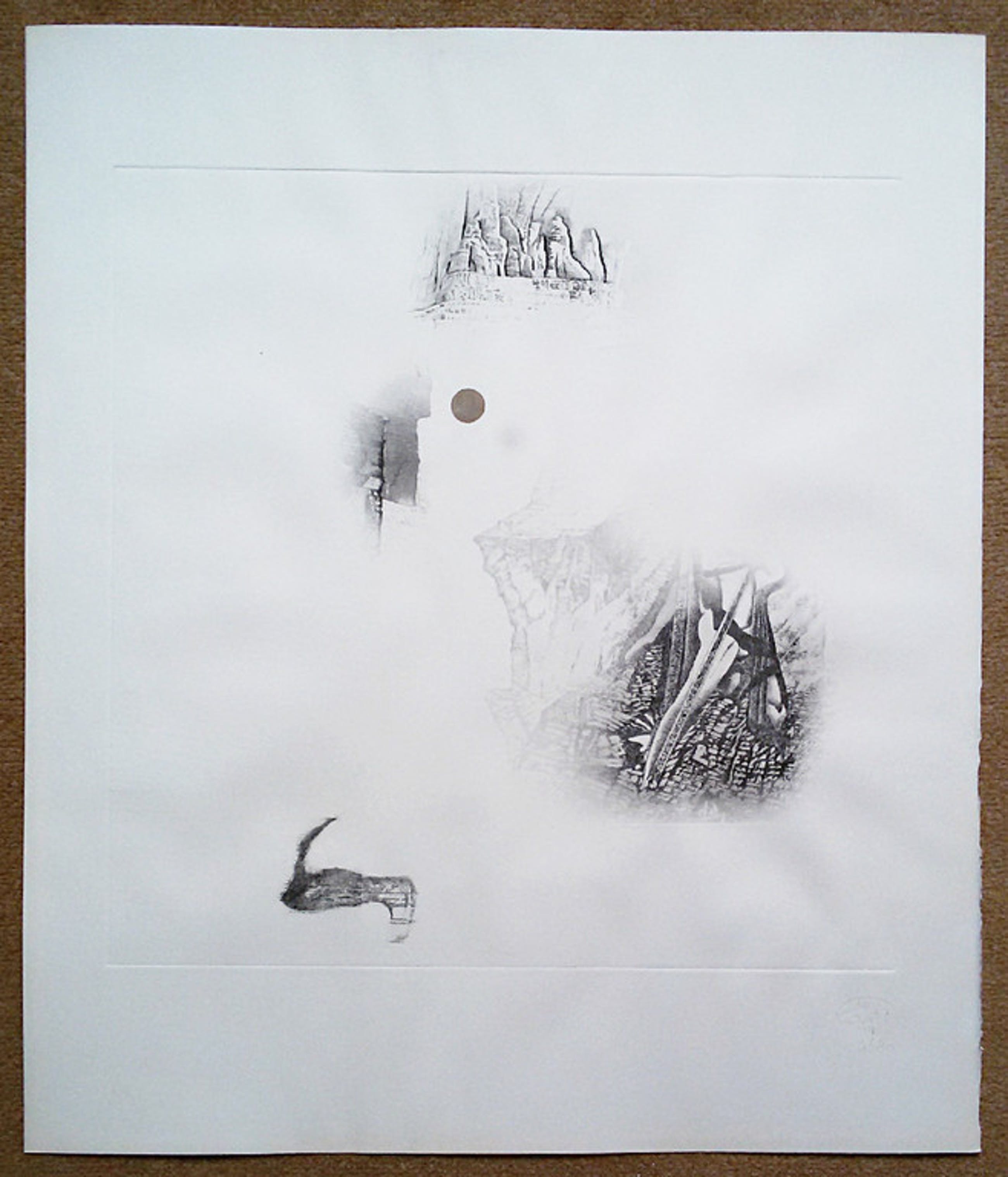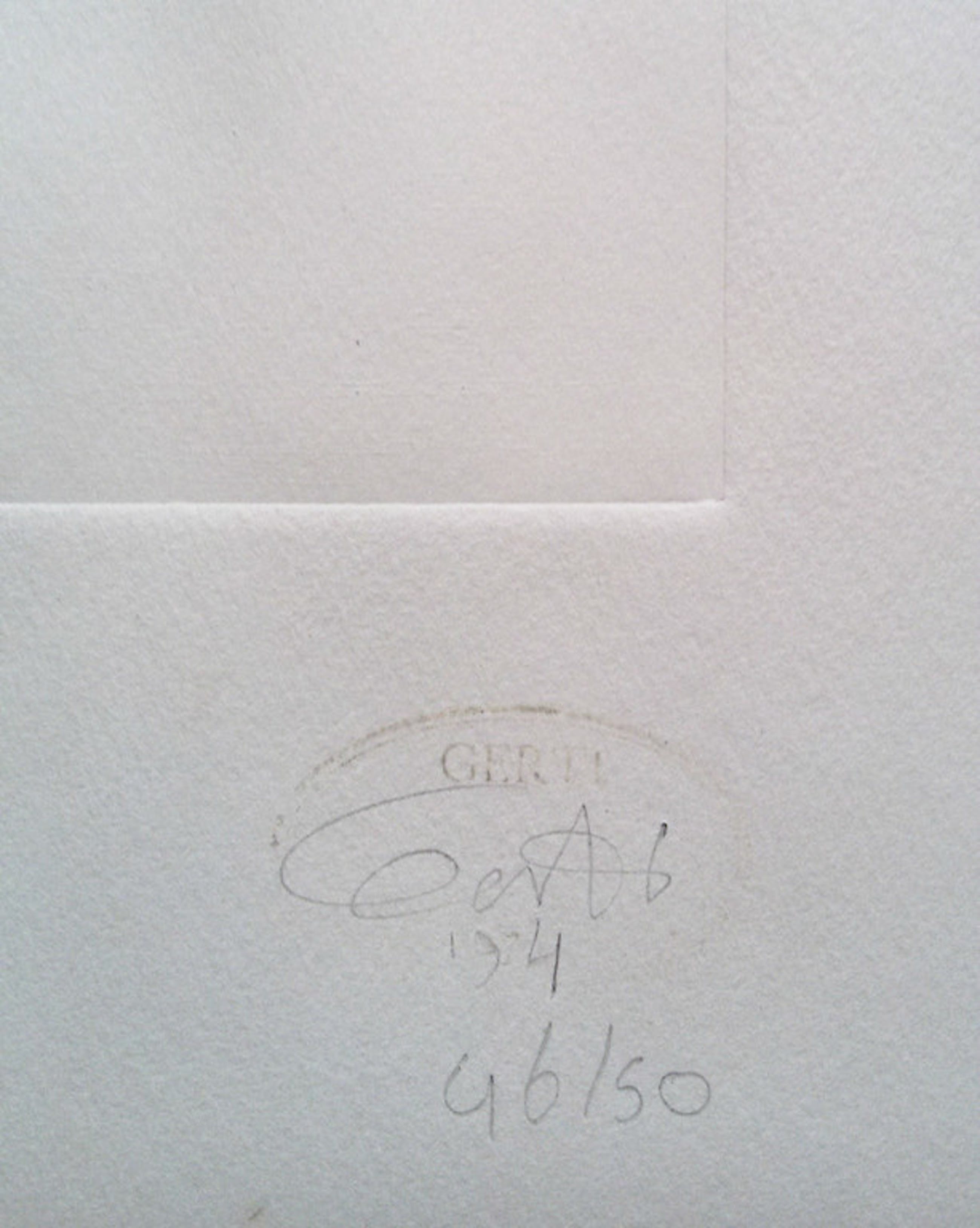 Intrigerende, karakteristieke ets van Gerti Bierenbroodspot op geschept papier. Flarden met archeologische locaties en een bruine stip, ik krijg er een “2001: a Space Odyssey” gevoel bij. Met potlood gesigneerd, gedateerd (1974) en genummerd (46/50). In zeer goede conditie.