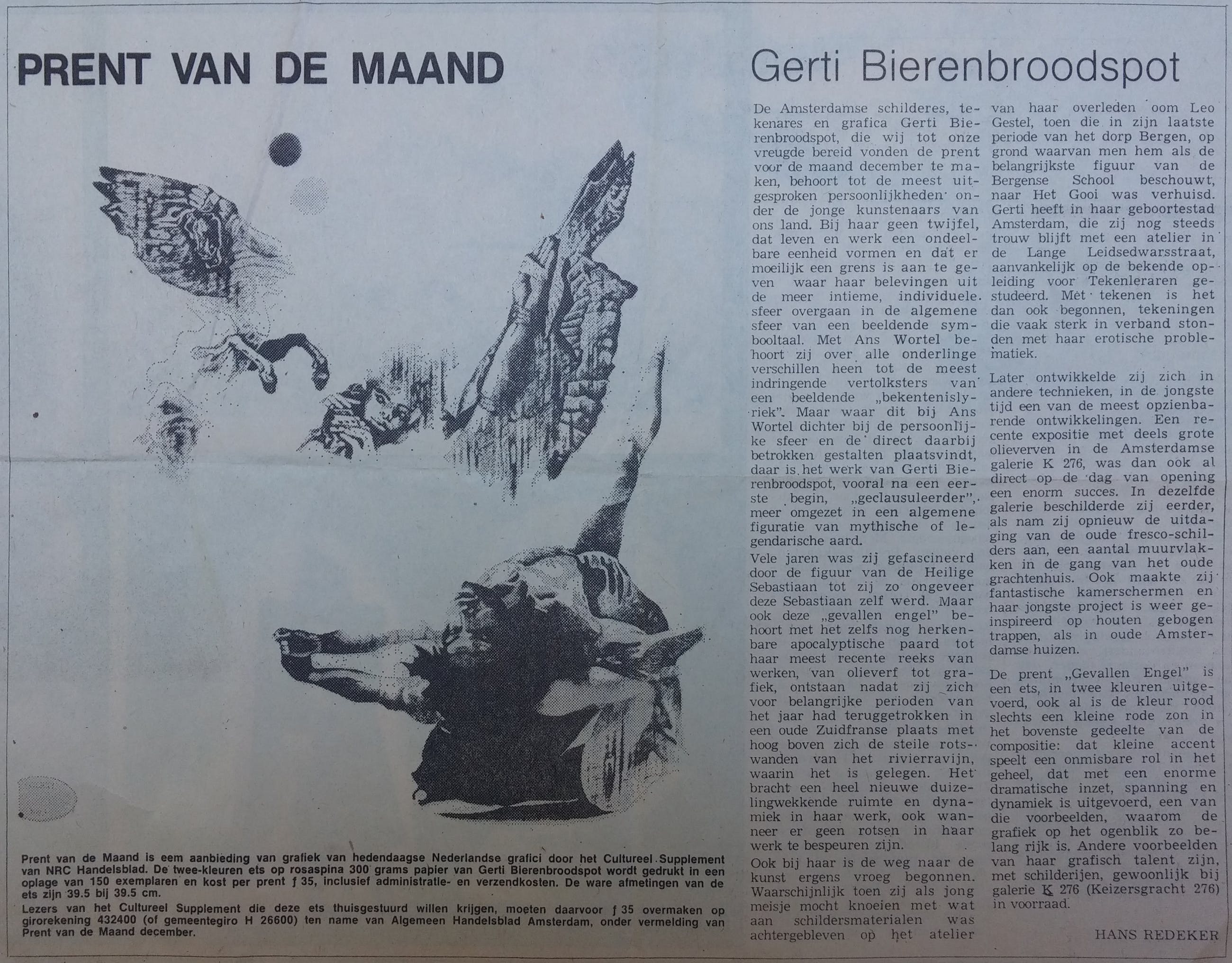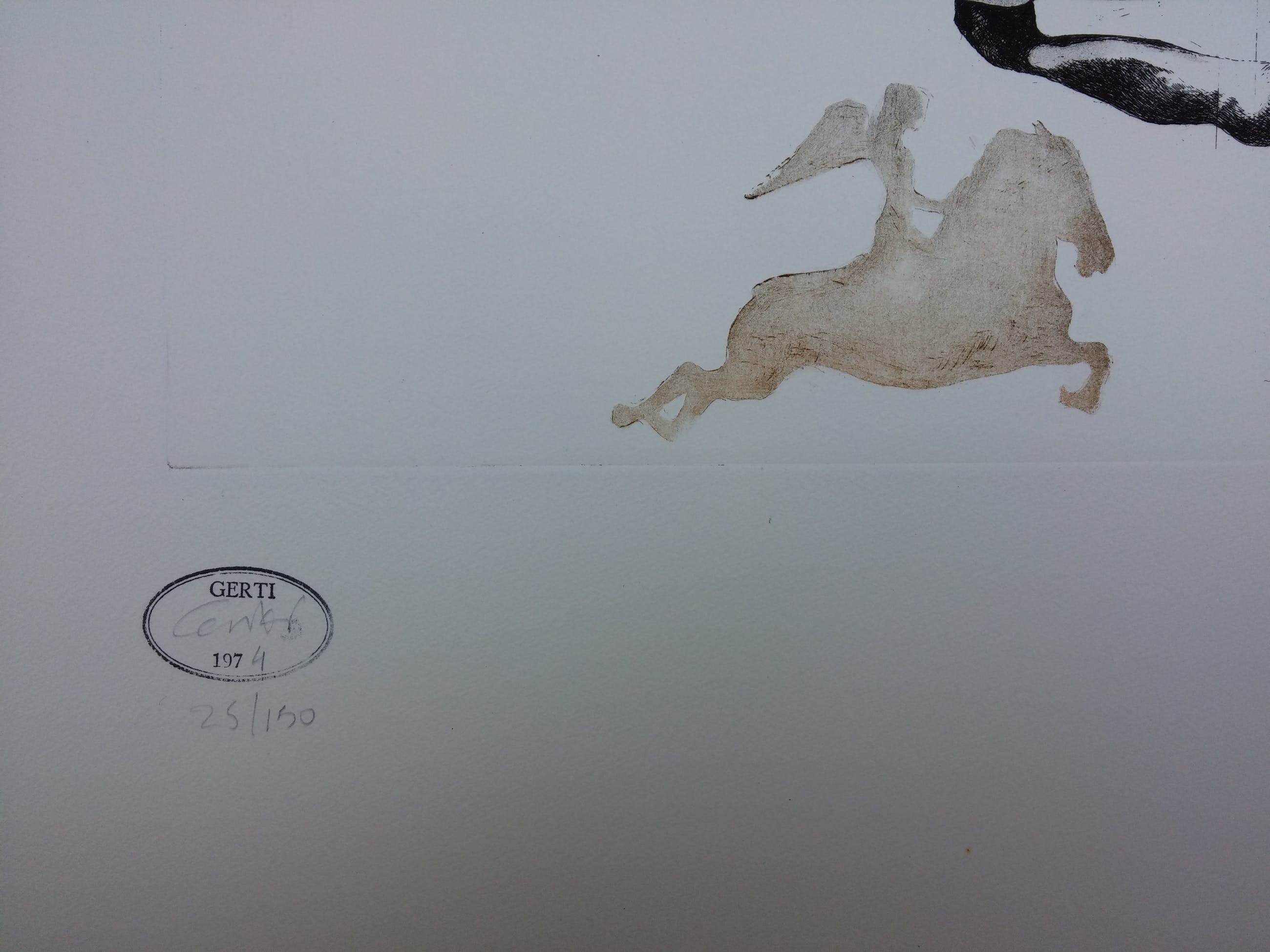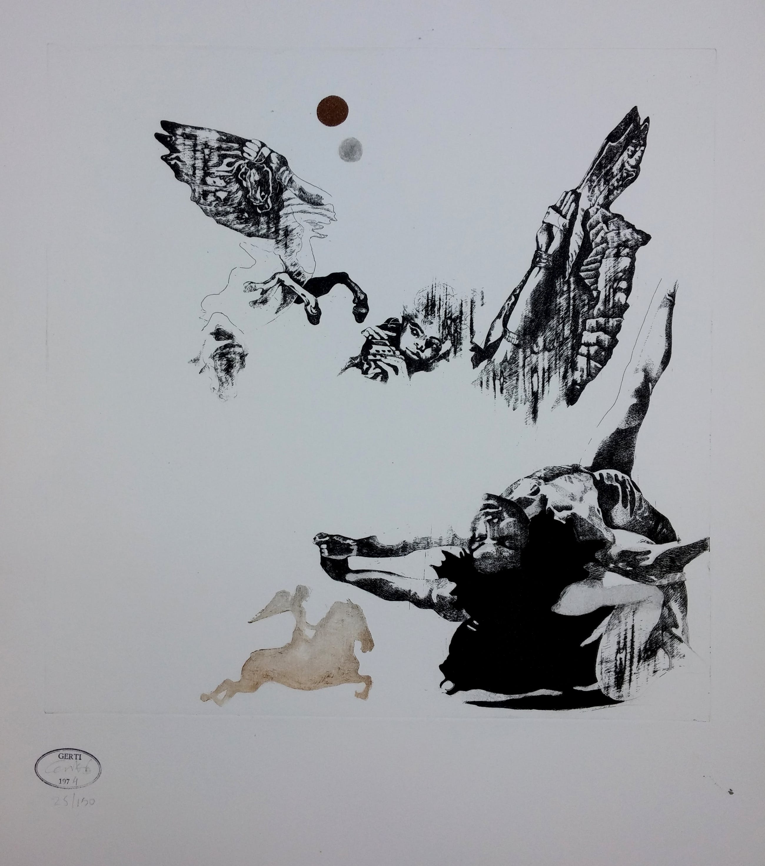 40x40 is het beeld. Papier is 78x55 cm. Met stempel. Exemplaar met extra vliegend paard. Prent van de maand NRC 1974.