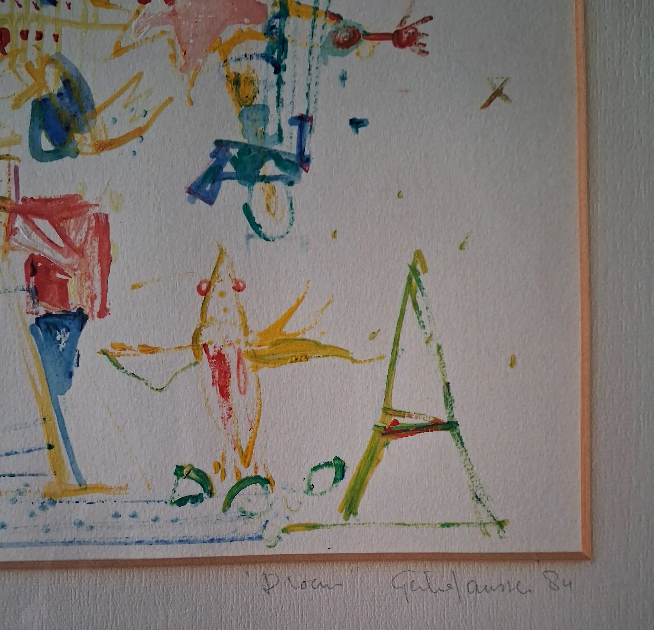 Prachtig, origineel kleurrijk, abstract werk van Gertie Janssen. Handgesigneerd Met smalle goudkleurige BARTH lijst en passepartout, ophangklaar!