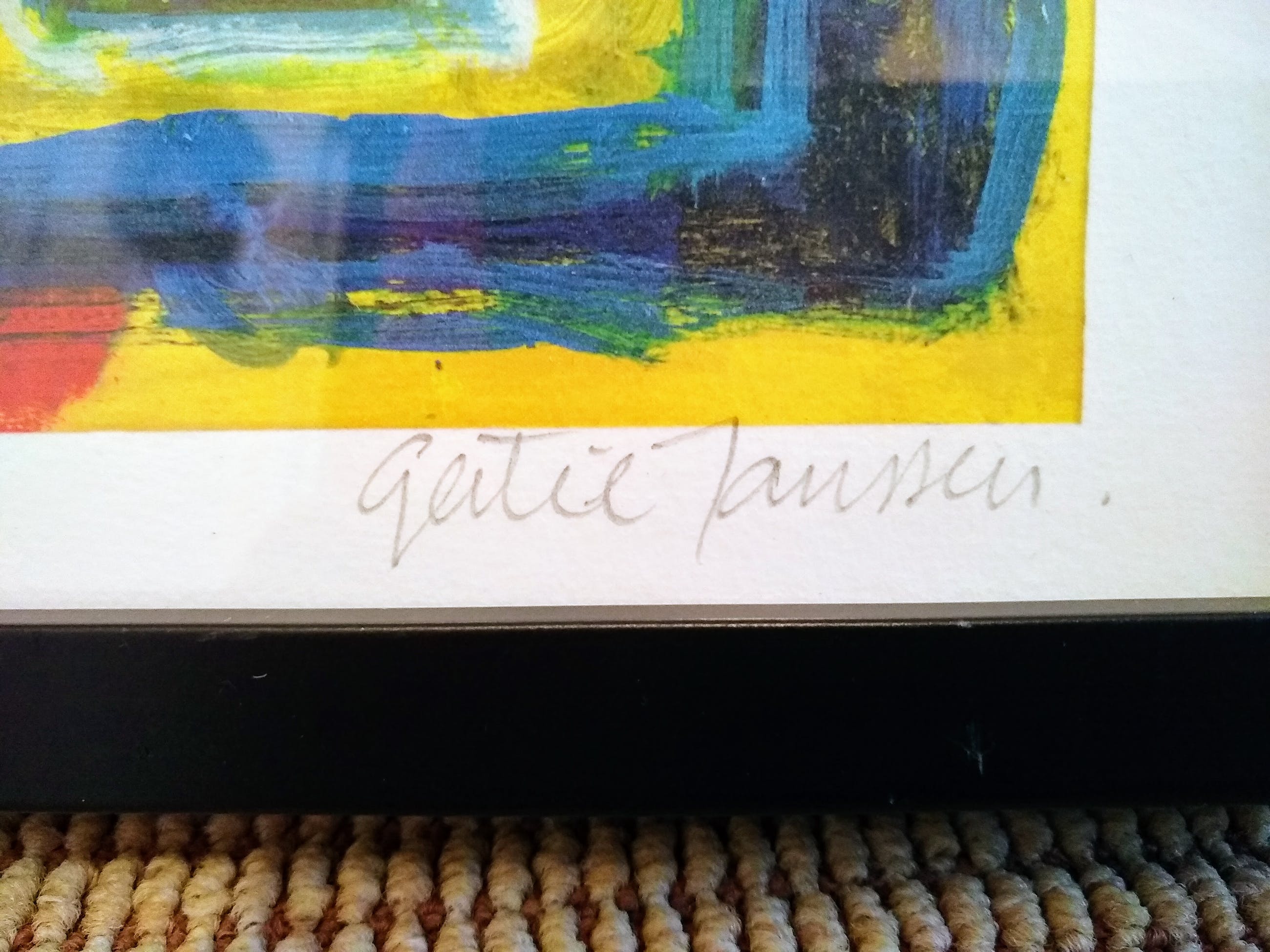 Prachtige litho van Gertie Janssen, nr 3/50, in heldere kleuren. Niet verkleurd. Netjes ingelijst in eenvoudige houten lijst met perspex glas waardoor het gewicht zeer gering is. Het perspex glas heeft wat krassen, maar die vallen niet op, dus geen enkel probleem voor zorgeloos genieten. Kan zo worden opgehangen.