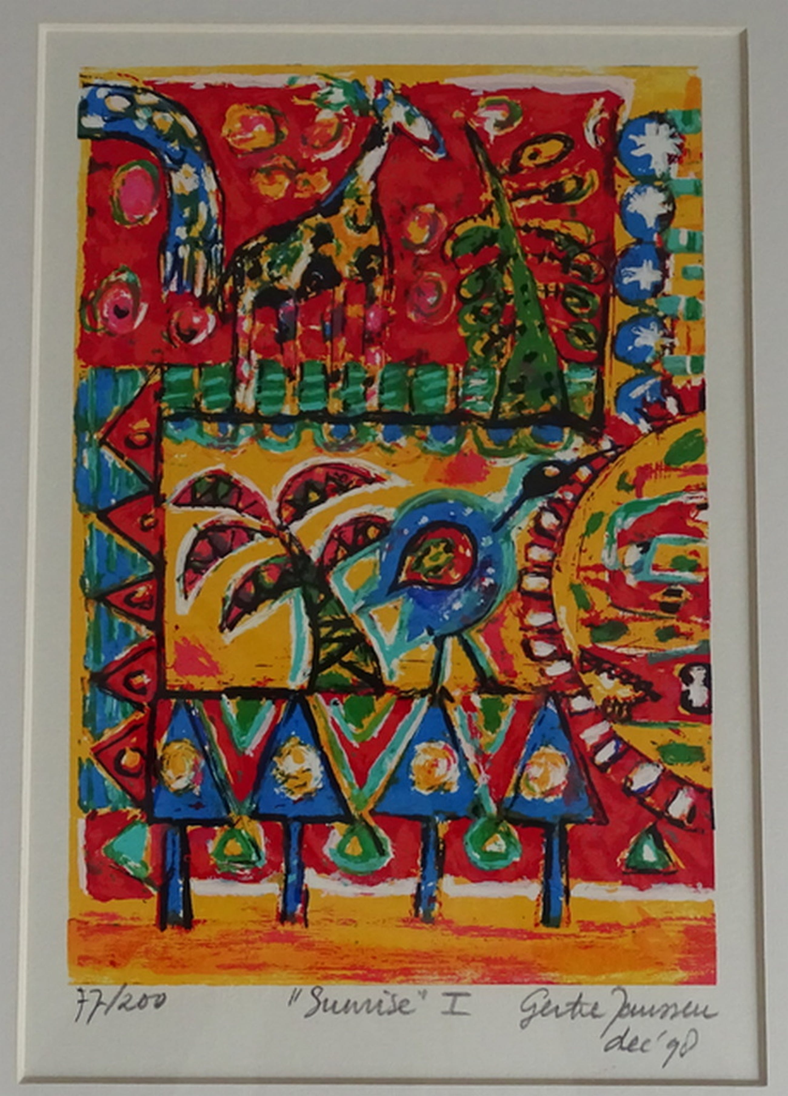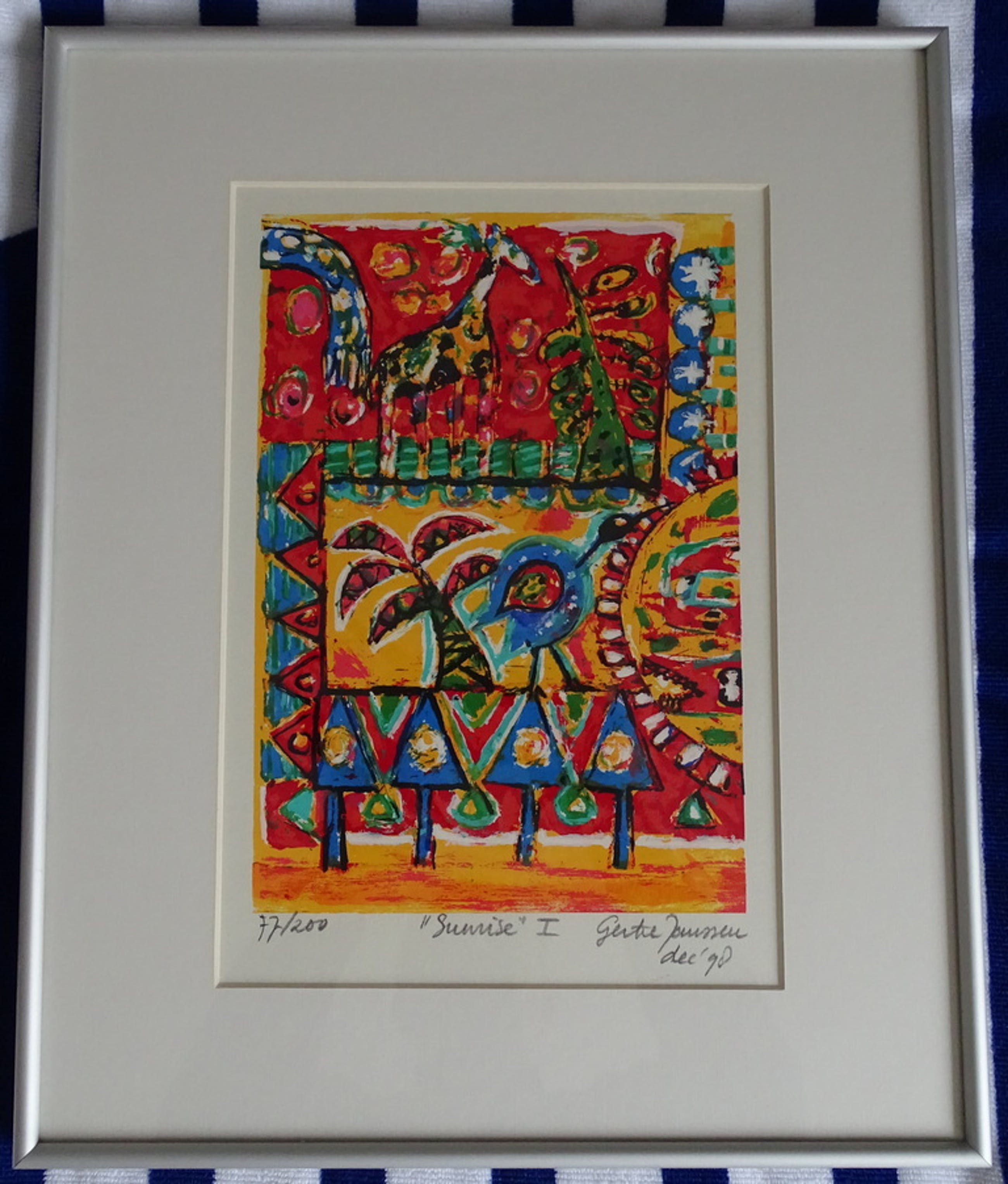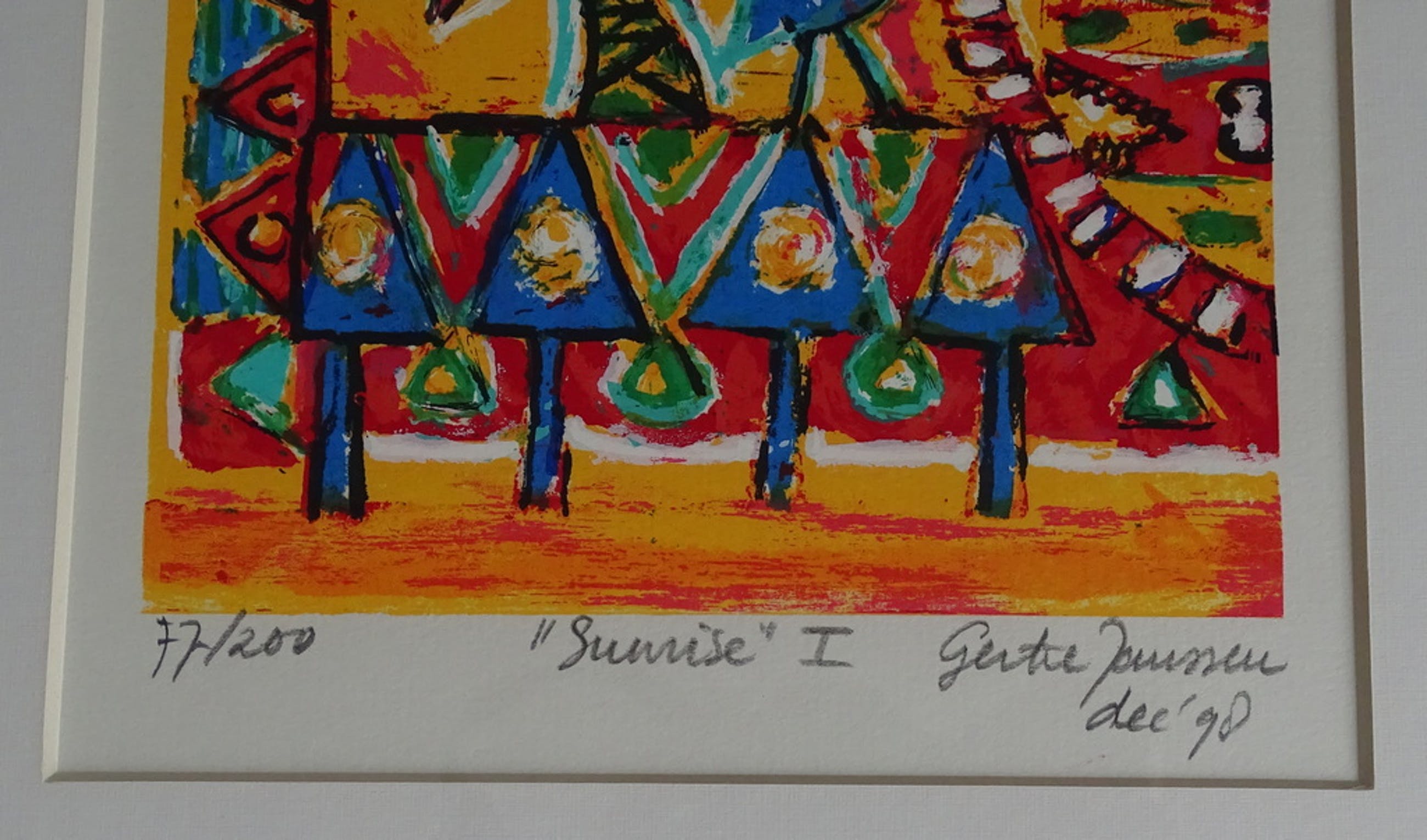 Kleurrijke zeefdruk van Gertie Janssen, mooi ingelijst achter glas, met potlood gesigneerd.