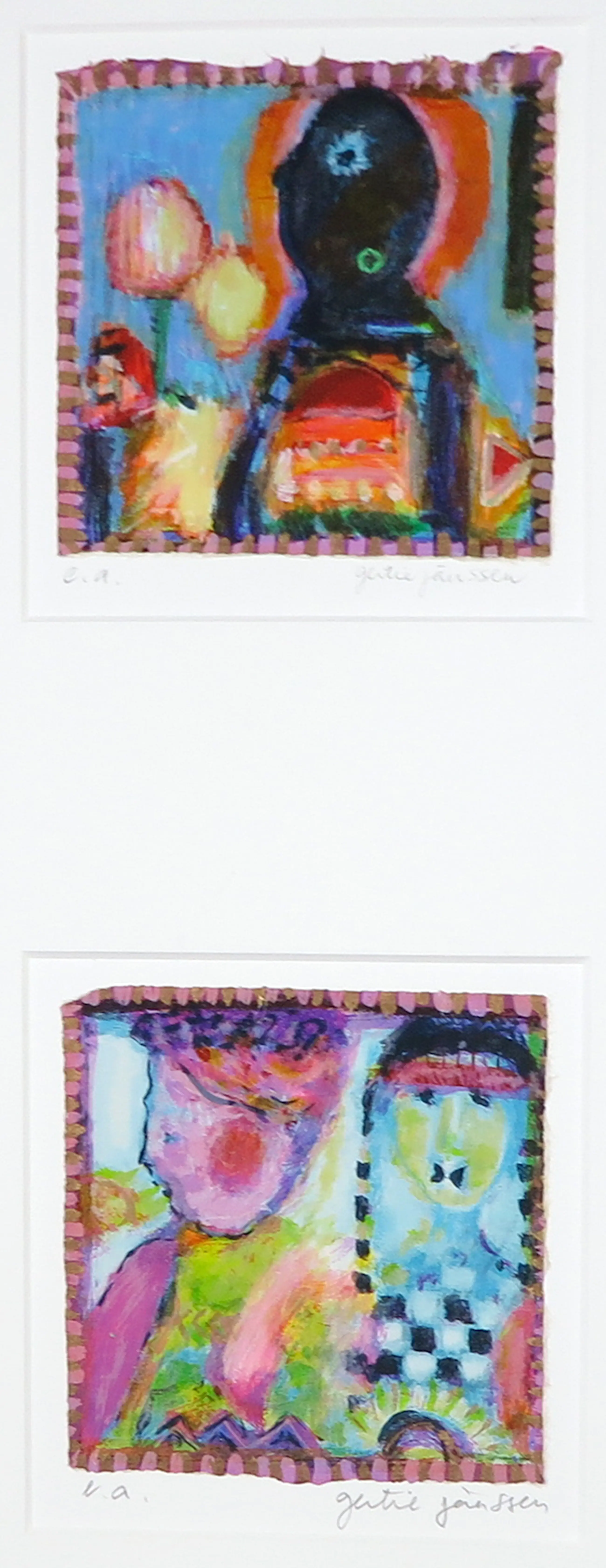 | De staat van de zeefdrukjes is uitstekend, maar in het passe-partout zit rechtsonder een kleine beschadiging; verder wat vuile vlekjes. | |||||||||||