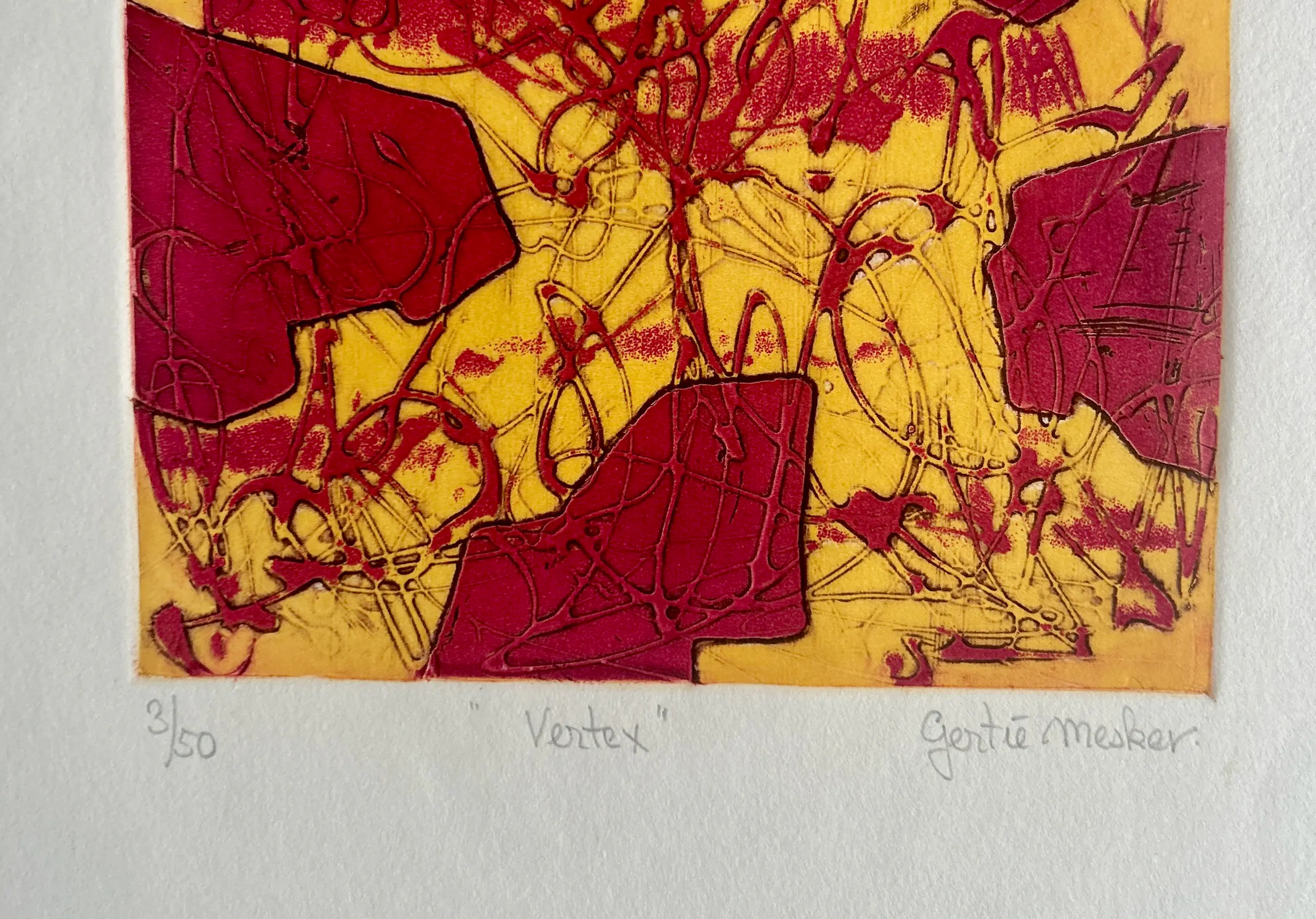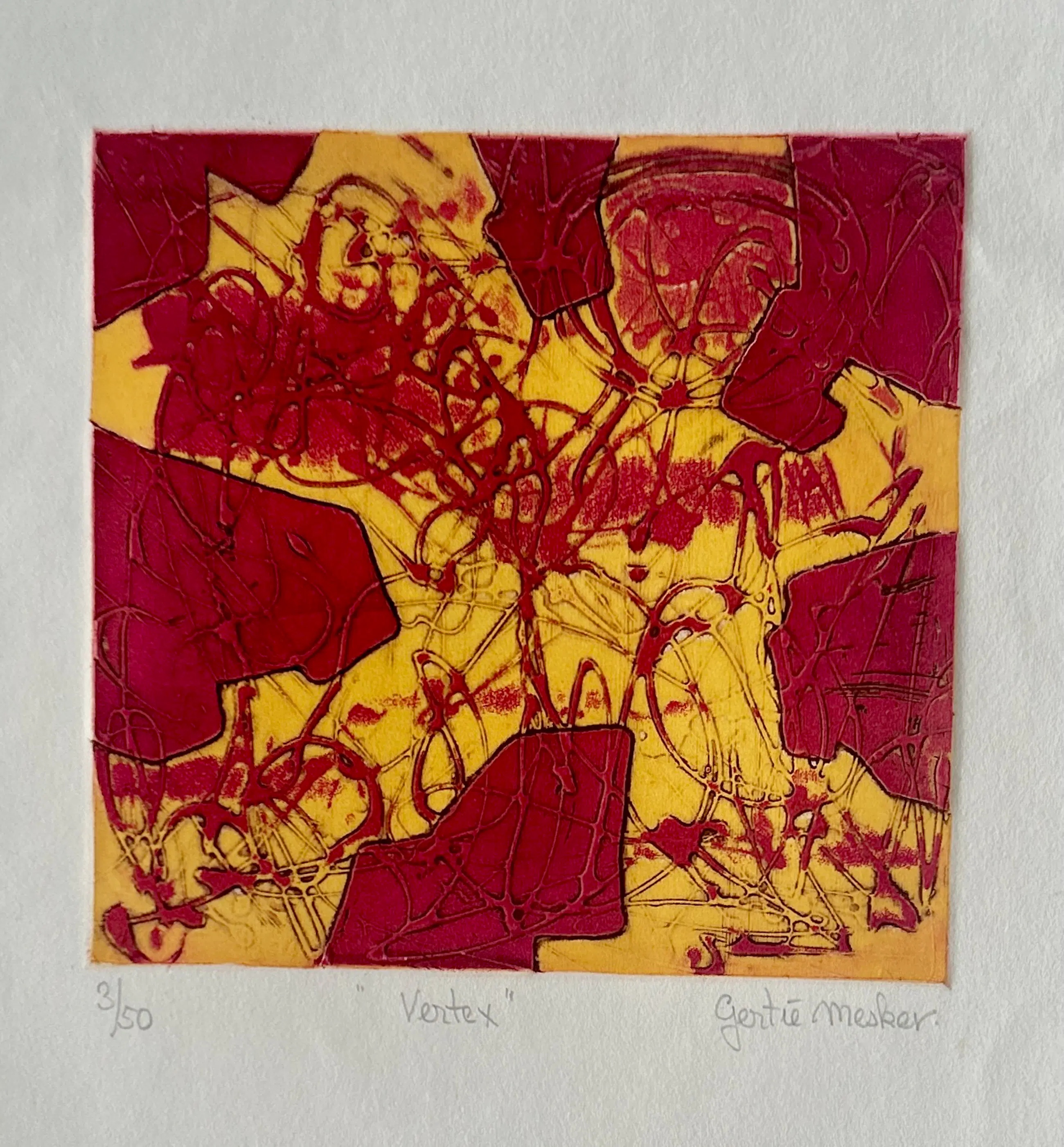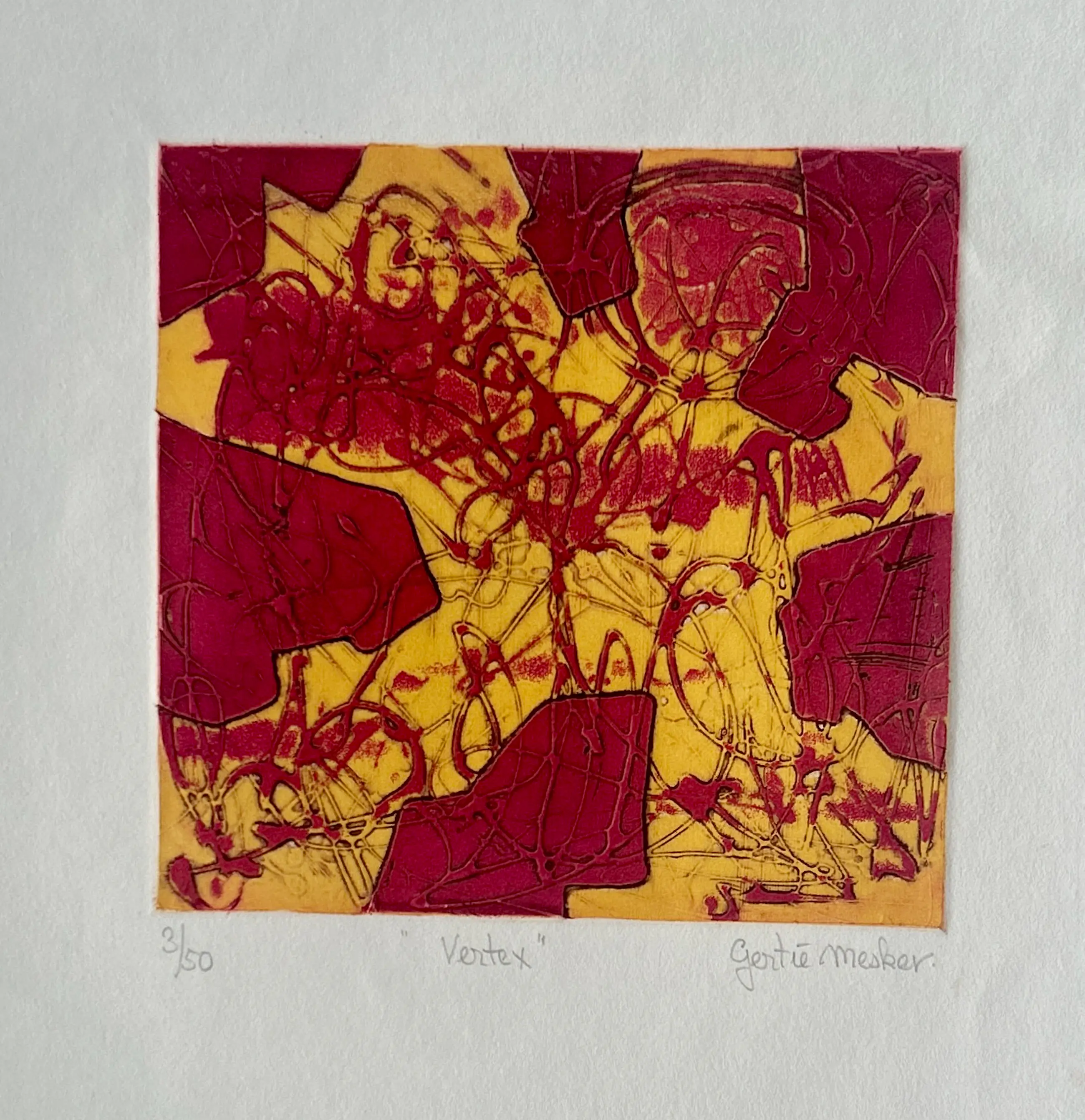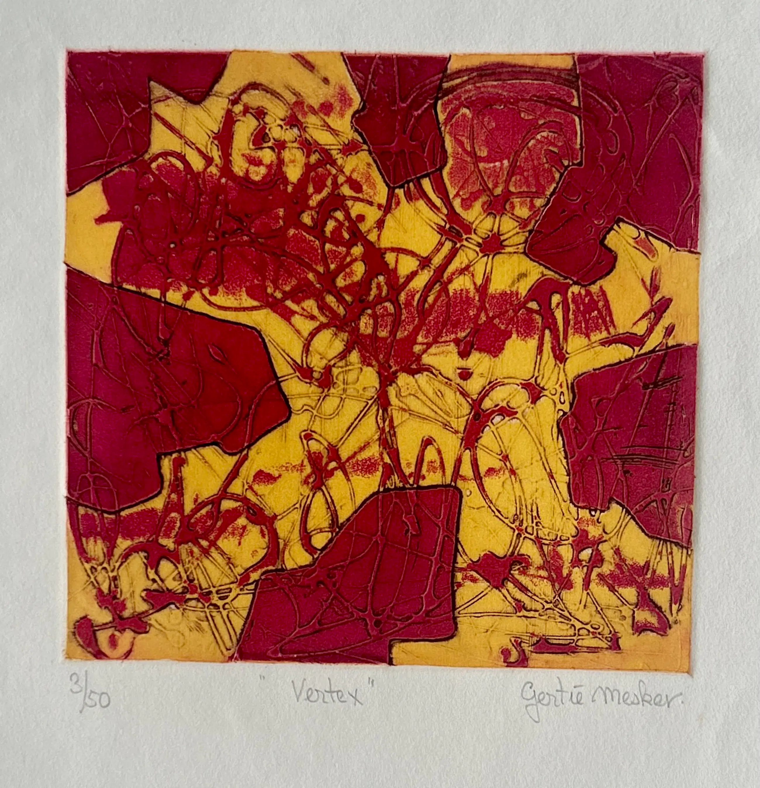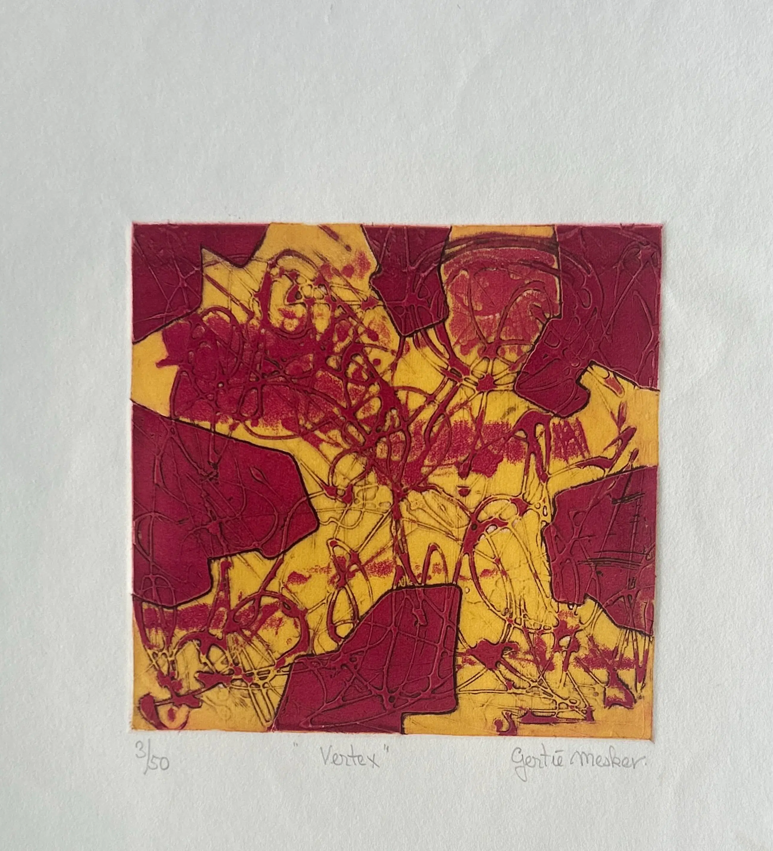 Conditie: zeer goed. Vel heeft lichte deukjes en vlekje, zie foto's. Oplage: 3/50. Afmeting: afbeelding 19 x 19 cm. Wordt zorgvuldig verpakt en verzekerd verzonden.