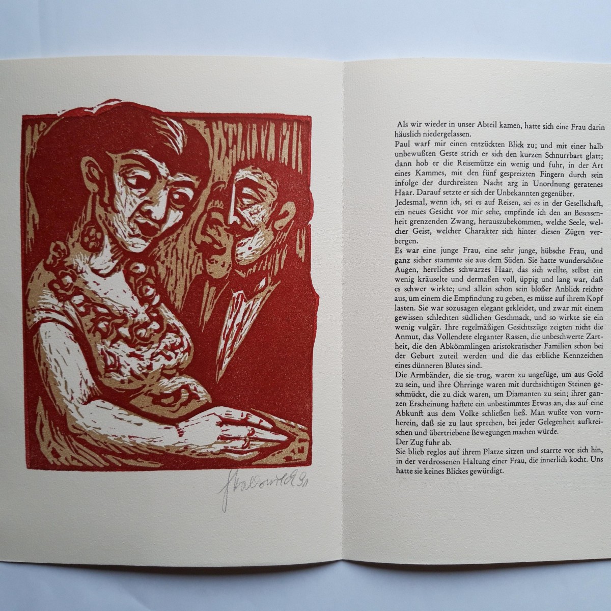 GESCHLOSSENES FORMAT 195 x 281 MM. INNEN LINKS LINOLSCHNITT, RECHTS TEXT-AUSSCHNITT ZUR ERZÄHLUNG , AUF RÜCKSEITE UMSCHREIBUNG IN SCHWARZDRUCK.