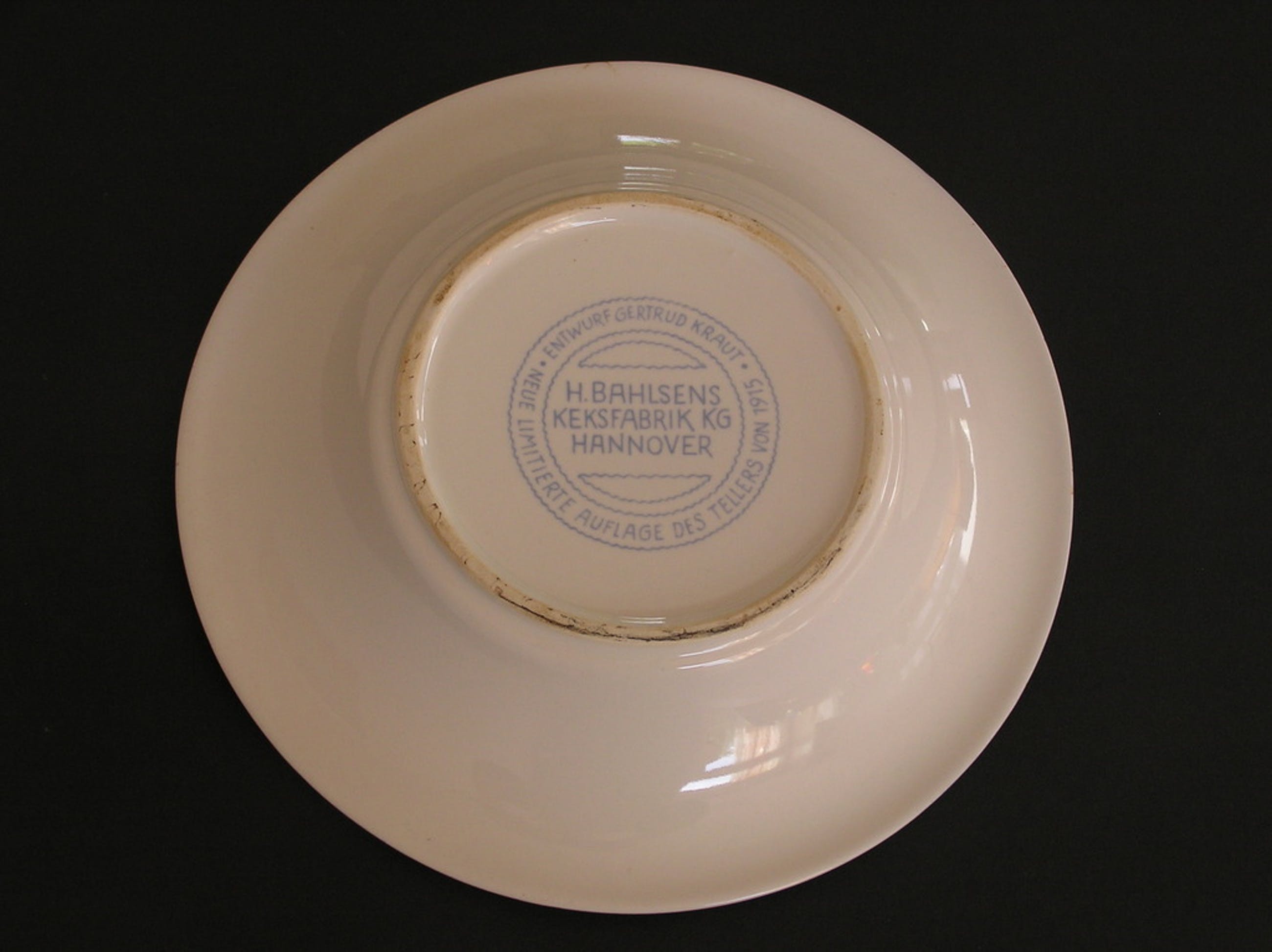 Replica van een handbeschilderd wandbord uitgegeven in gelimiteerde oplage voor de firma H. Bahlsen Keks uit Hannover in 1915, ontworpen door Gertrud Kraut. Bord is in blauw gedecoreerd aan de rand met fruit (peren, appels, pruimen) en bloemen (rozen en..), en de tekst TET en twee esculapen, in het midden is een man en een vrouw te zien die samen een grote krakeling vasthouden met in het midden de tekst; "Leibniz Keks". En onder de krakeling de afbeelding H hartje B= Hannover houdt van Bahlsen. In prima onbeschadigde conditie. Afmetingen; diameter 24,5 cm en 7,5 cm hoog. Achterzijde voorzien van een gedrukt stempel; H. Bahlsens Keksfabrik KG, Hannover en de tekst; neue limitierte auflage des tellers von 1915, entwurf Gertrud Kraut.