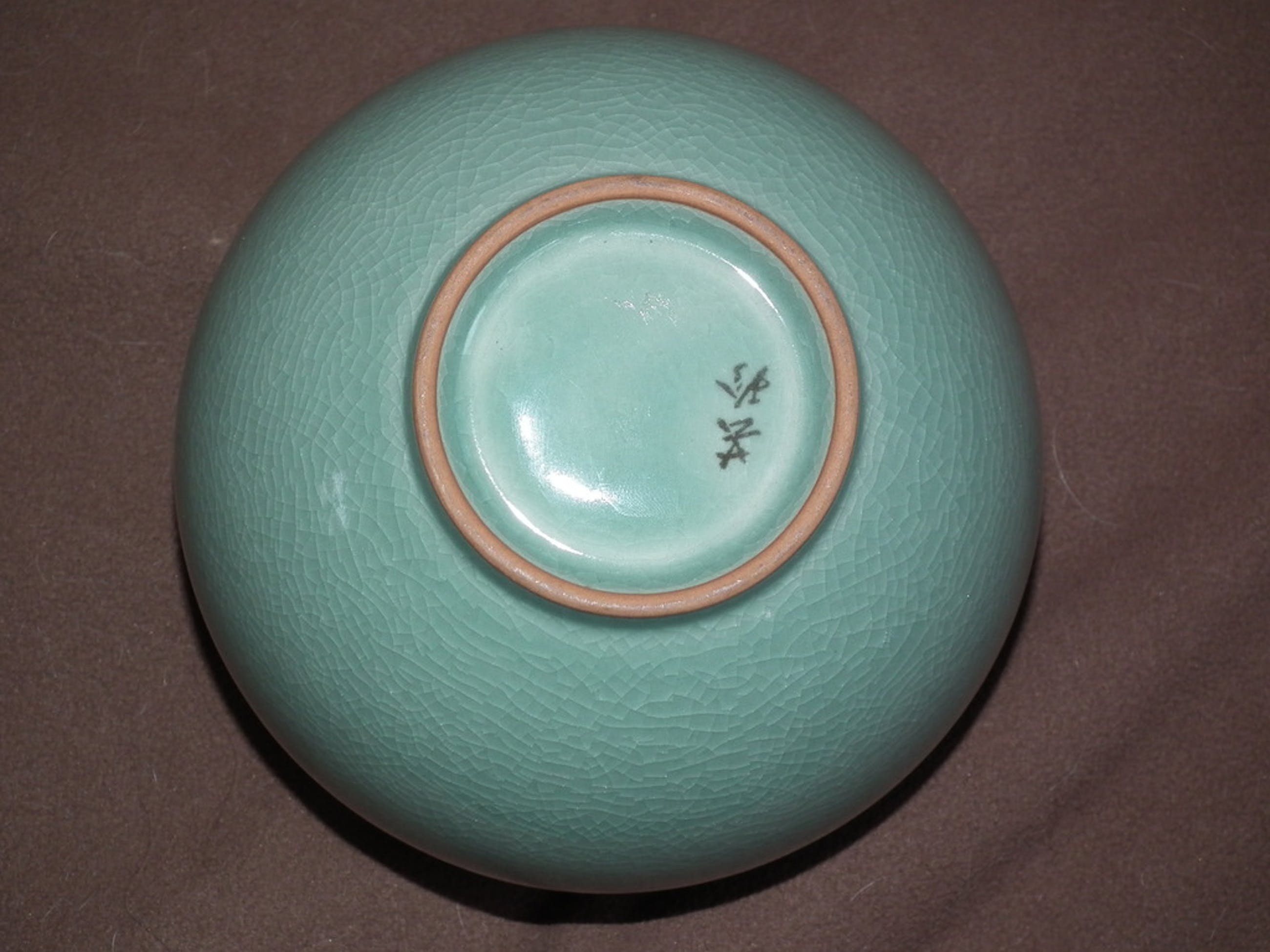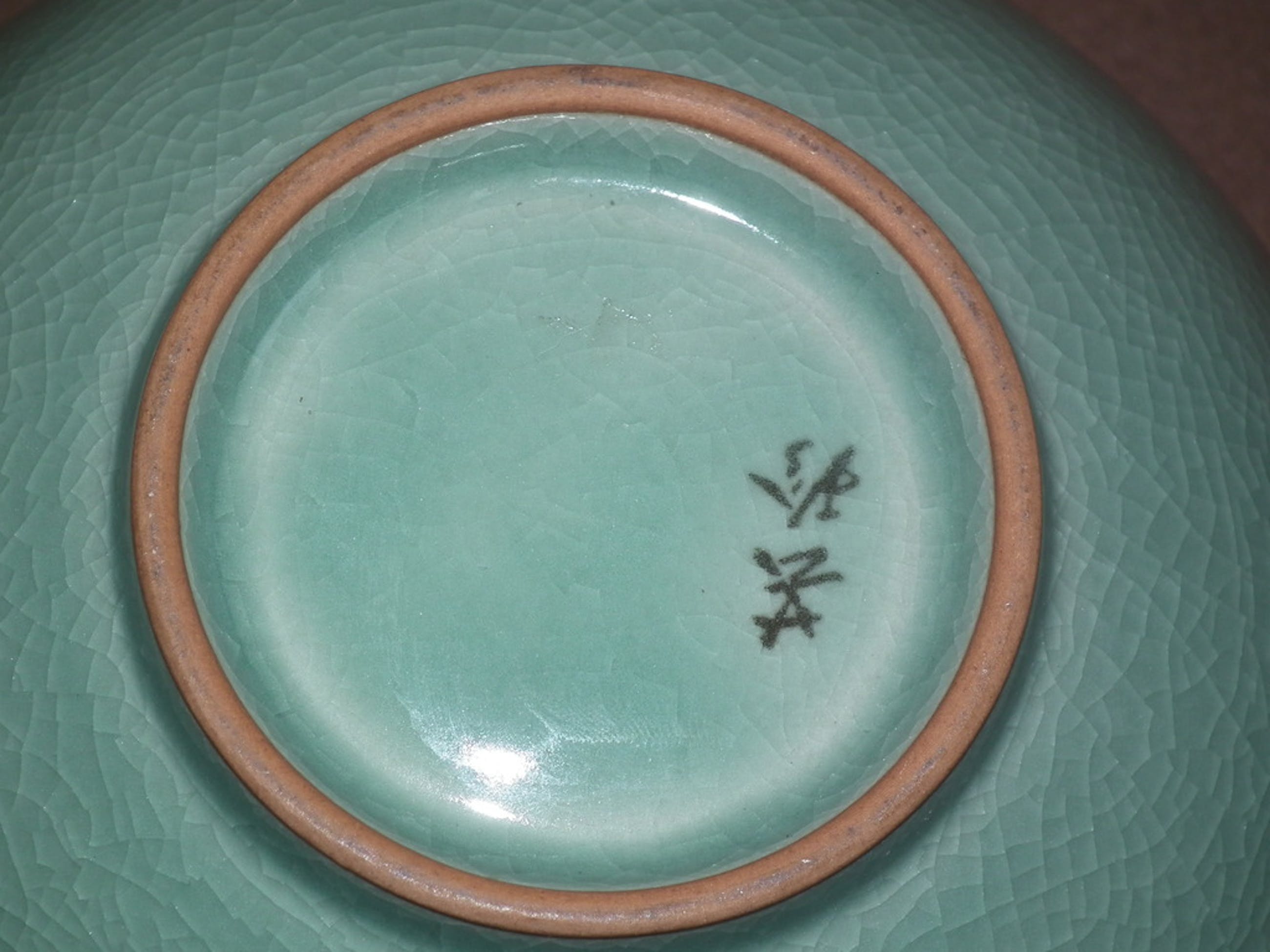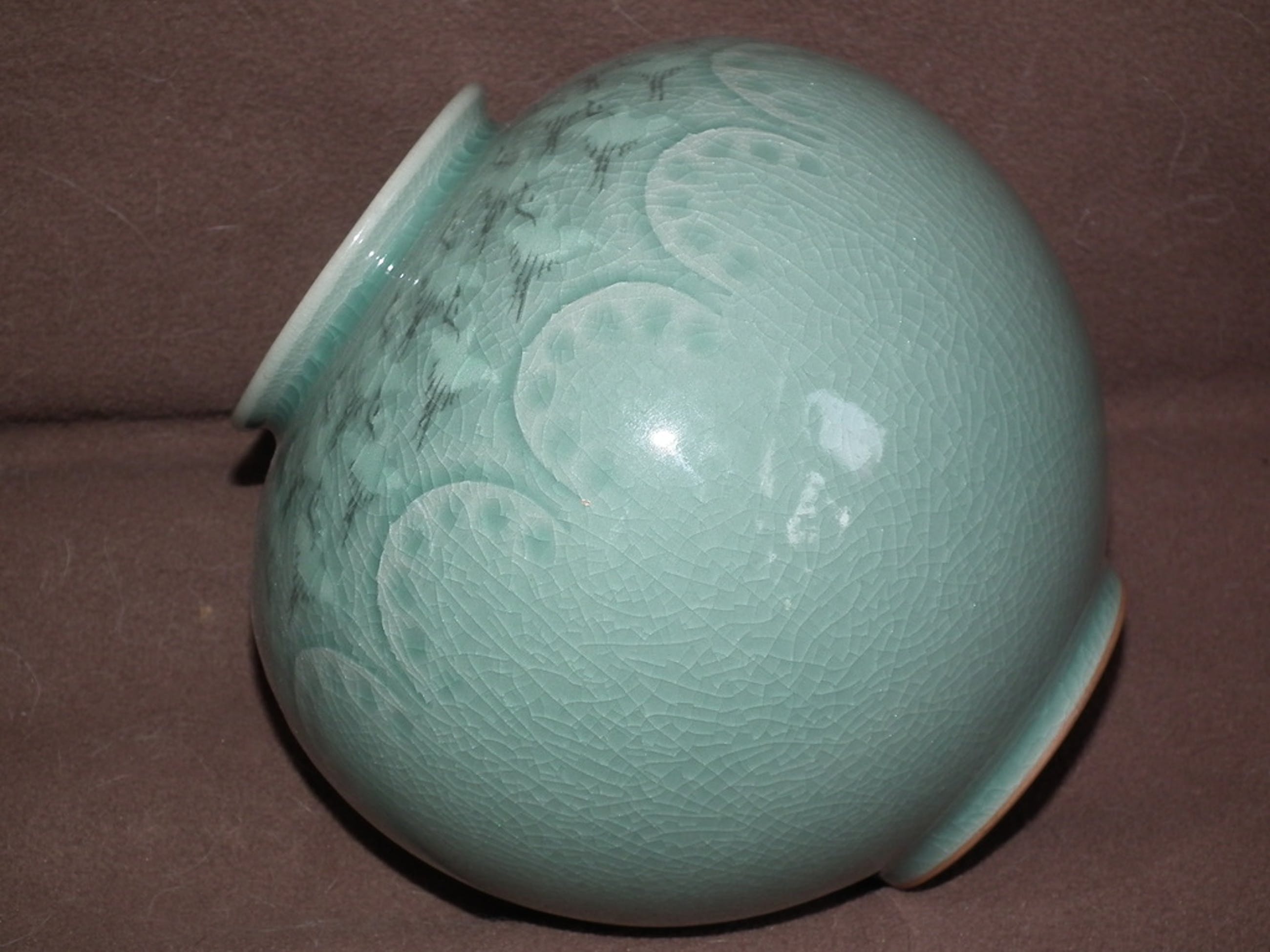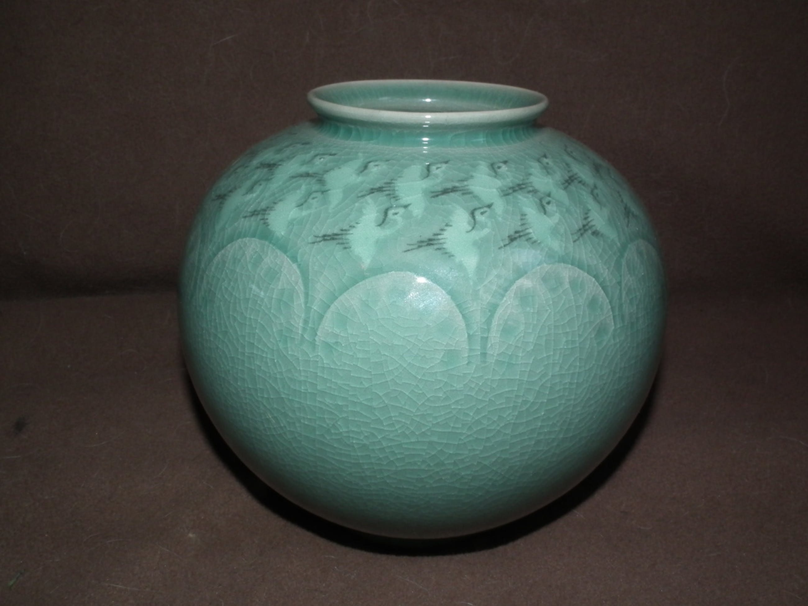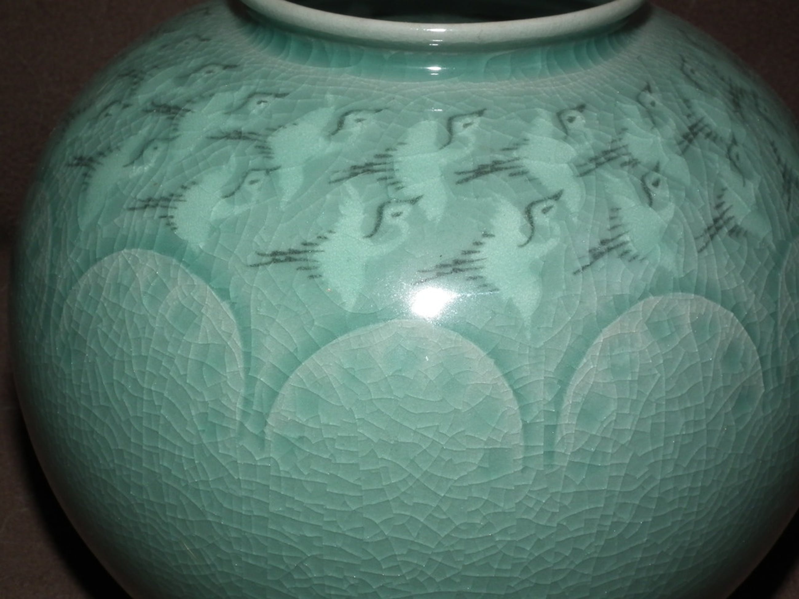 Puntgave groene celadon vaas met afbeelding van vogels op de kraag.