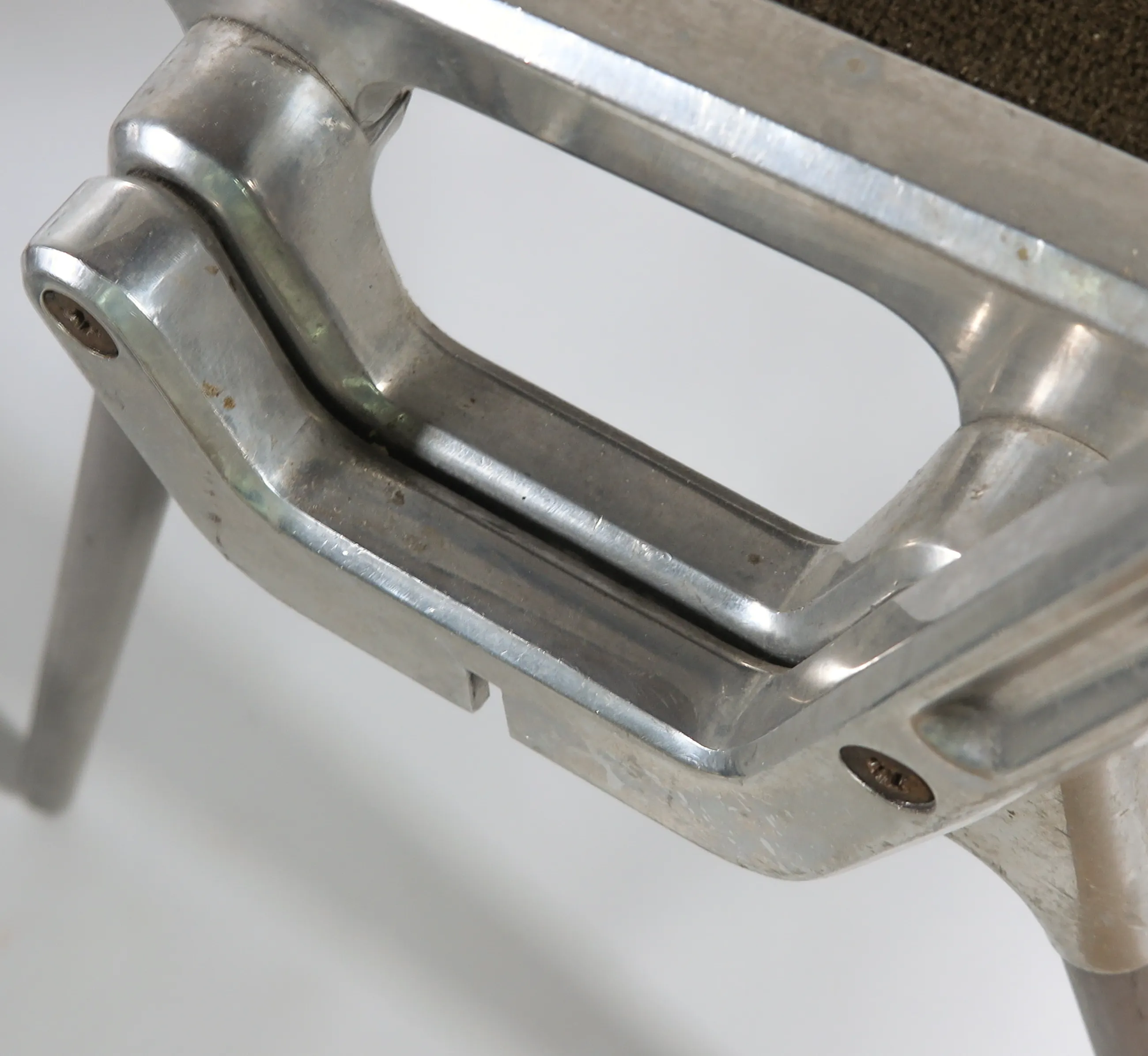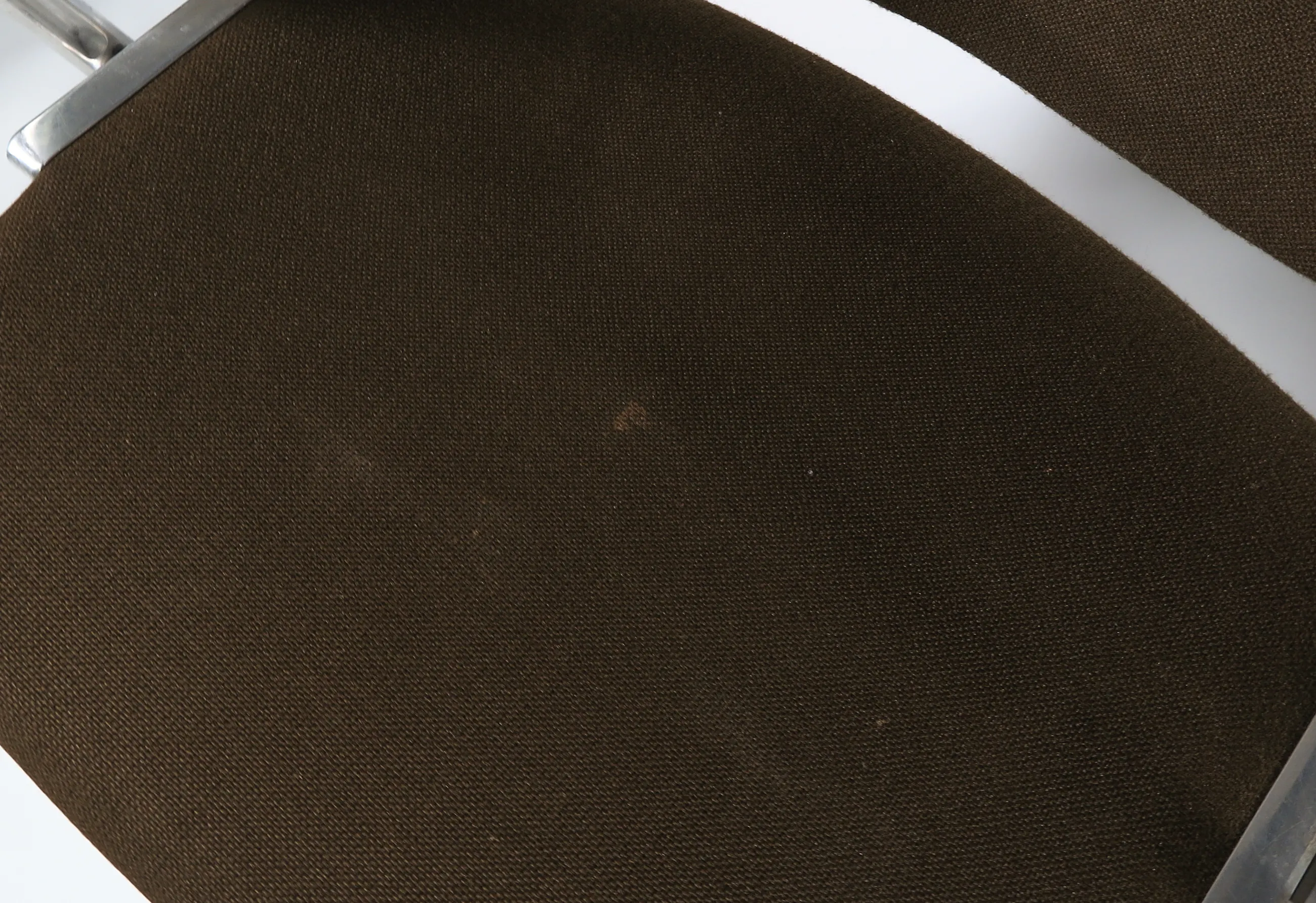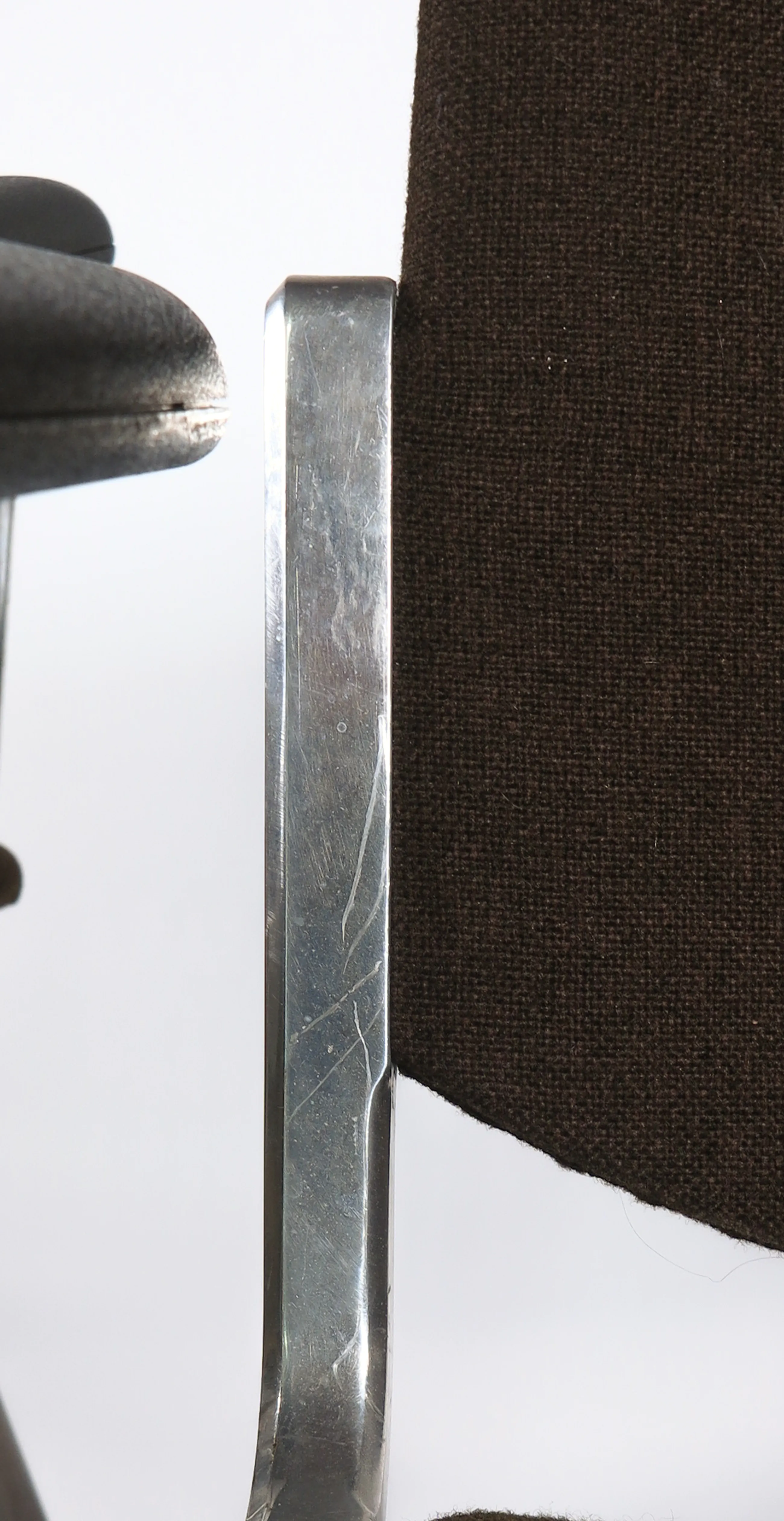 | Gebruikte en vintage conditie. De conditie is wisselend per stoel, maar iedere stoel heeft zichtbare gebruikssporen. De bekleding is over het algemeen in redelijke conditie, zonder duidelijke slijtage. De bekleding heeft her en der wat vlekjes of verkleuring, of is een beetje gerafeld bij een naad. Het metalen onderstel is af en toe wat vuil of aangeslagen. Sommige armleuningen hebben slijtage/gaatjes/scheurtjes. Eén stoel mist twee wentel-dopjes onder de poten. De kunststof hulsen rondom de poten hebben butsjes en beschadigingen. | |