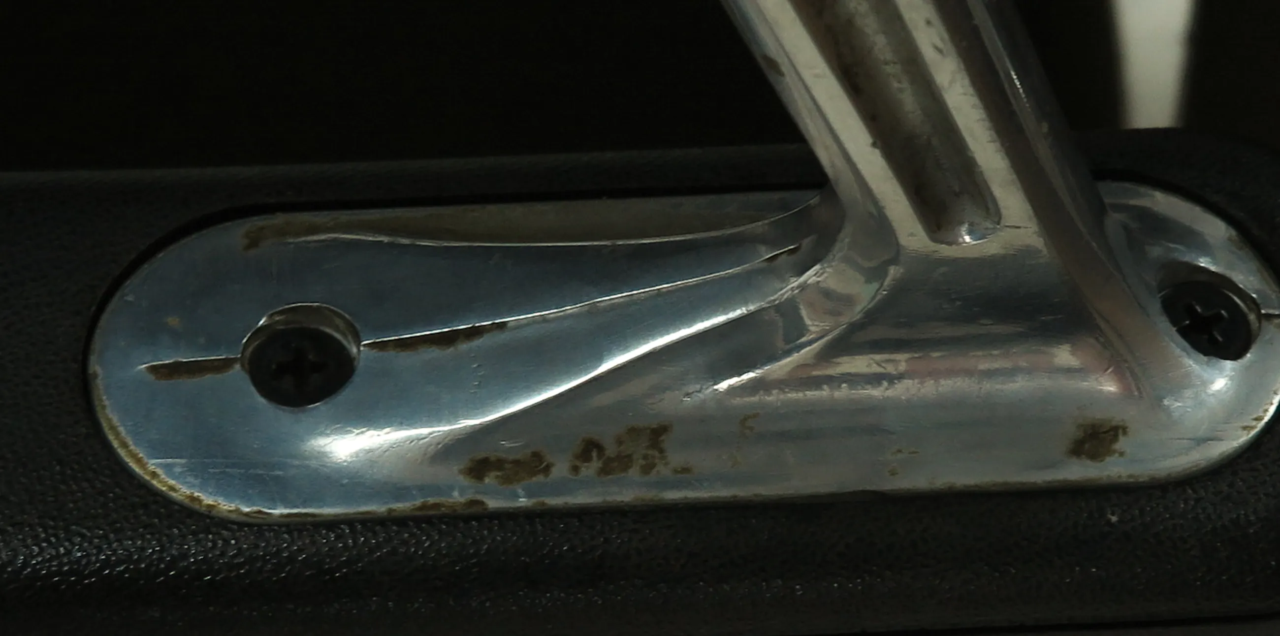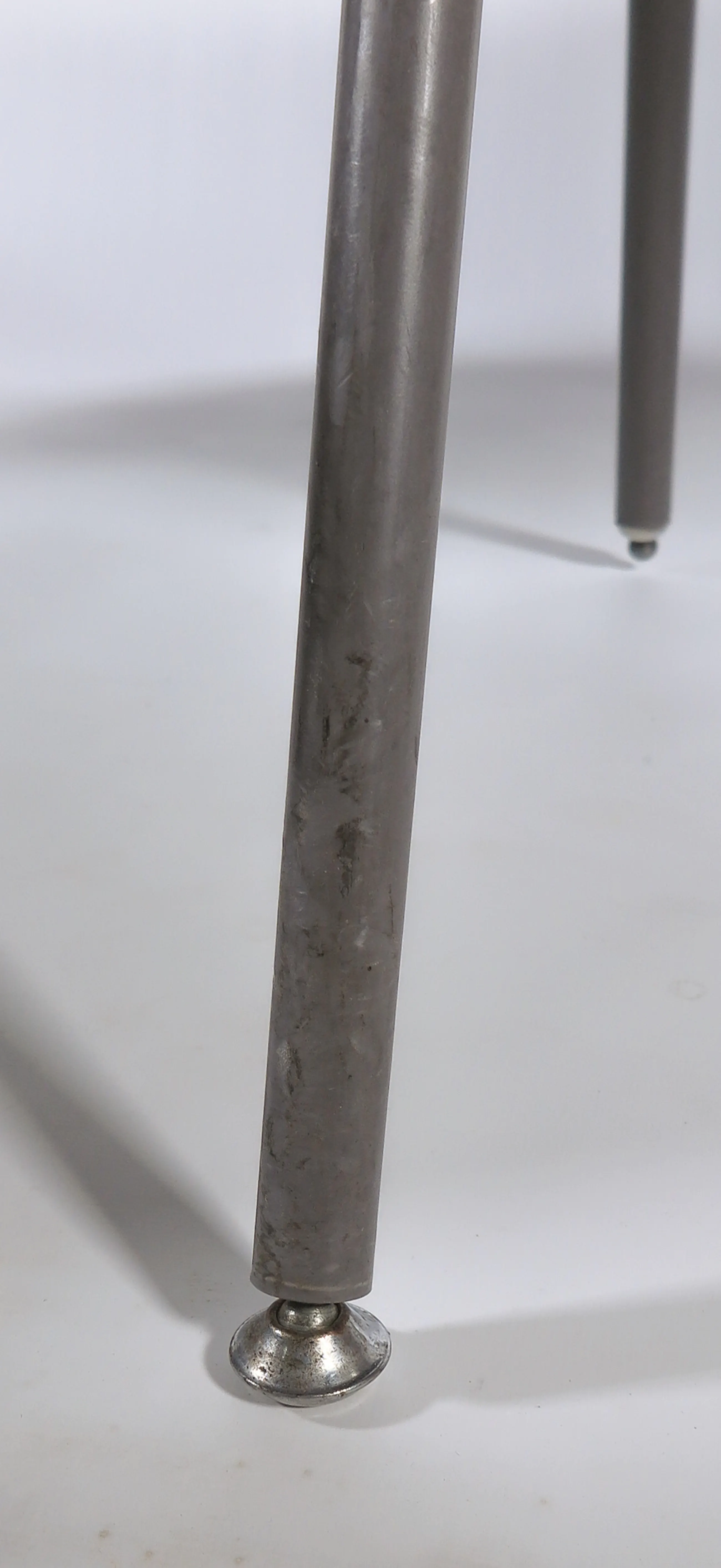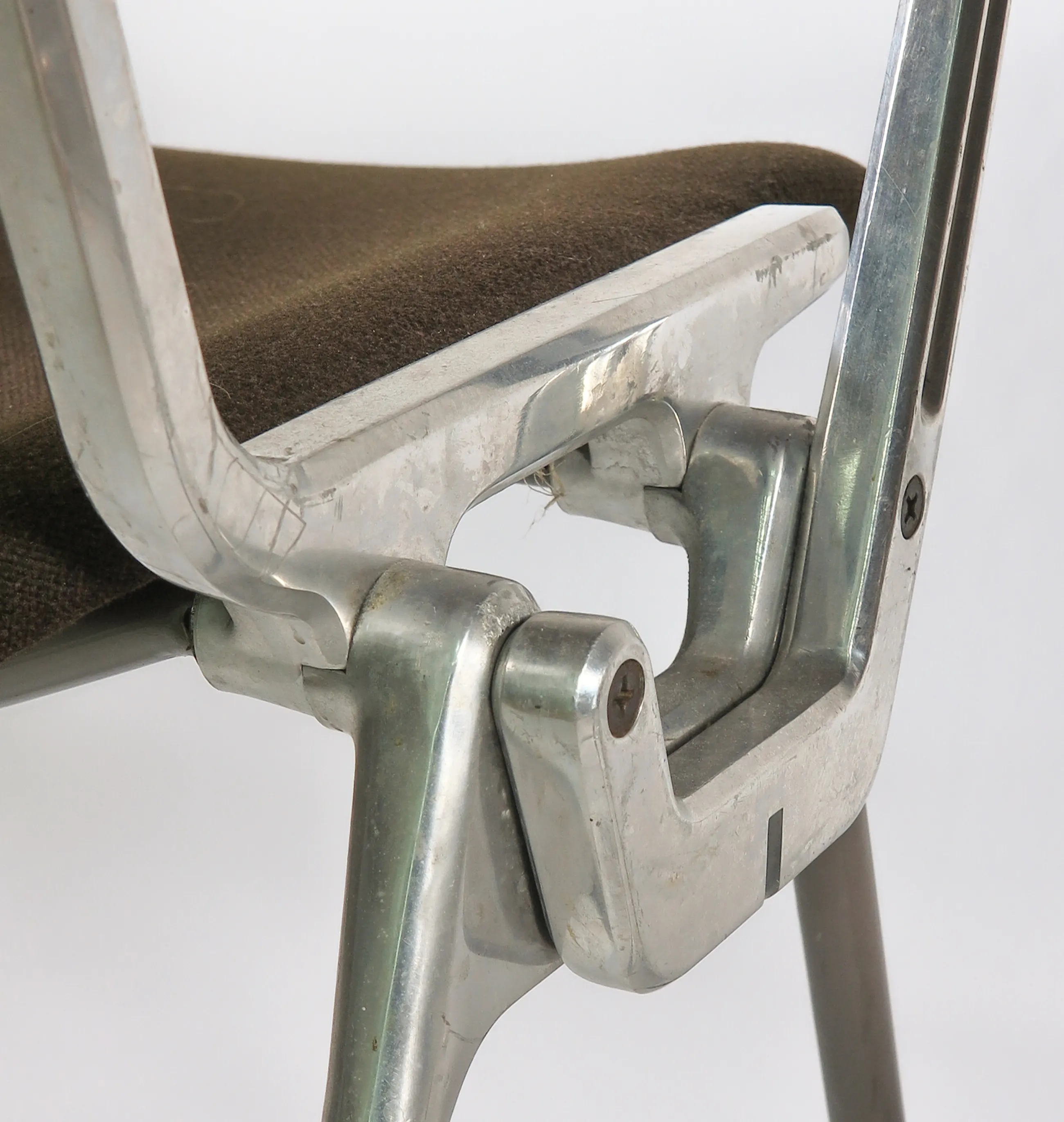 | Gebruikte en vintage conditie. De conditie is wisselend per stoel, maar iedere stoel heeft zichtbare gebruikssporen. De bekleding is over het algemeen in redelijke conditie, zonder duidelijke slijtage. De bekleding heeft her en der wat vlekjes of verkleuring, of is een beetje gerafeld bij een naad. Het metalen onderstel is af en toe wat vuil of aangeslagen. Sommige armleuningen hebben slijtage/gaatjes/scheurtjes. Eén stoel mist twee wentel-dopjes onder de poten. De kunststof hulsen rondom de poten hebben butsjes en beschadigingen. | |