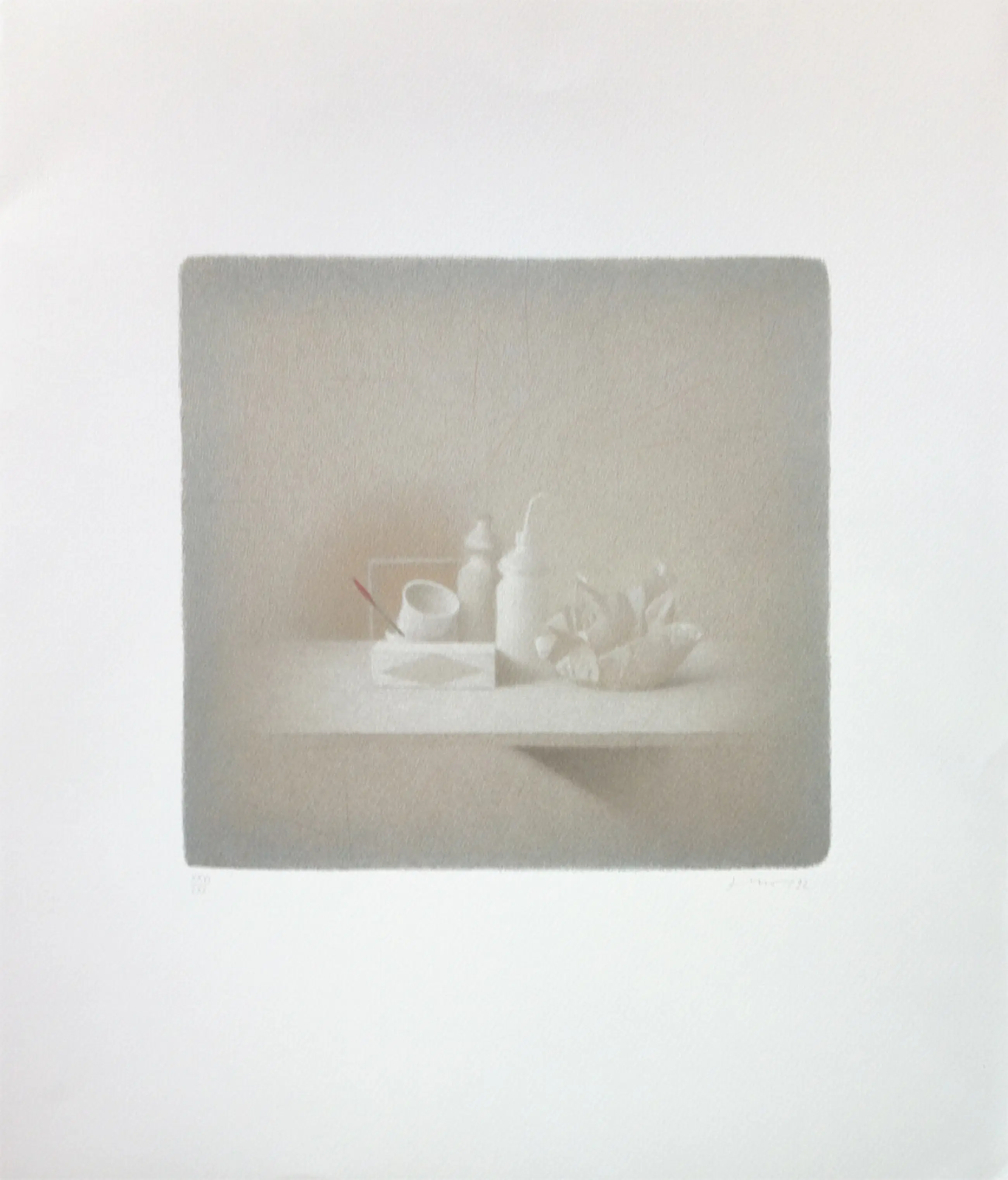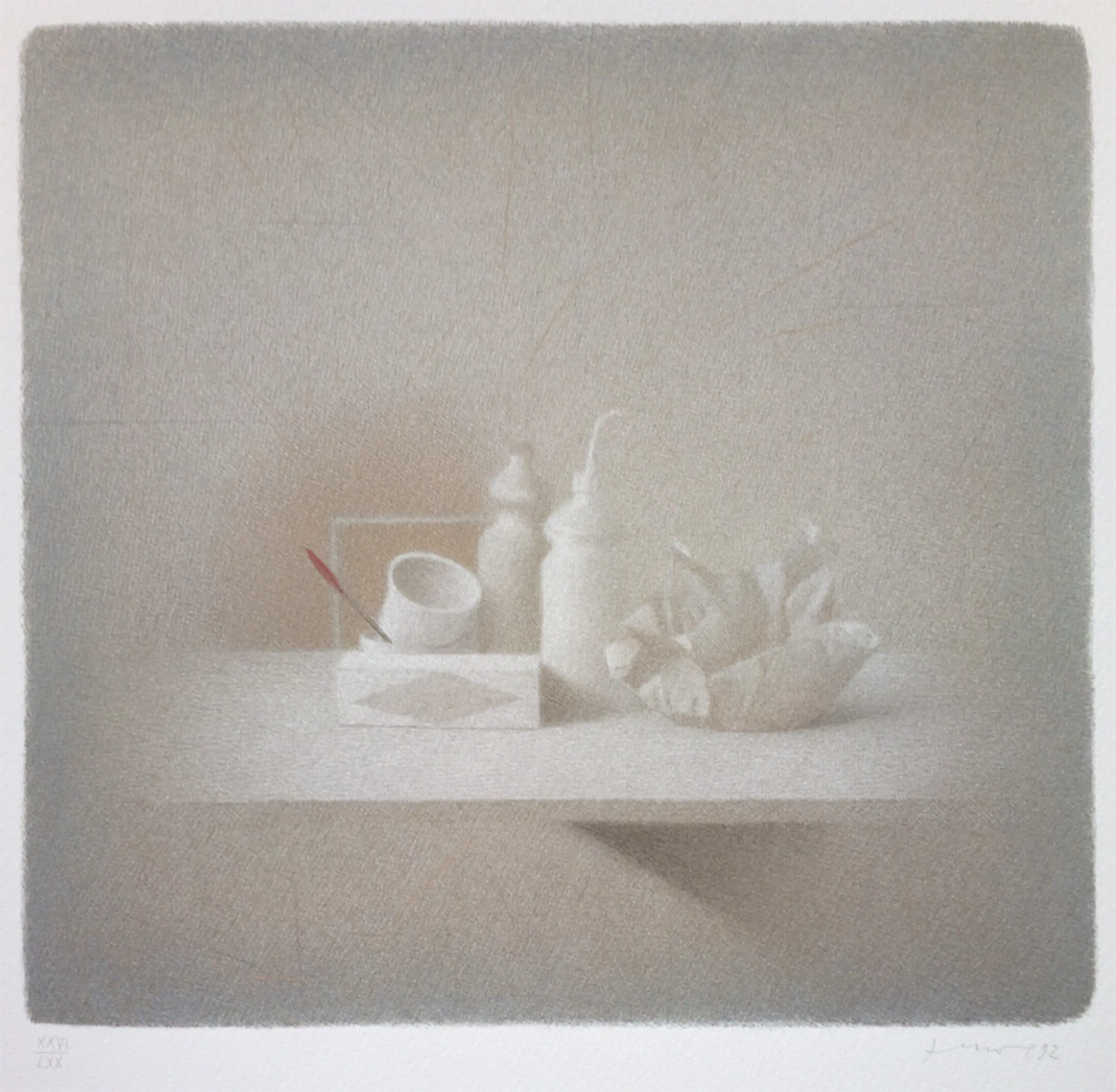 Lithografie van de Italiaanse kunstenaar Gianfranco Ferroni. De litho is uit 1992. Het werk is linksonder Romeins genummerd XXVI/LXX en rechtsonder gesigneerd en gedateerd. De lithografie is 30 centimeter hoog en 32 centimeter breed. Het blad is 61 centimeter hoog en 51 centimeter breed.