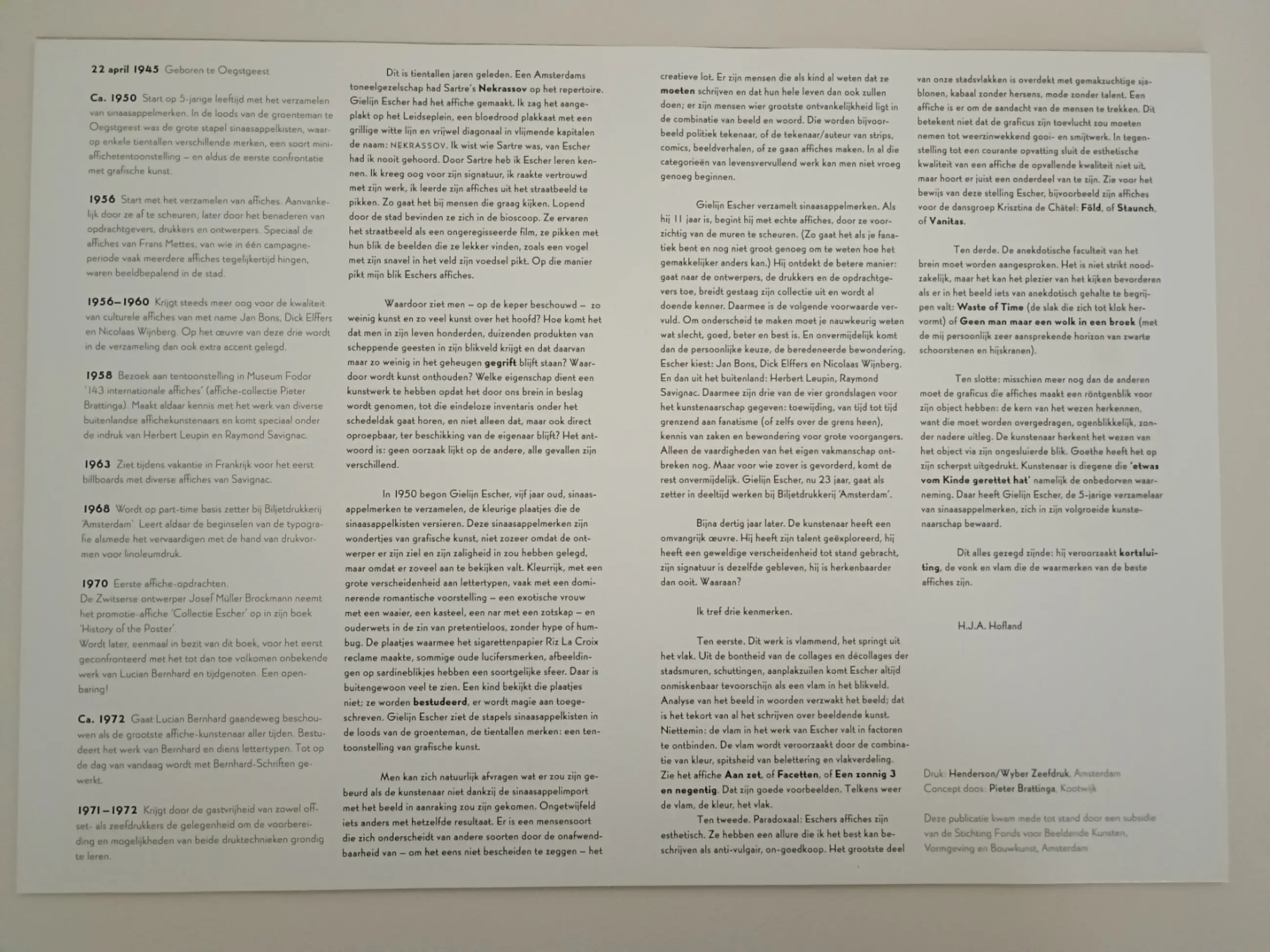Zes zeefdrukken (30 x 40 op dik papier) van Gielijn Escher in een metalen houder, die kan worden opgehangen. Wisselen kan en laat steeds een andere affiche zien. Met een begeleidende tekst van Henk Hofland. Druk: Henderson/Wyber Zeefdruk, Amsterdam. Concept doos: Pieter Brattinga, Kootwijk