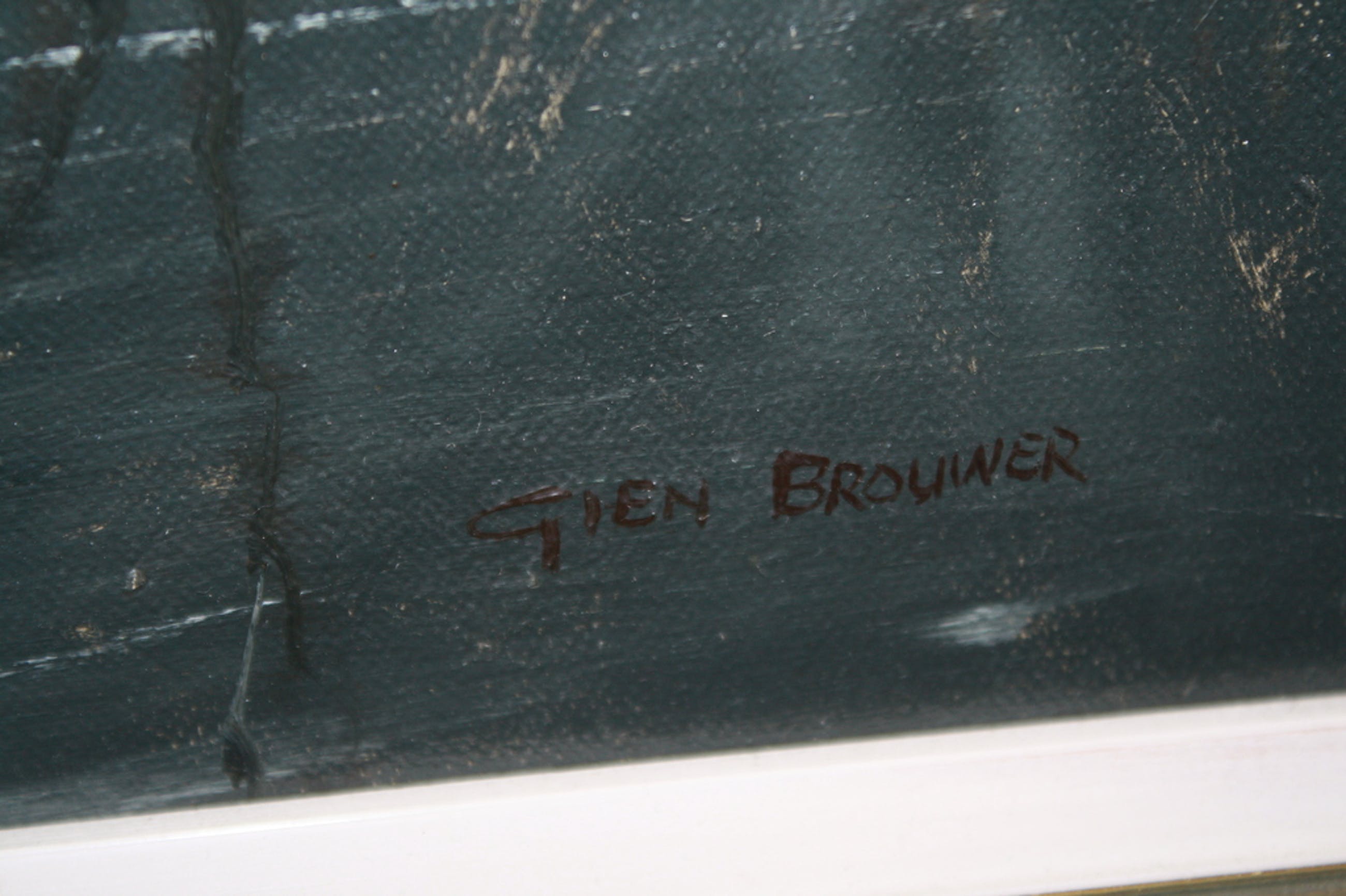 Gien Brouwer (Waddinxveen 1944) De kunstschilder Gien Brouwer woont en werkt in de omgeving van Utrecht. In Rotterdam volgde hij de kunstacademie waarna hij les kreeg van Herman Wijngaard. Zijn grote liefde is schilderen met olieverf op linnen in naturalistische tinten. Deze techniek beheerst hij volledig. Hij maakte ook plastieken voor universiteiten. De thema`s waar hij voor kiest zijn voornamelijk echt Hollandse landschappen, zoals polder- en rivierlandschappen met een dreiging in de lucht of een zomerse namiddag. Gien Brouwer exposeerde in Utrecht, Amsterdam ,Venlo, Düsseldorf, Frankfurt en München.