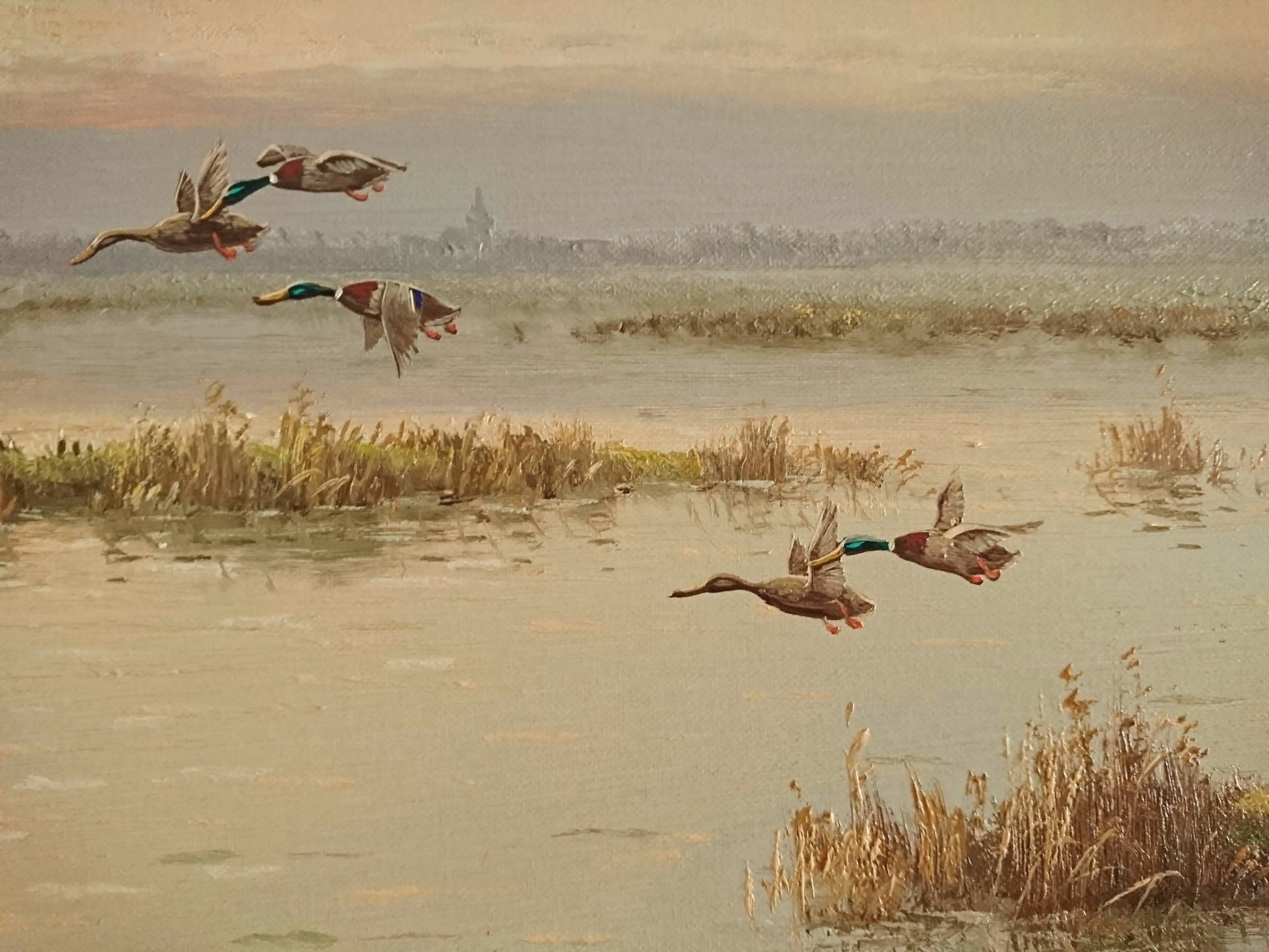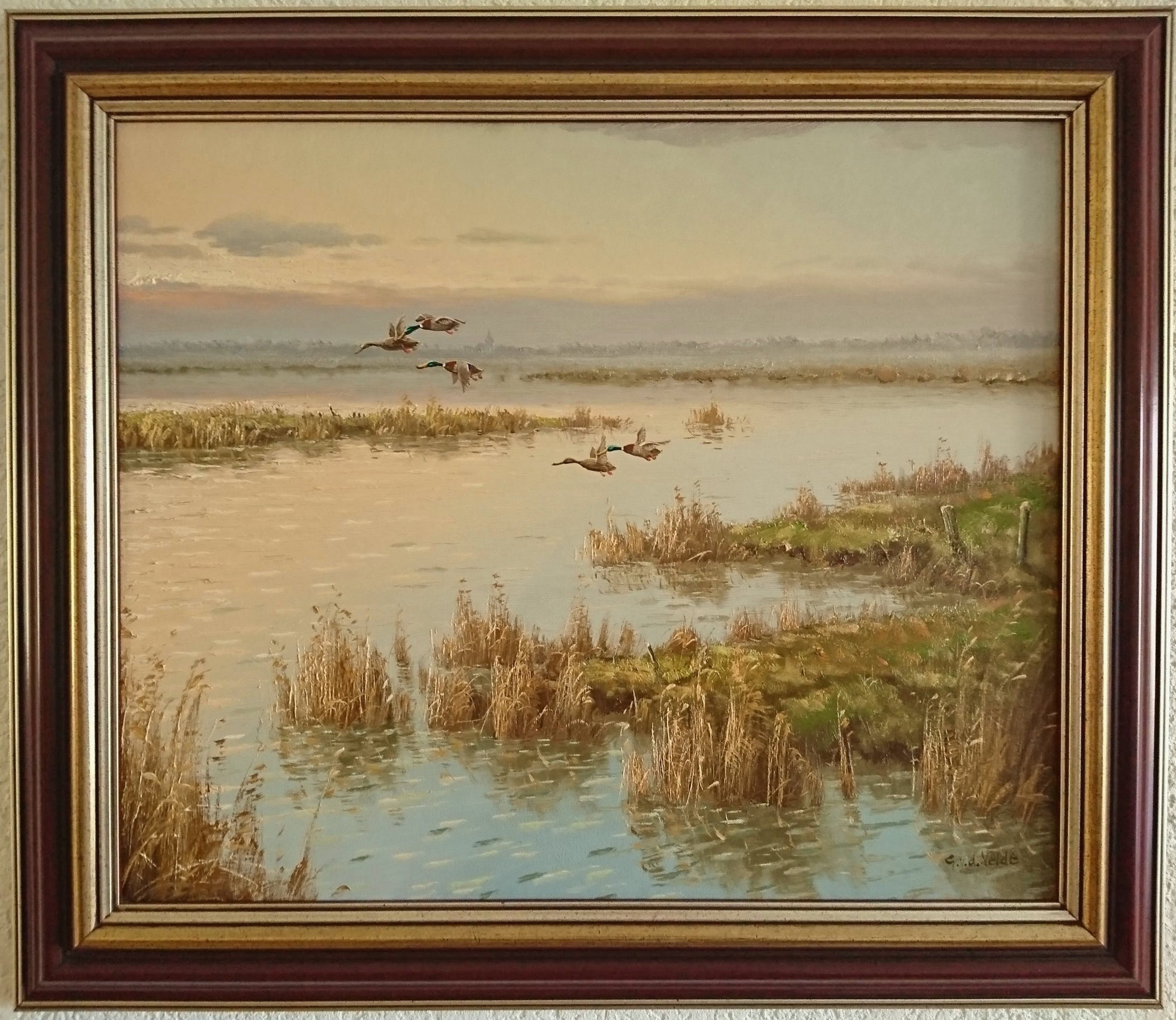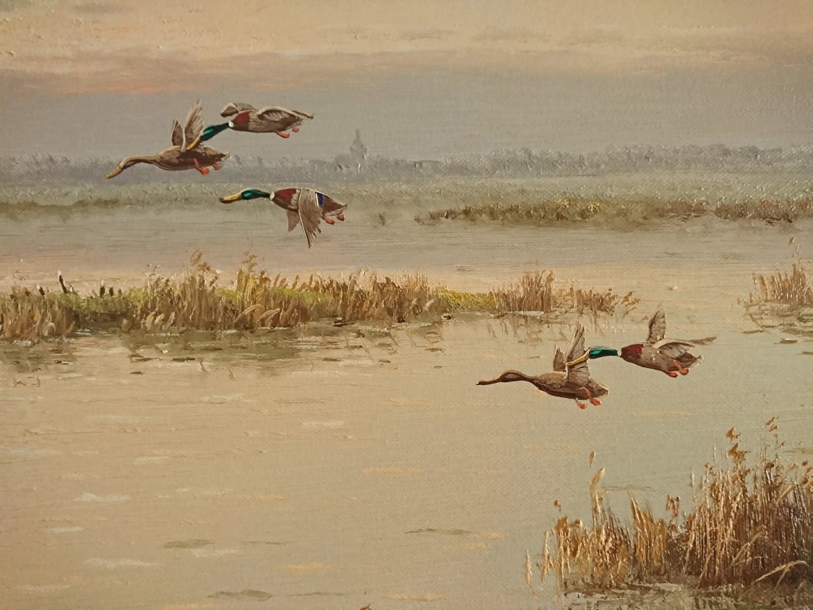 Een prachtige natuurvoorstelling van Gien van de Velde oftewel Gien Brouwer hij signeert willekeurig met beide namen. Het betere schilderwerk prachtige rietkragen en haarscherp geschilderde vliegende eenden deze zijn niet alleen decoratief maar geven het doek ook een optische illusie van diepte. Dit fraaie schilderij wordt goed verpakt aan u opgestuurd (binnen Nederland) desgewenst bent u ook welkom om het in Hattem op te komen halen