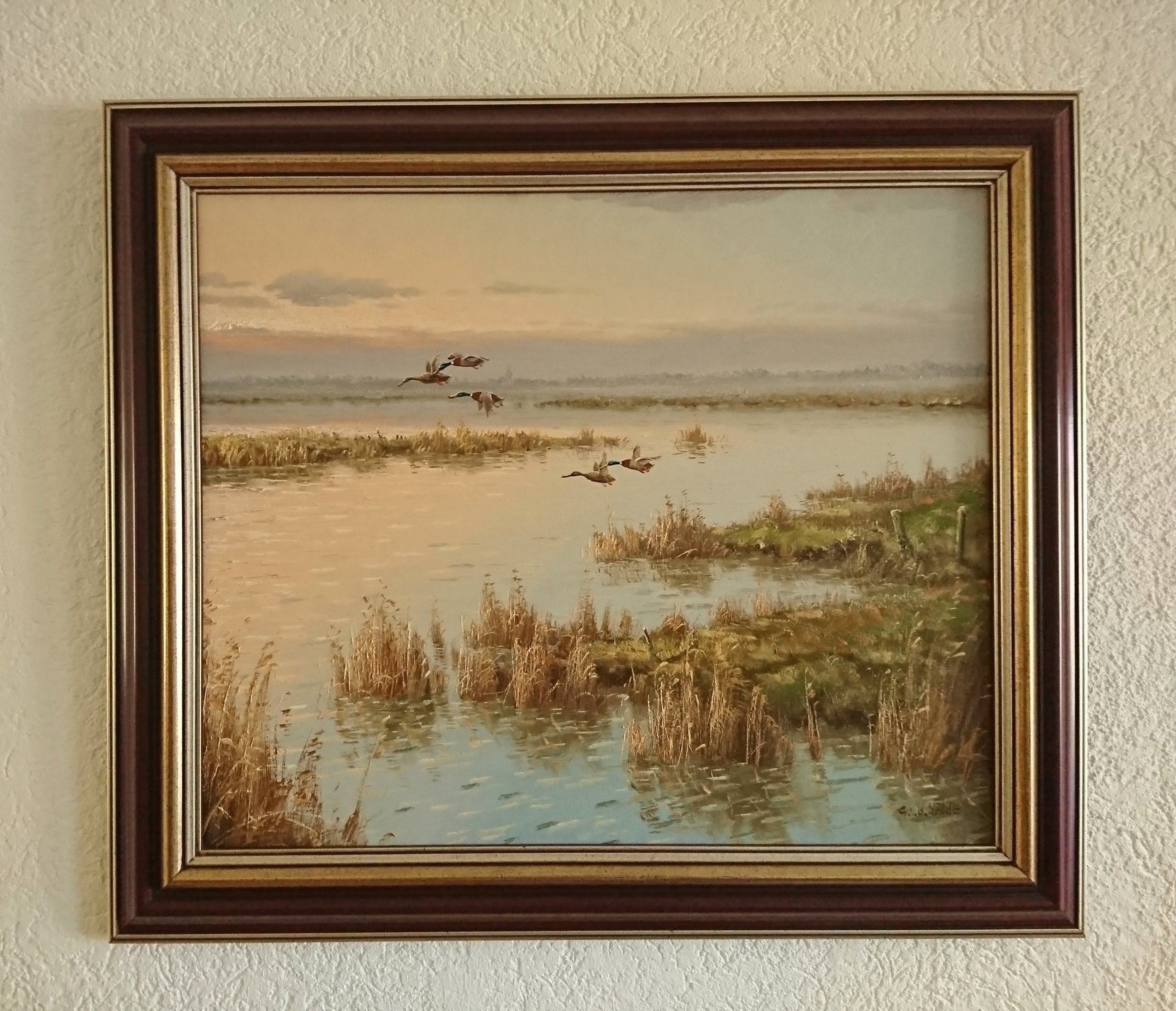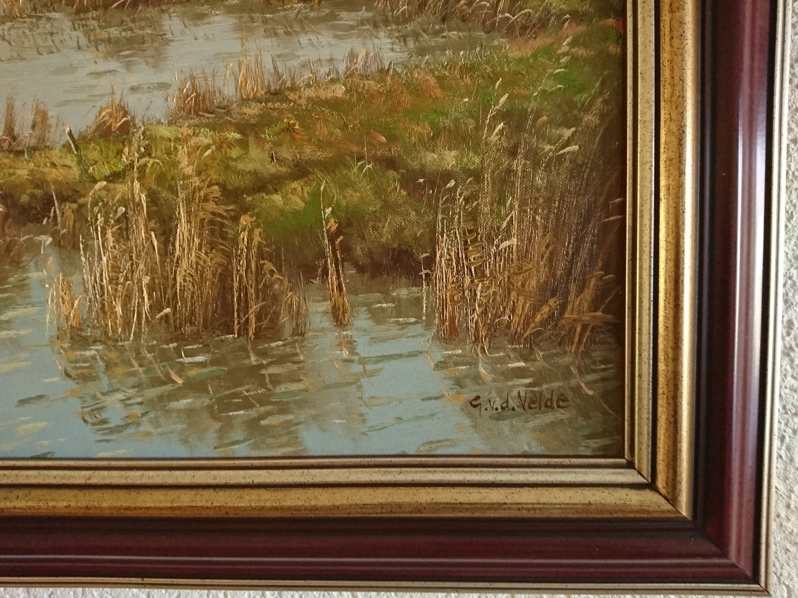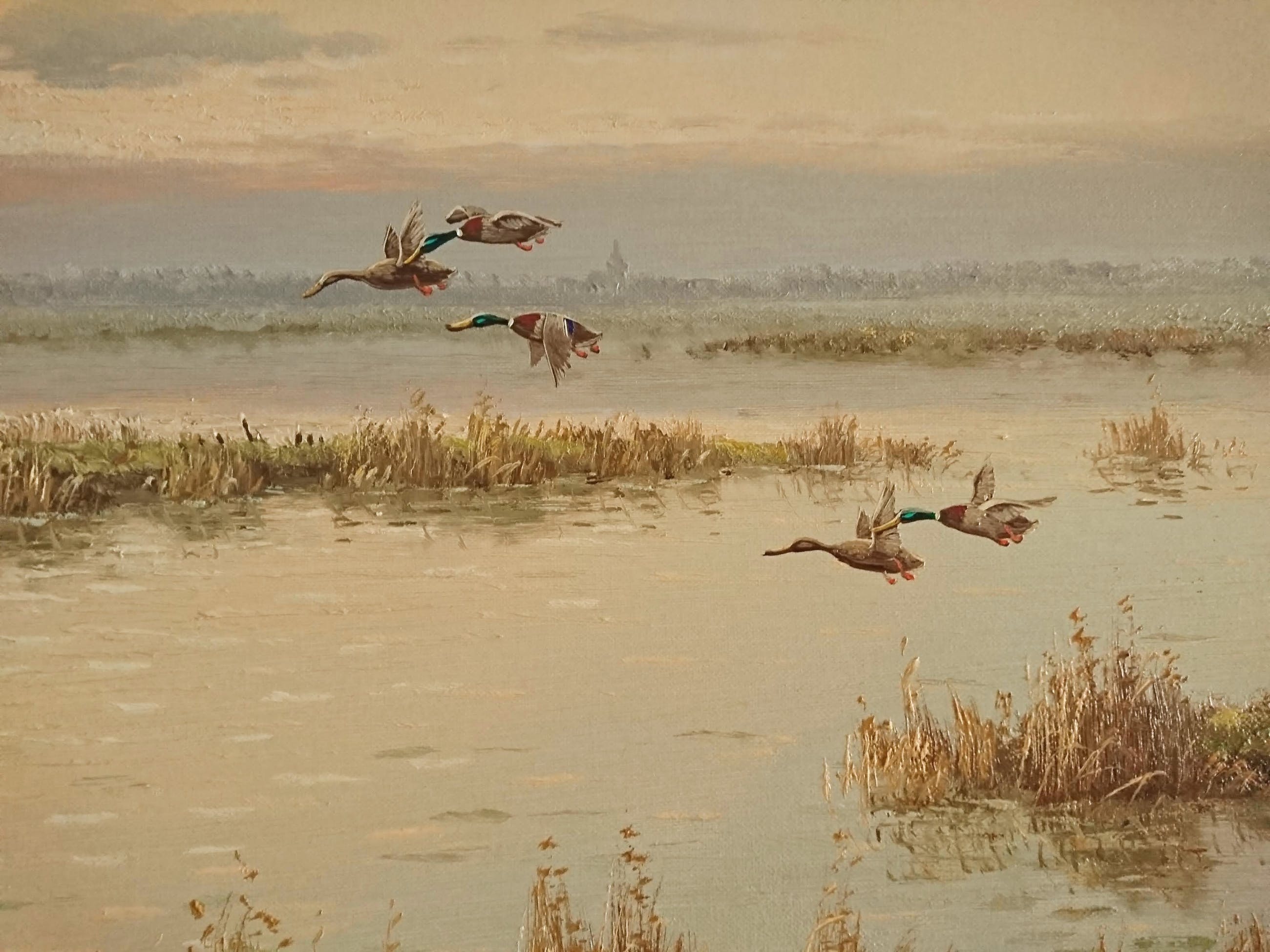 Een prachtige natuurvoorstelling van Gien van de Velde oftewel Gien Brouwer hij signeert willekeurig met beide namen. Het betere schilderwerk prachtige rietkragen en haarscherp geschilderde vliegende eenden deze zijn niet alleen decoratief maar geven het doek ook een optische illusie van diepte. Dit fraaie schilderij wordt goed verpakt aan u opgestuurd (binnen Nederland) desgewenst bent u ook welkom om het in Hattem op te komen halen